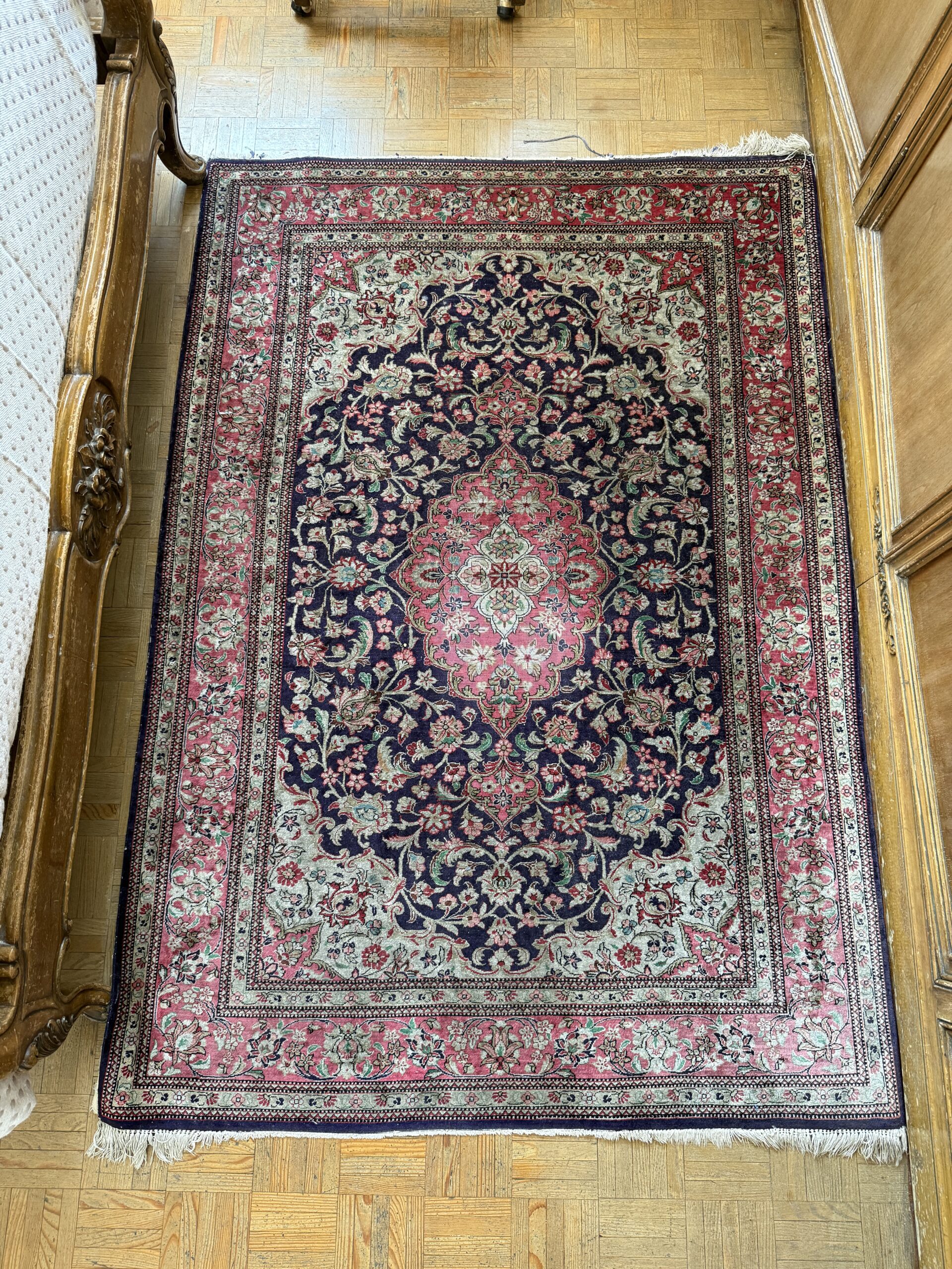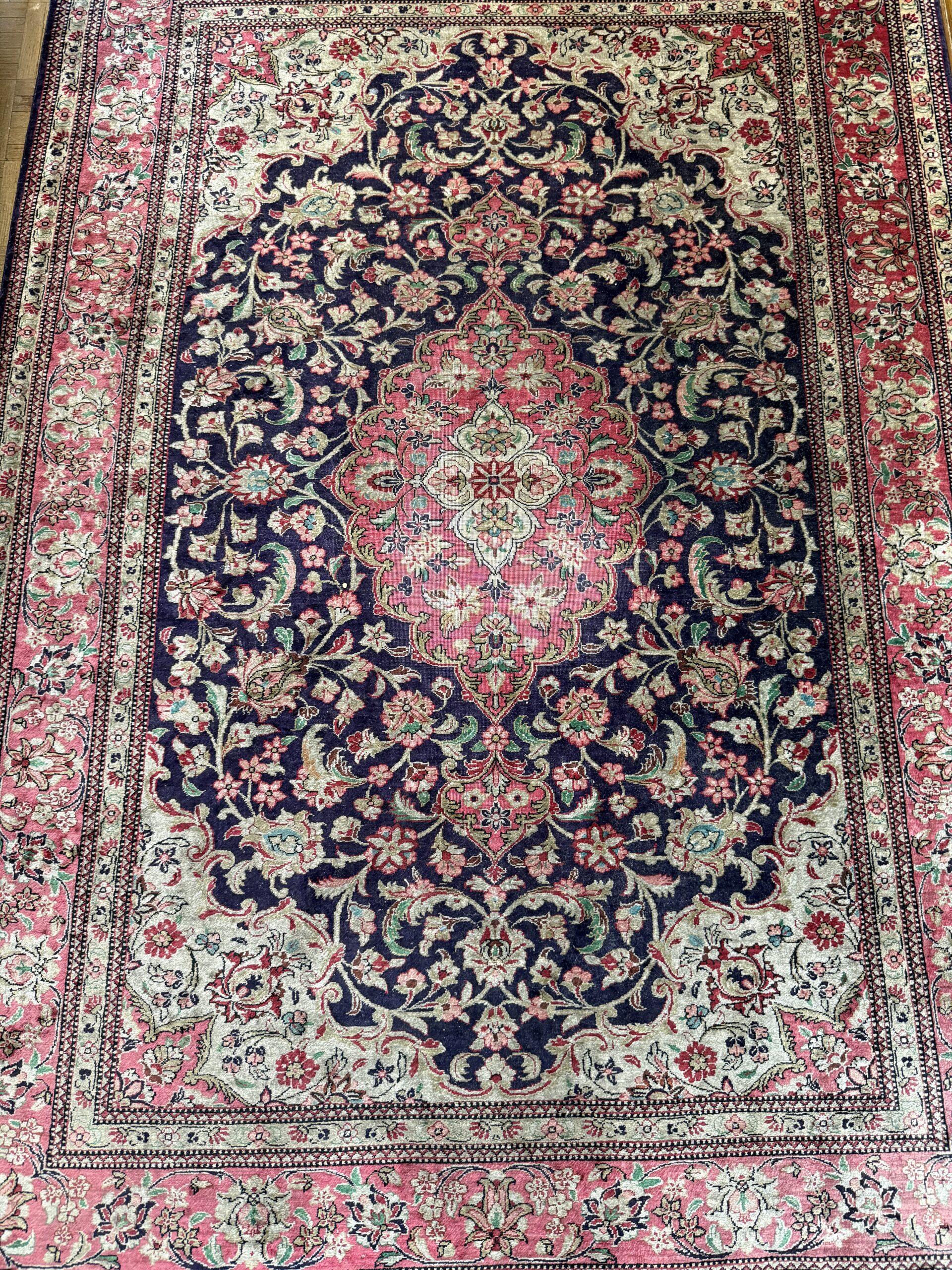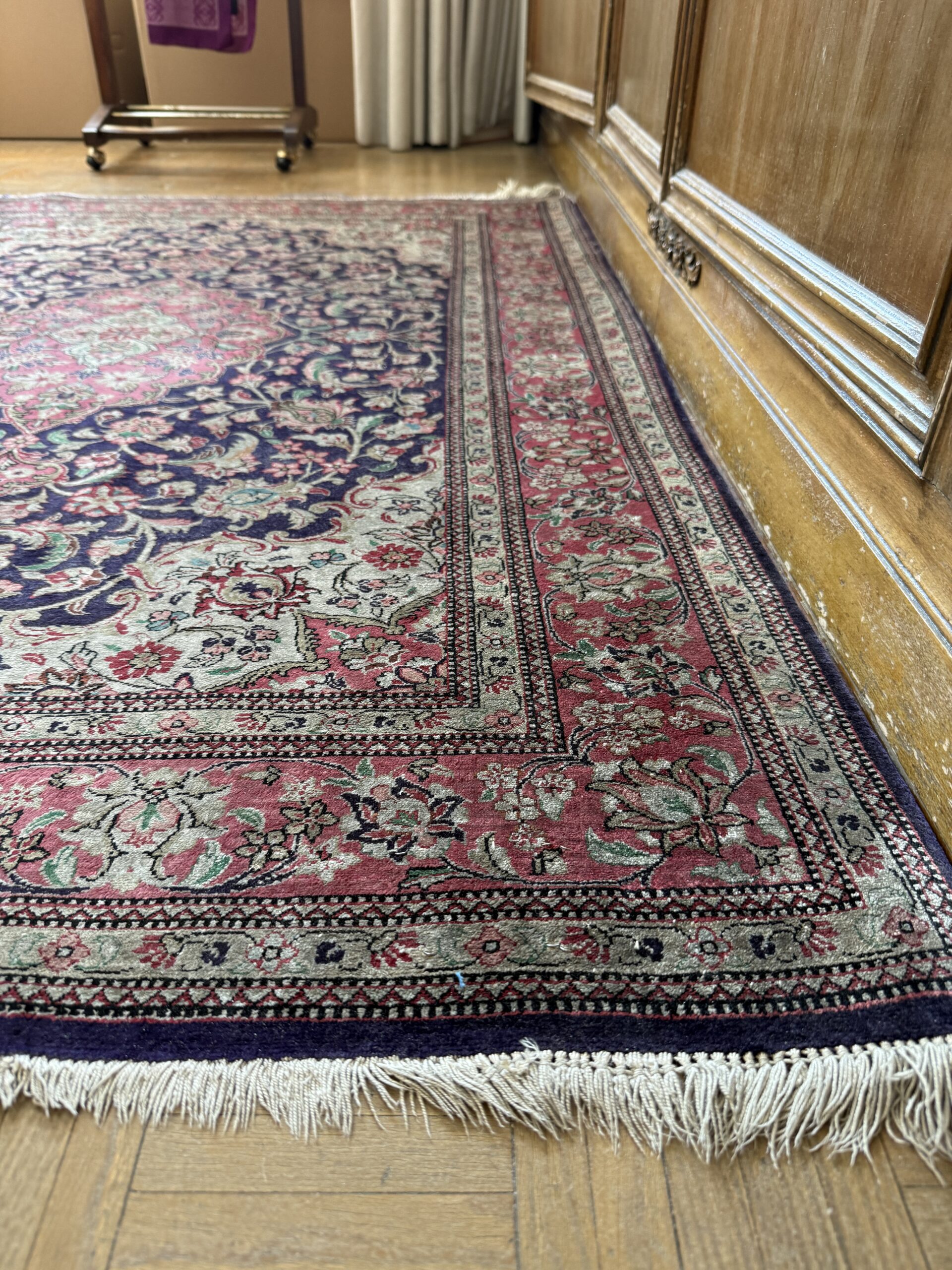 Alfombra de inspiración persa con un elegante diseño de medallón central rodeado de motivos florales detallados que aportan riqueza visual y equilibrio. La combinación de tonos granate, azul profundo y matices marfil crea una pieza cálida y sofisticada, ideal para vestir cualquier estancia. Su tamaño amplio la convierte en protagonista perfecta para salones, dormitorios o zonas de paso. El dibujo ornamental, cuidadosamente distribuido, aporta carácter y una estética atemporal. Los acabados y bordes bien definidos refuerzan su presencia y durabilidad.