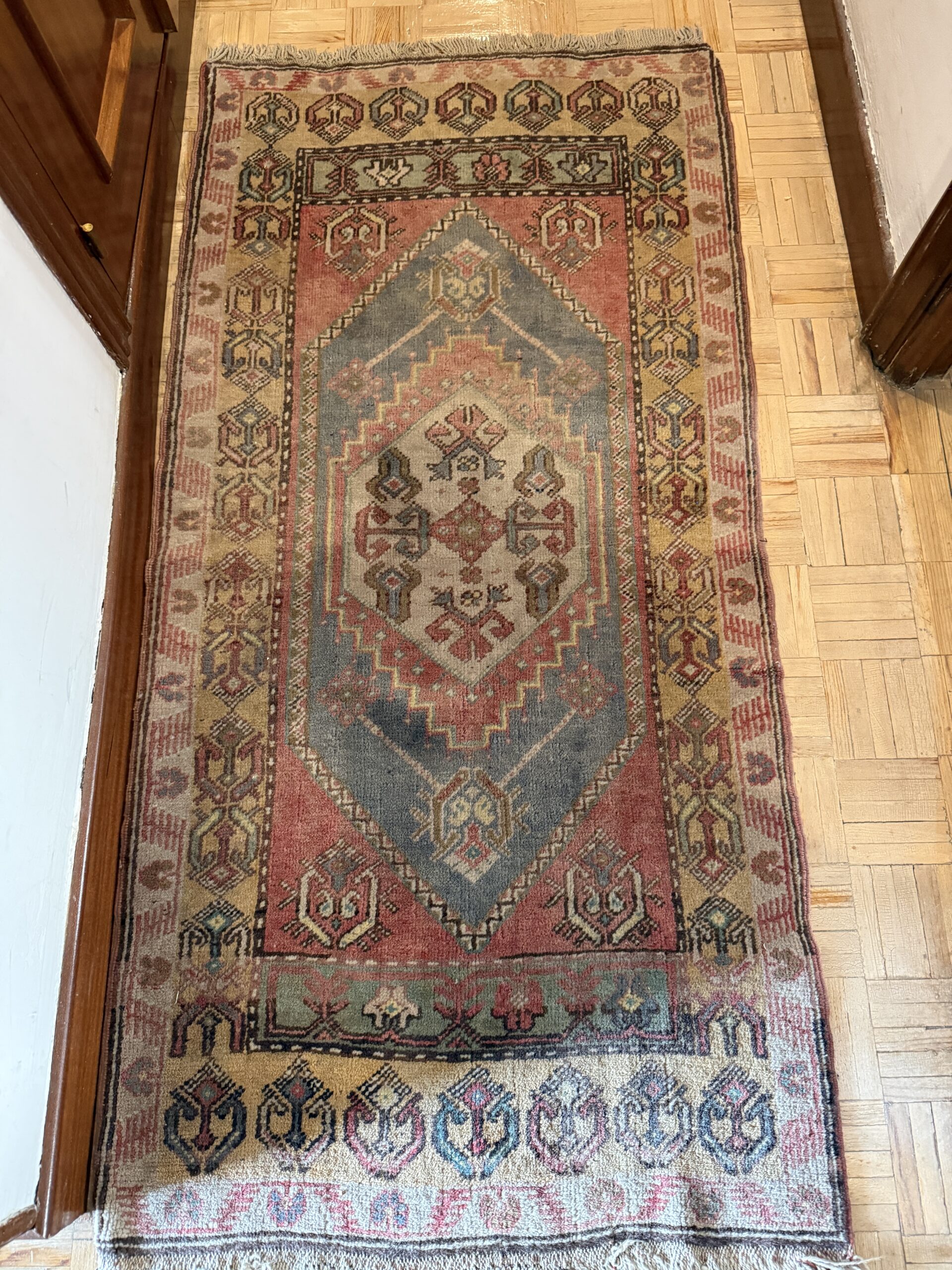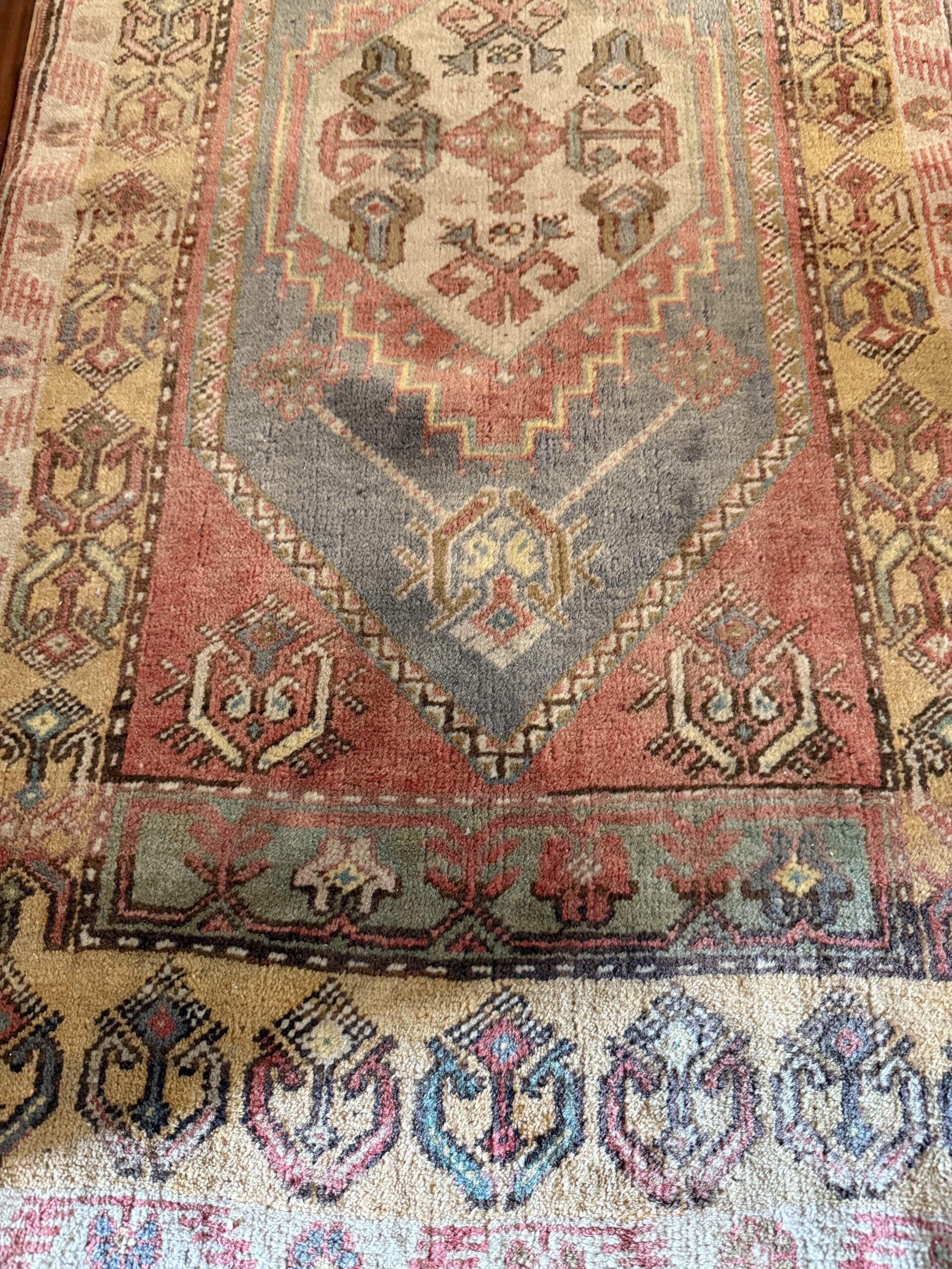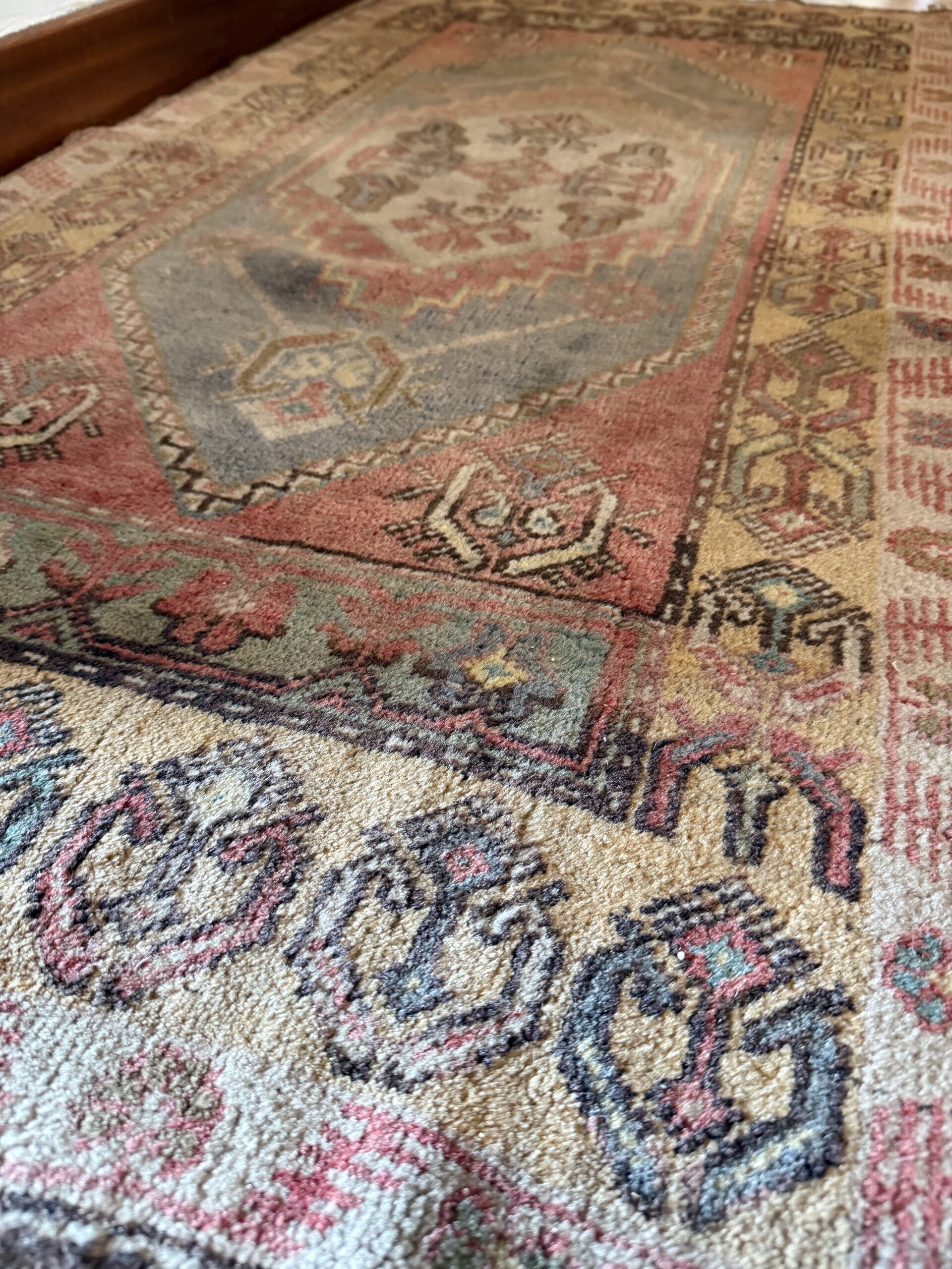 Alfombra de diseño clásico con medallón central y paleta de tonos suavizados por el uso. Una pieza con carácter que aporta calidez y equilibrio visual al espacio.