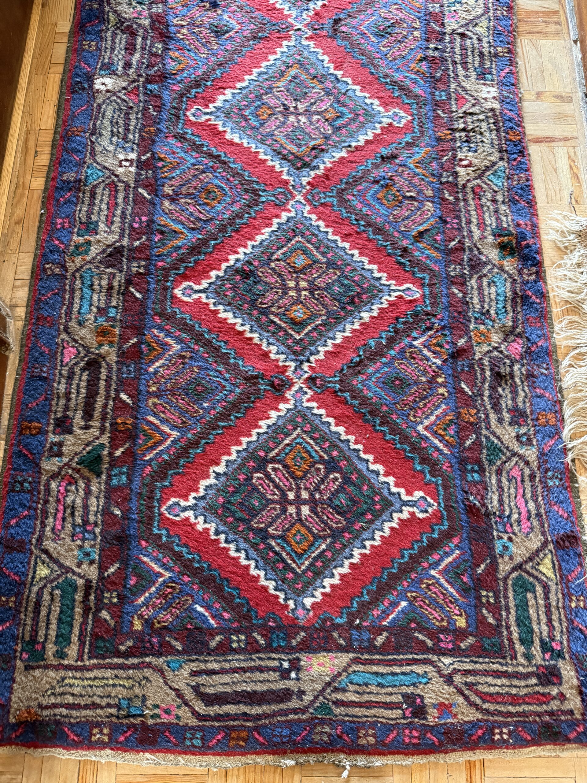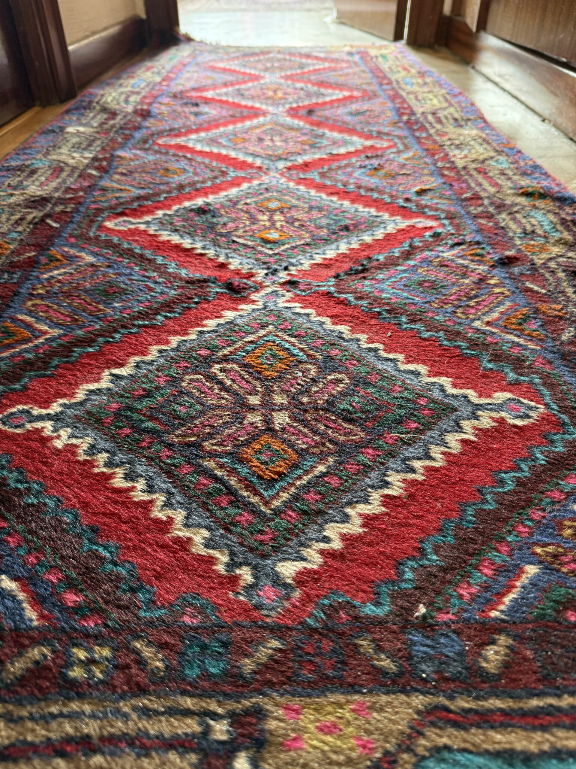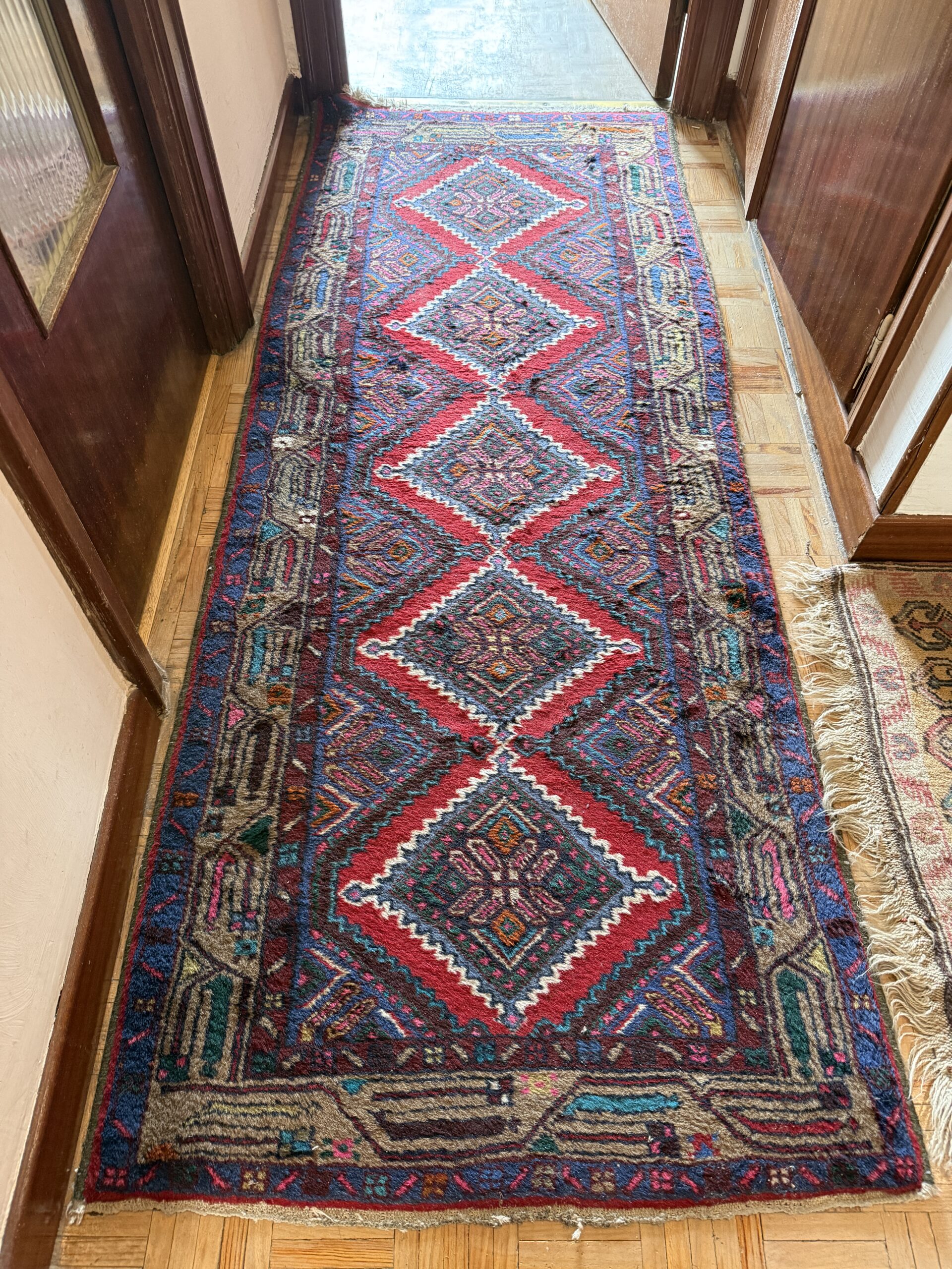 Alfombra de pasillo con diseño geométrico de inspiración persa, donde predominan los tonos rojos y azules. Una pieza con carácter que aporta calidez y ritmo visual a zonas de paso.