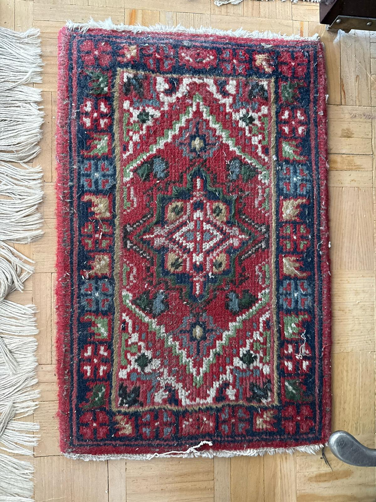Alfombra de estilo oriental en formato pequeño, con diseño tradicional de medallón central y cenefa decorativa en tonos rojos combinados con azul oscuro y detalles en verde y beige.