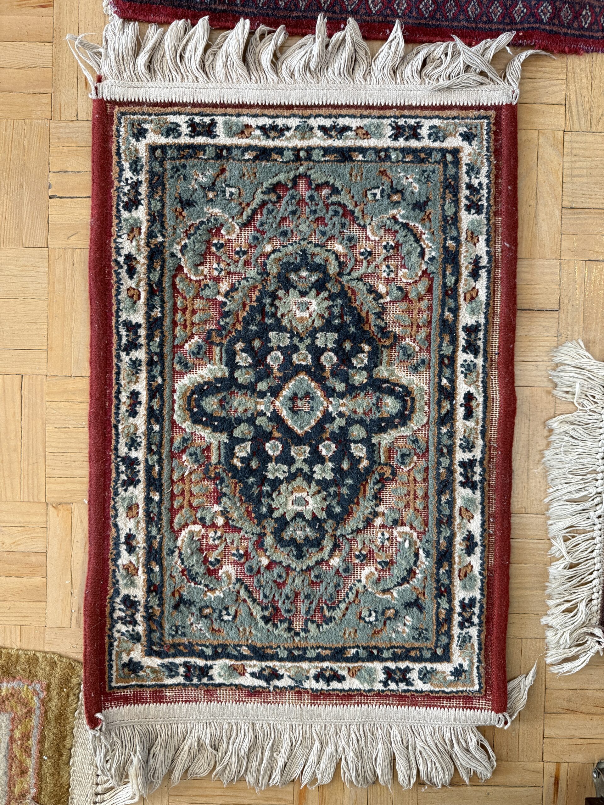 Alfombra de pequeño formato con dibujo clásico de inspiración oriental, con un diseño más trabajado y ornamental que las típicas piezas pequeñas.