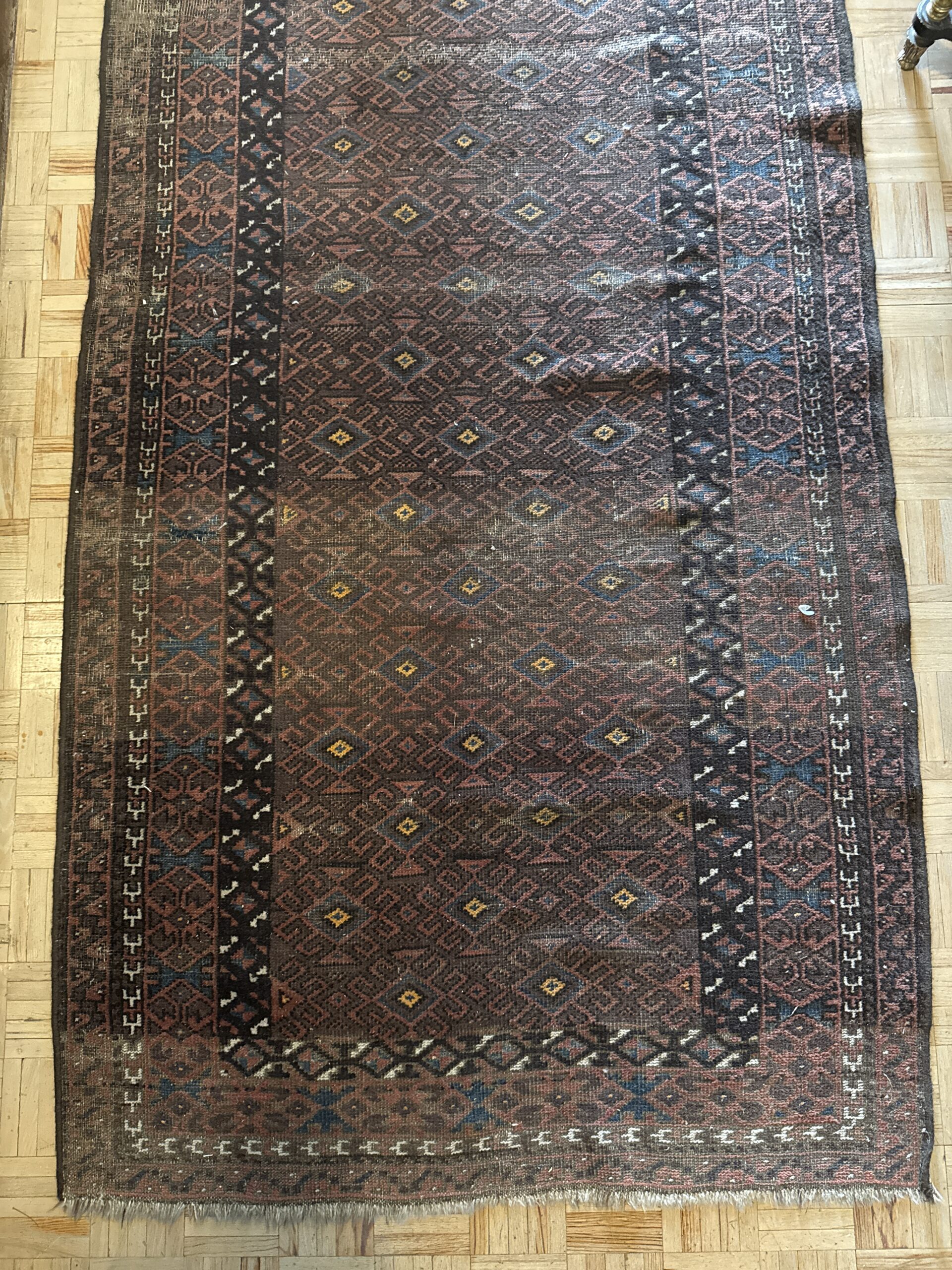 Alfombra con diseño geométrico repetitivo en una paleta de tonos oscuros con acentos en contraste. Una pieza con carácter que aporta profundidad y calidez al espacio.