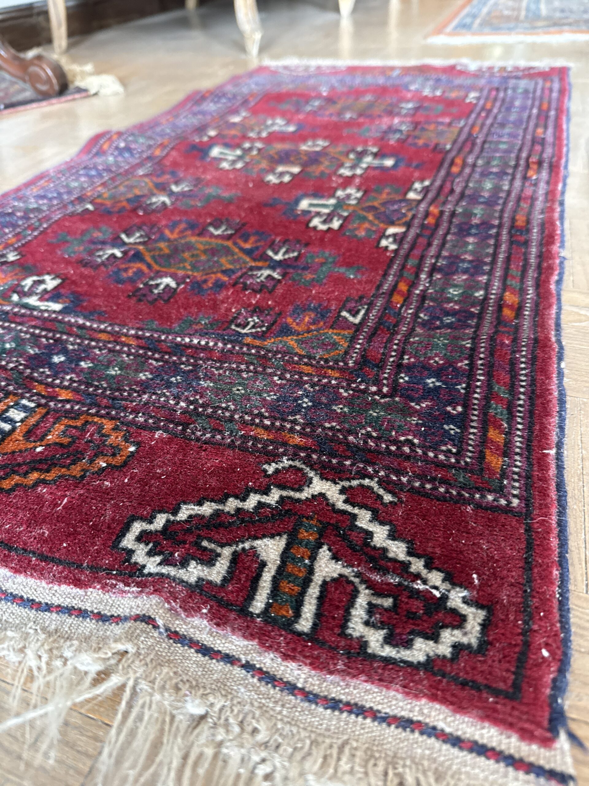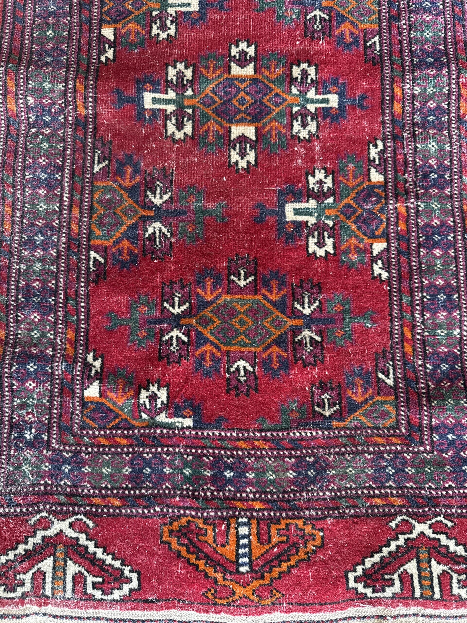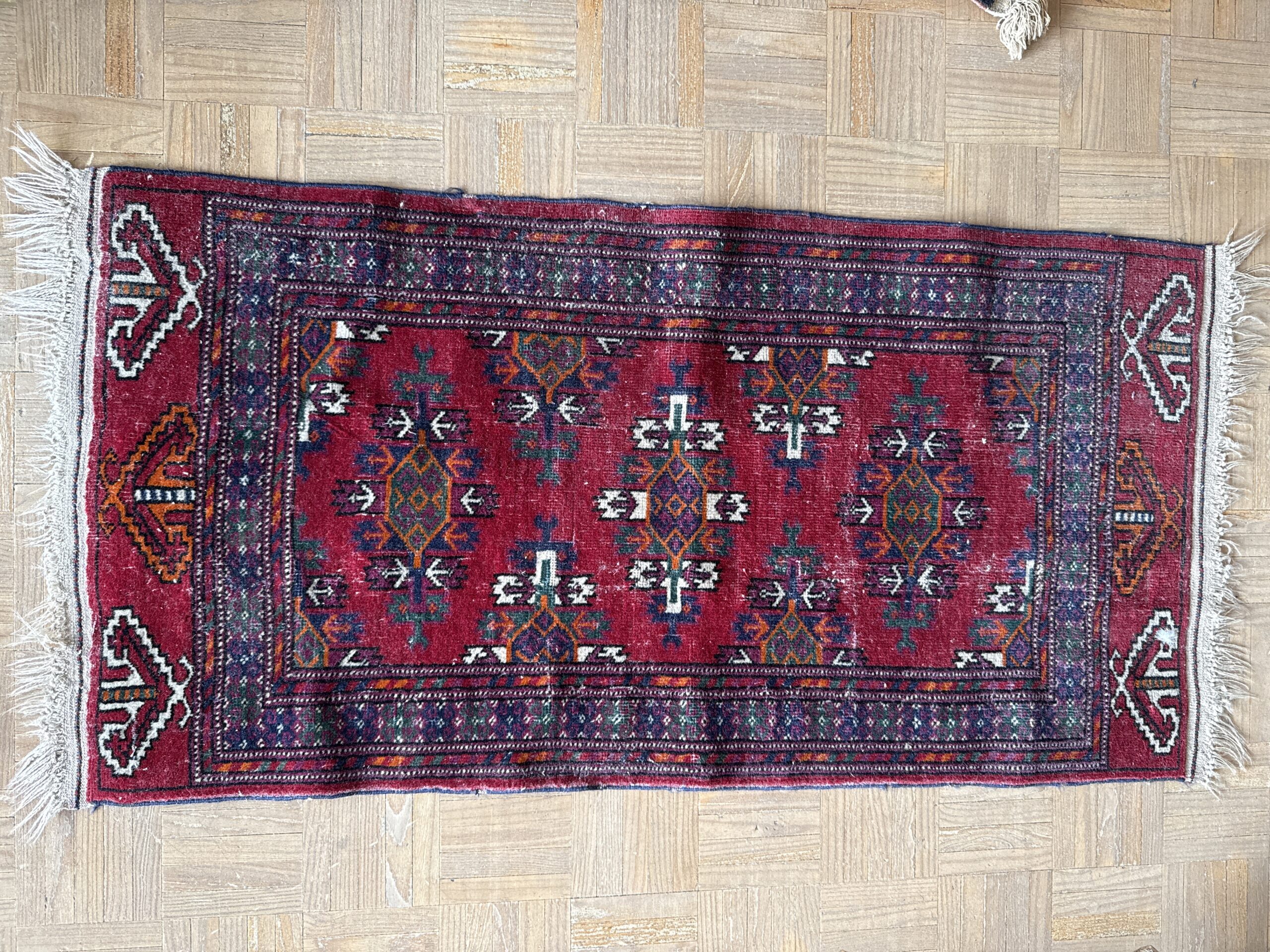 Alfombra de estilo oriental en formato pequeño, con base en tonos rojos intensos y motivos geométricos tradicionales.