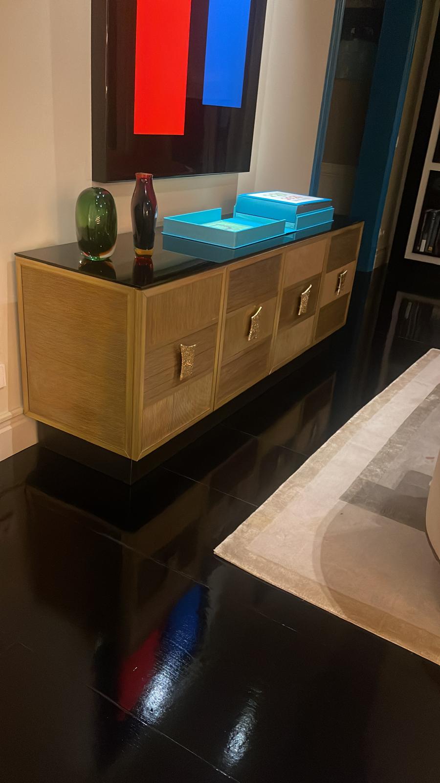 Aparador de madera con tapa de cristal negro y tiradores dorados