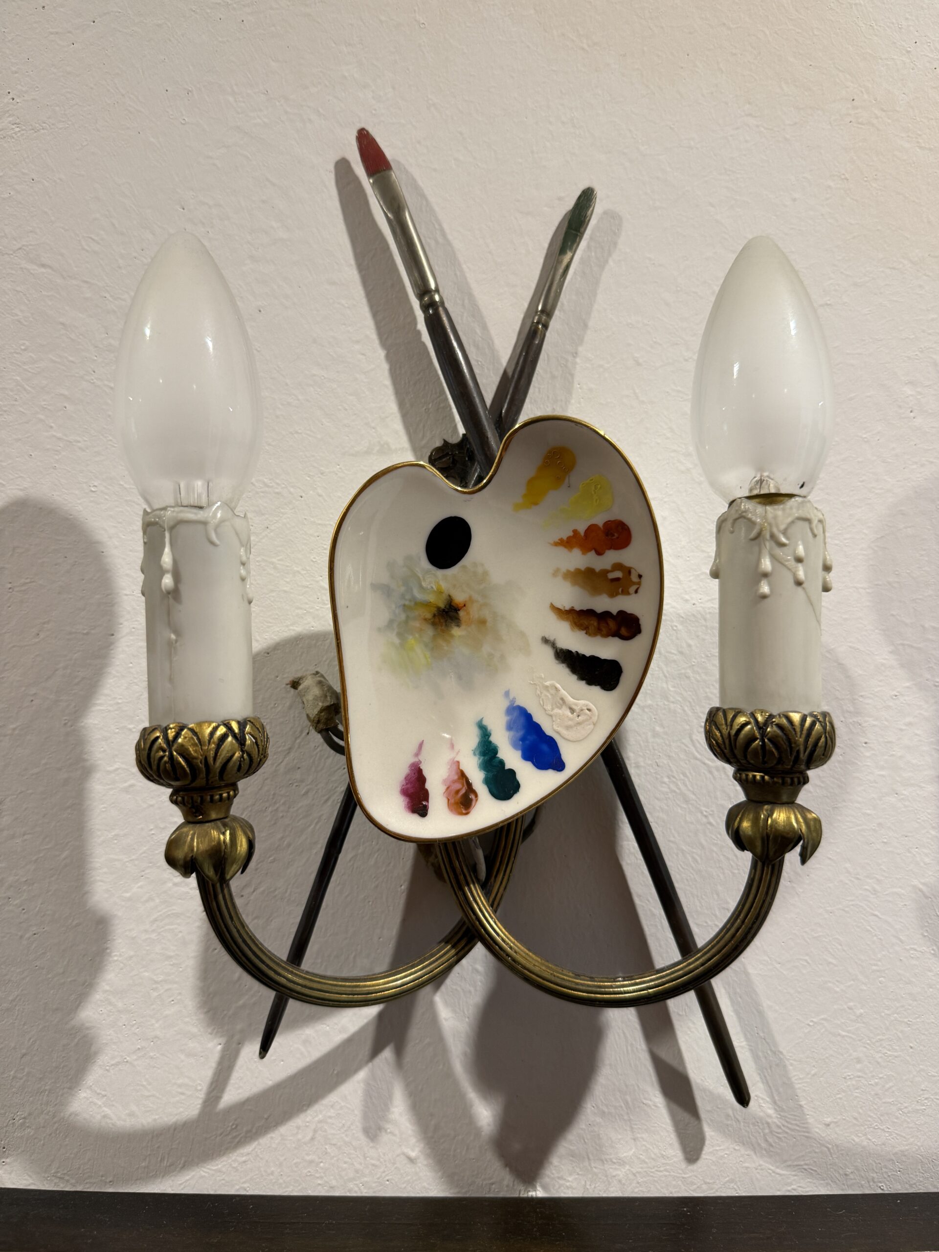 Pieza decorativa de inspiración artística que combina dos puntos de luz con una composición central de paleta y pinceles, aportando un toque original y creativo a cualquier espacio.