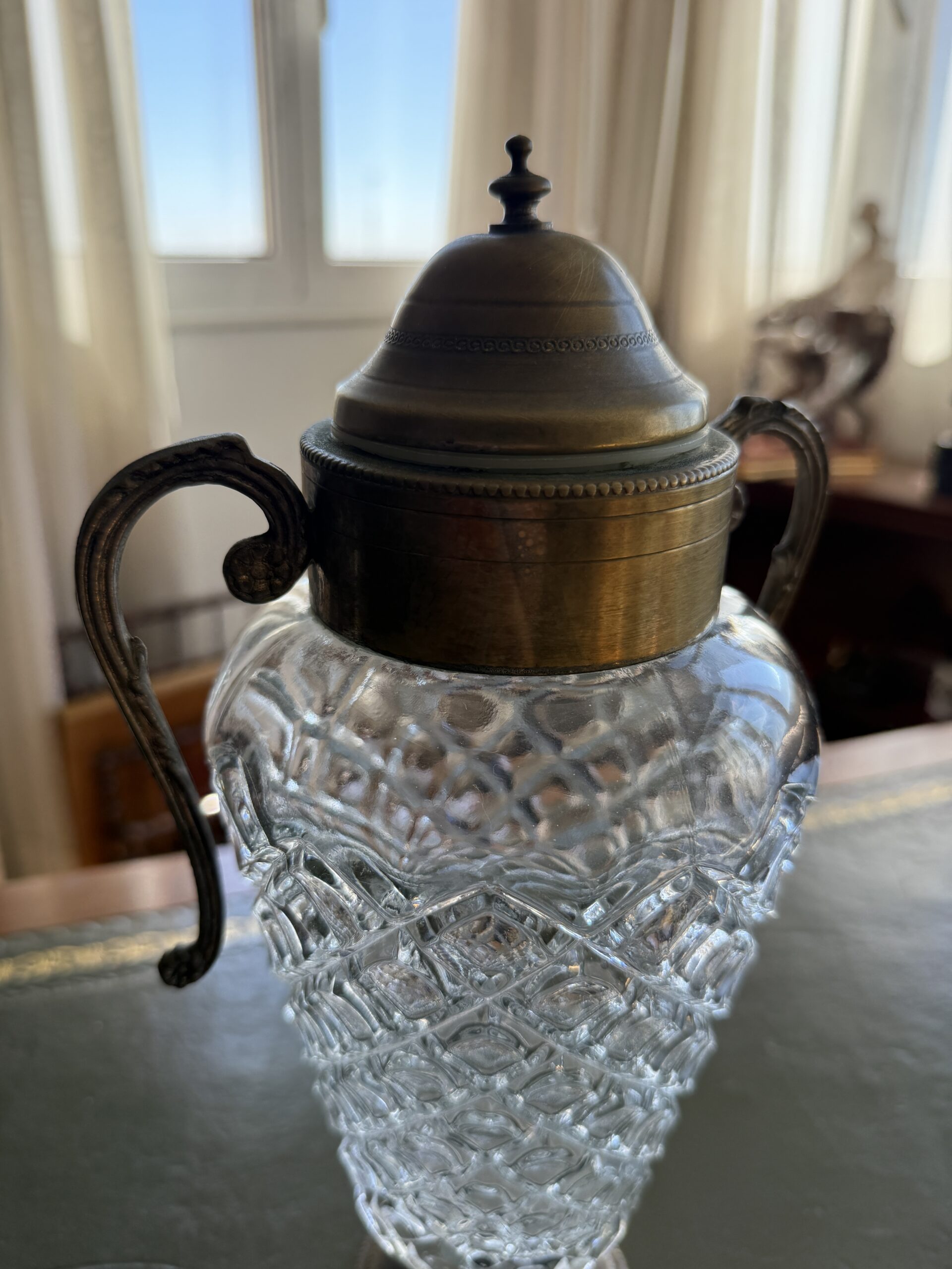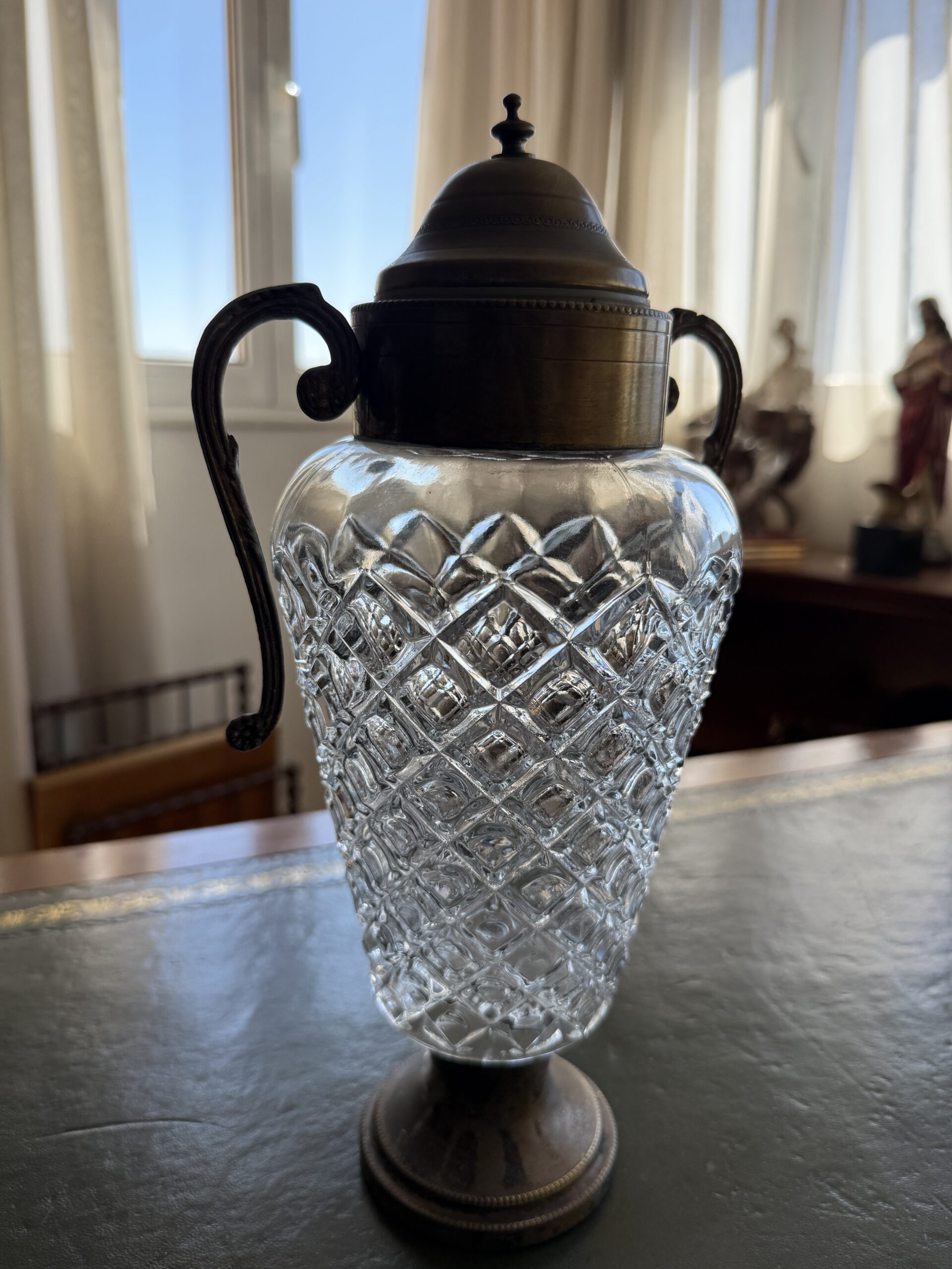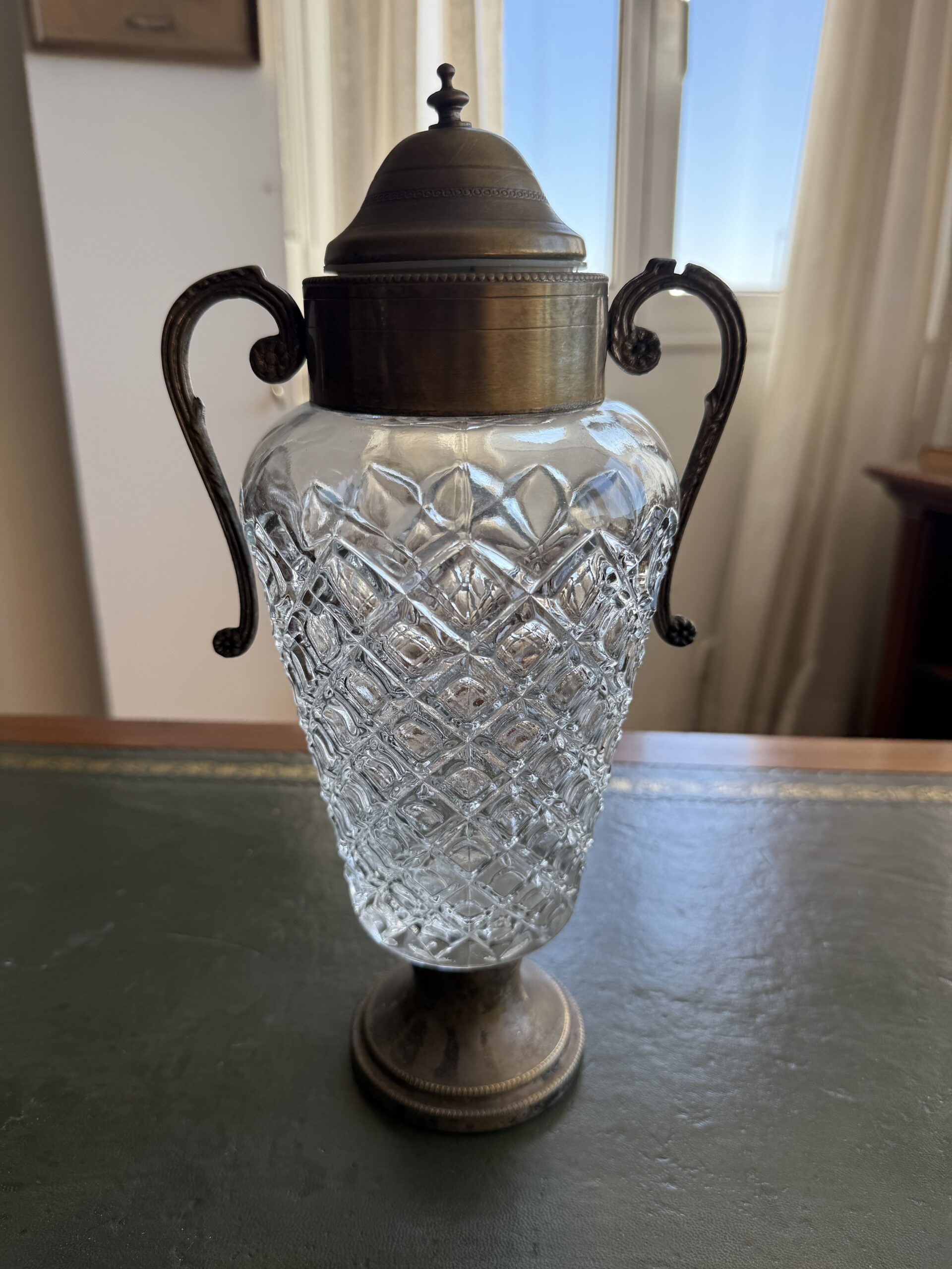 Sofisticada bombonera de cristal tallado con elegante patrón geométrico que captura la luz y realza su presencia en cualquier espacio. La tapa y estructura metálica, con asas curvadas y acabado envejecido, aportan un aire clásico y distinguido. Su diseño equilibrado combina transparencia y carácter, convirtiéndola en una pieza decorativa tan funcional como estética. Ideal para presentar dulces o como elemento ornamental en vitrinas y mesas auxiliares.