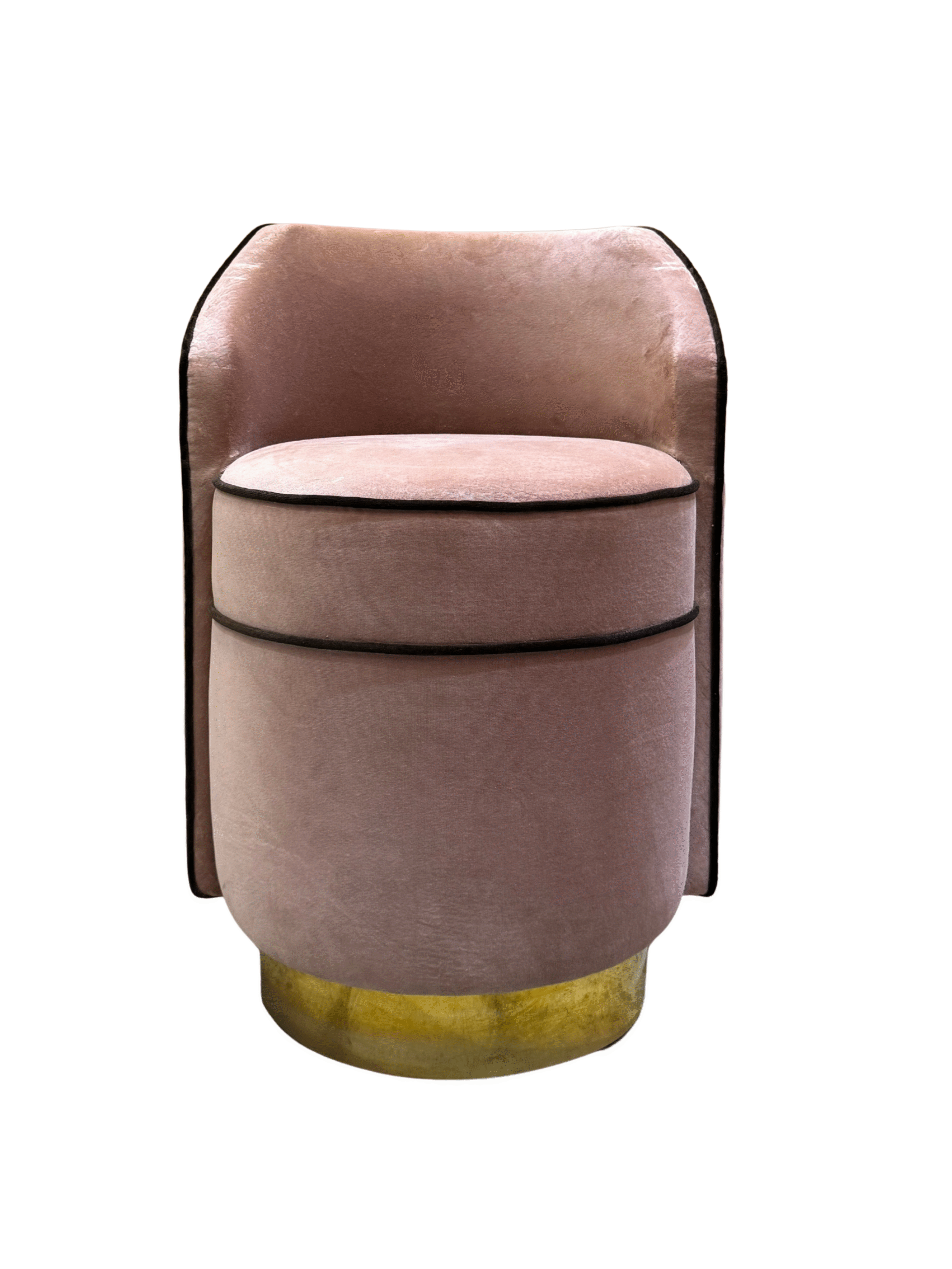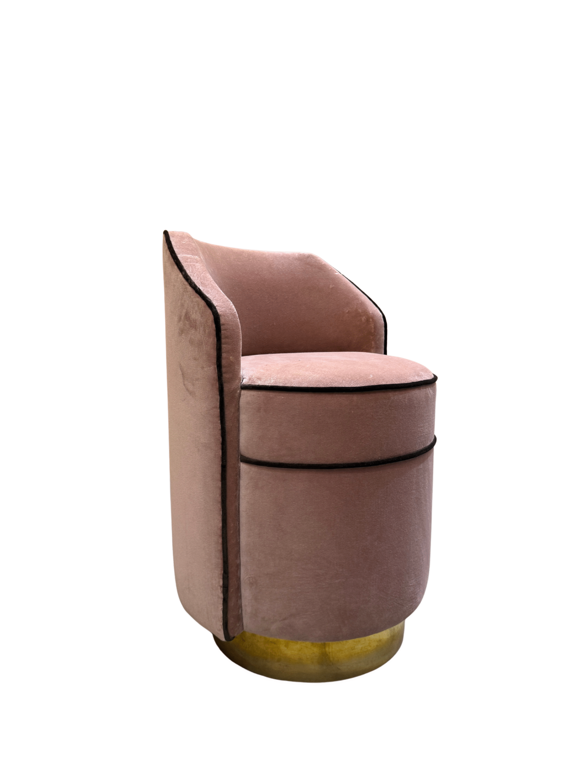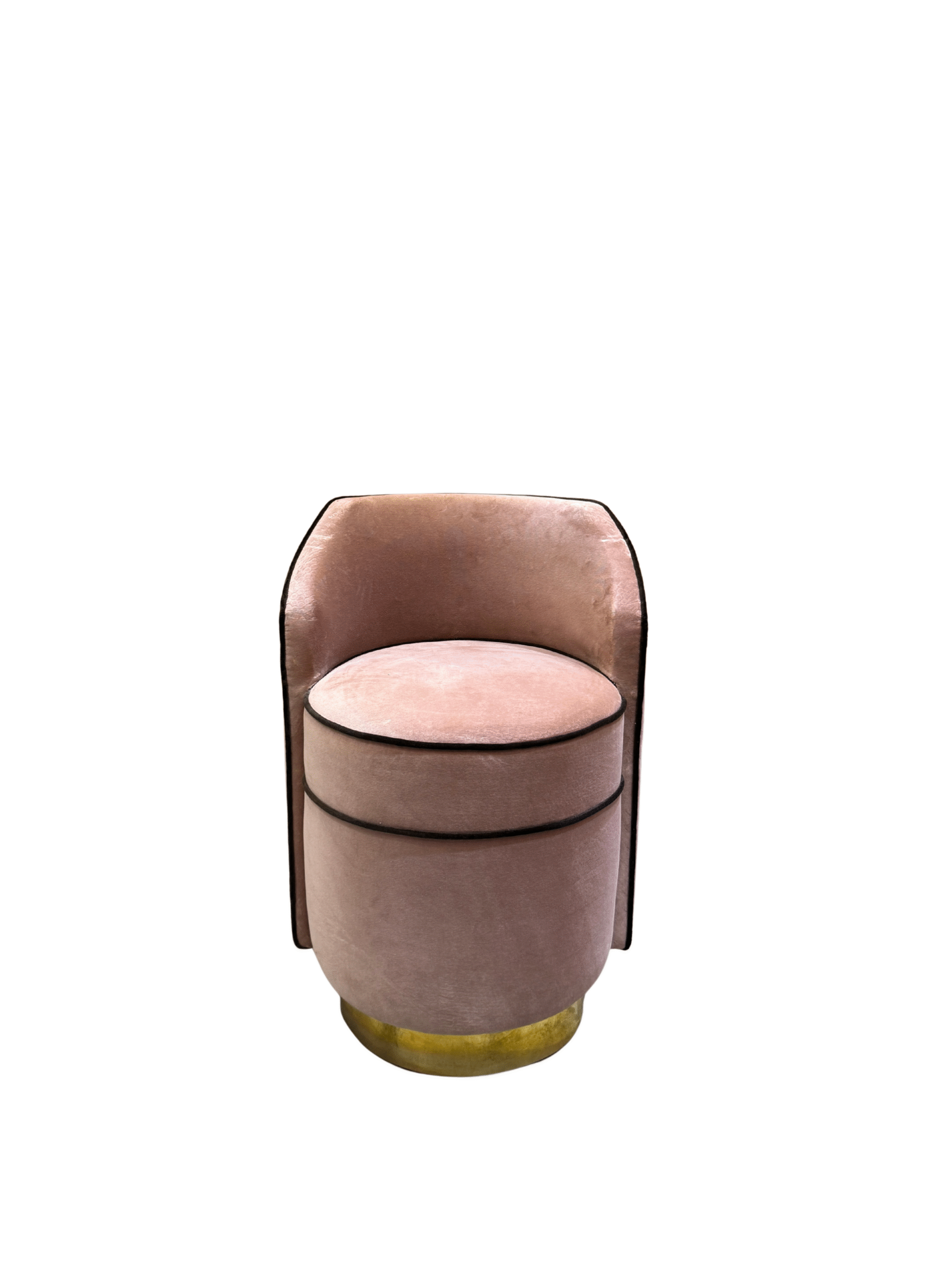 Butaca auxiliar de líneas curvas, tapizada en terciopelo rosa empolvado y rematada con vivos en contraste. Su diseño envolvente y su base dorada aportan un toque decorativo y sofisticado, ideal para completar un dormitorio, vestidor, salón o rincón de lectura.