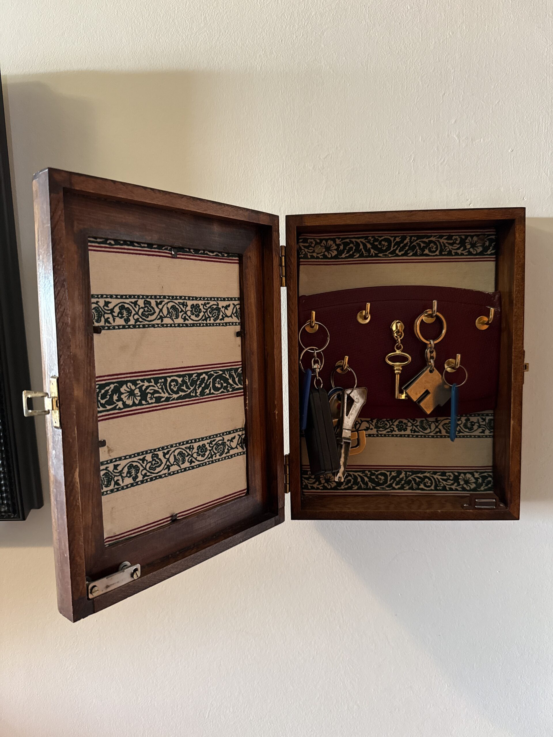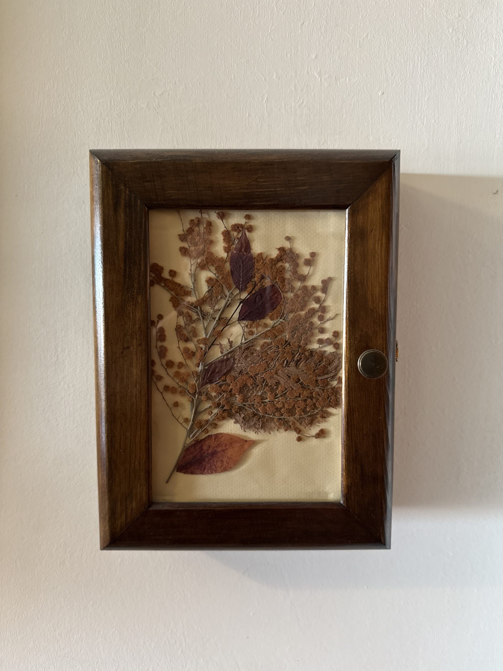 Caja de pared en madera con puerta decorativa de composición vegetal prensada. Interior con ganchos para llaves, combinando funcionalidad y un detalle decorativo discreto y original.
