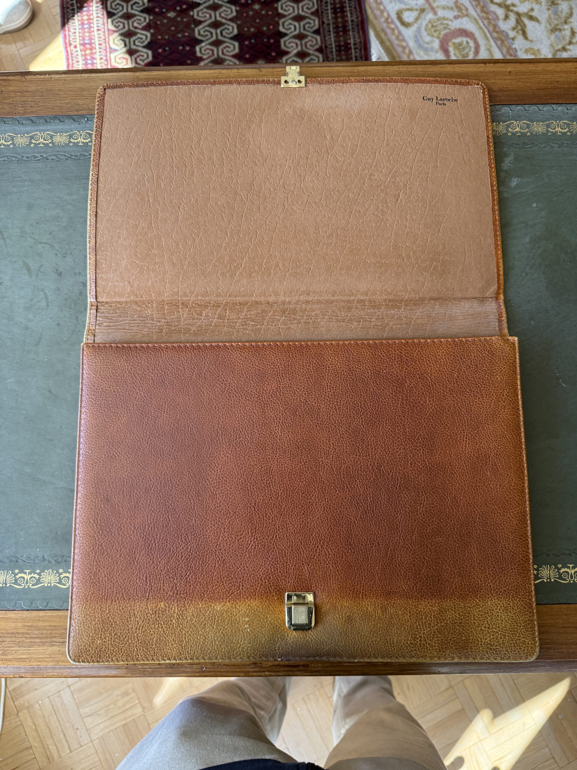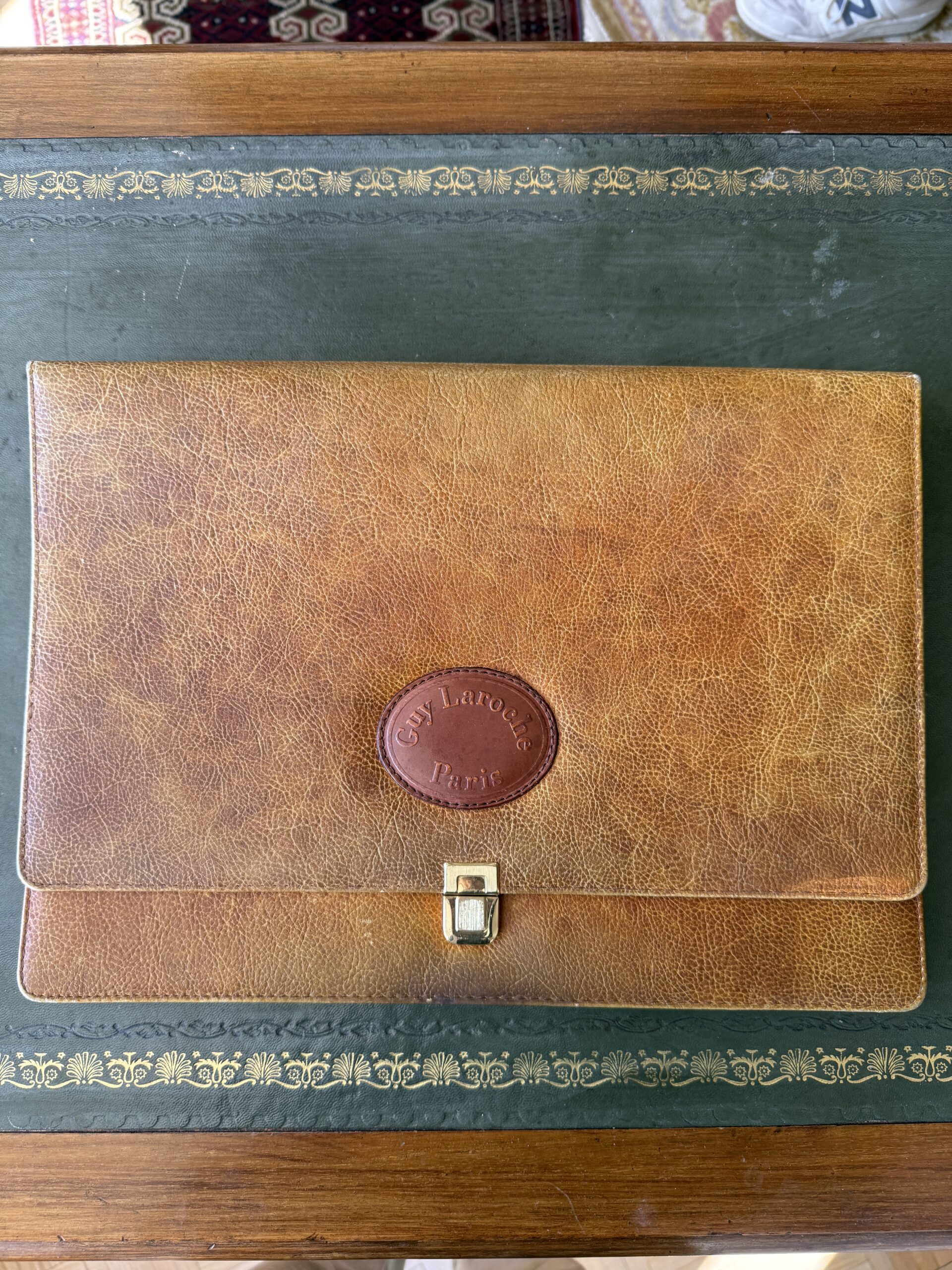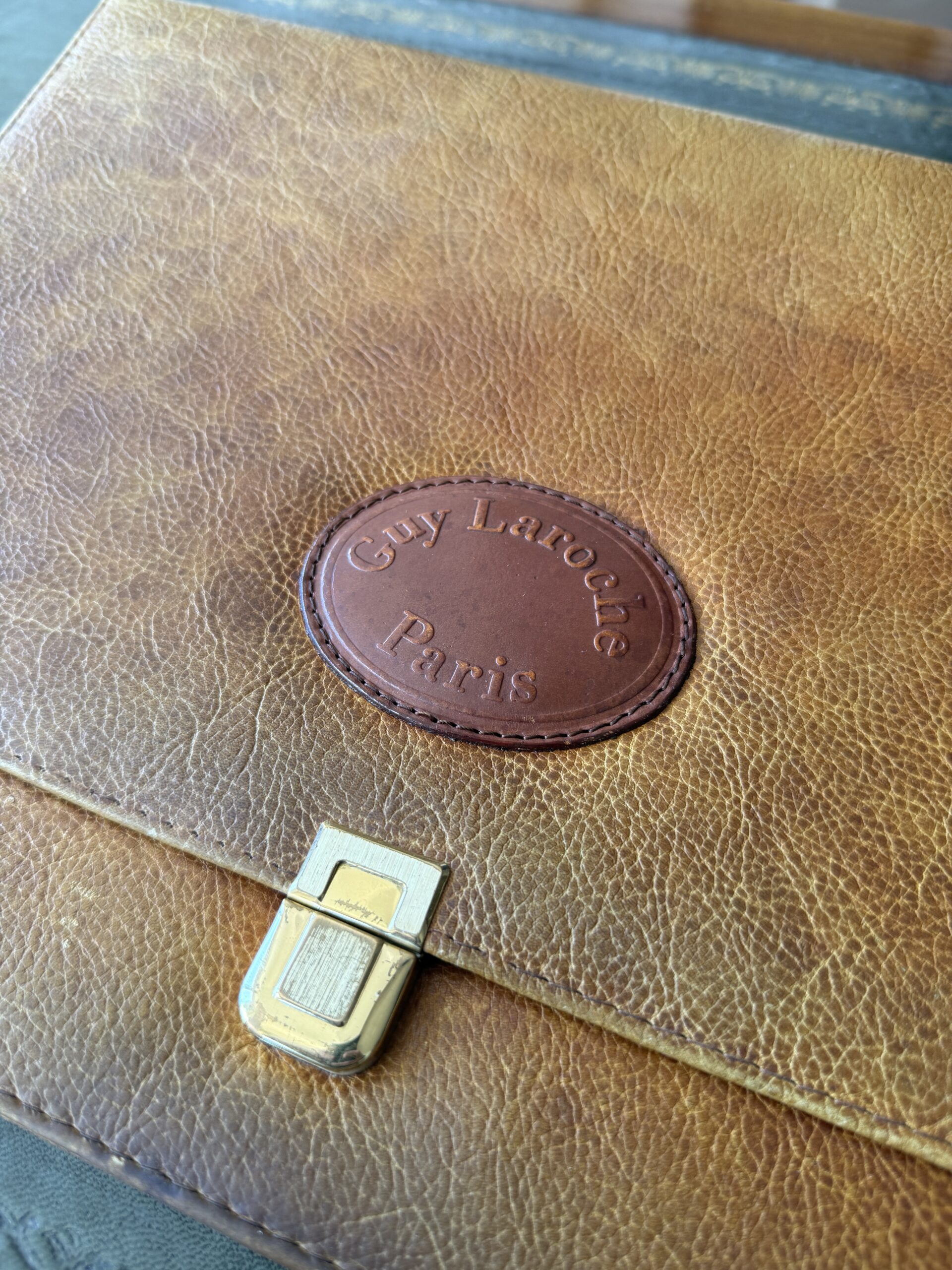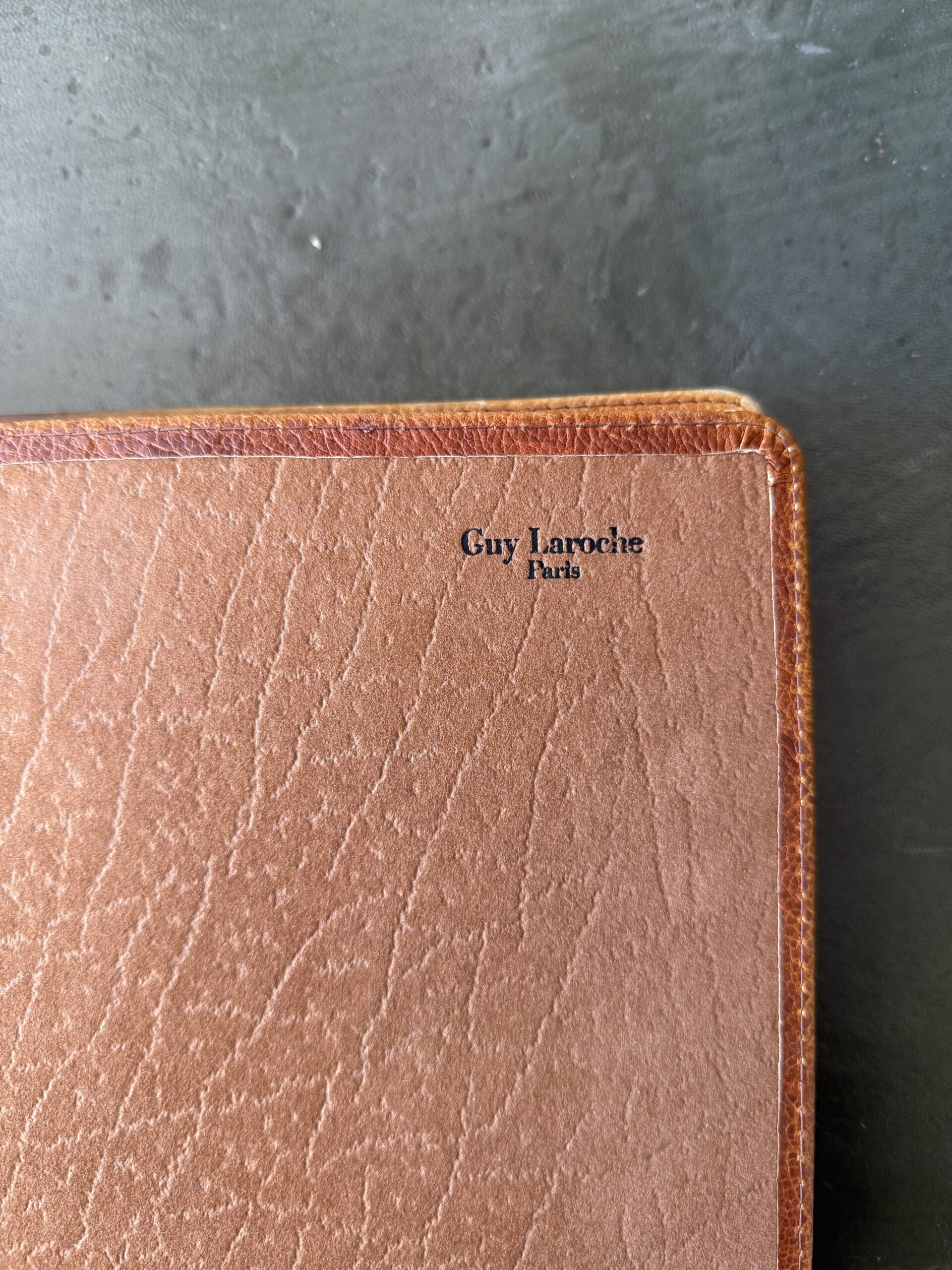 Elegante carpeta portadocumentos en piel natural firmada por Guy Laroche Paris, con un acabado cálido y una textura rica que refleja su carácter clásico. Su diseño sobrio y refinado se complementa con un cierre metálico que aporta funcionalidad y seguridad. La pieza presenta una pátina auténtica que realza su estilo vintage y su personalidad única. El emblema central grabado añade distinción y autenticidad a la composición.