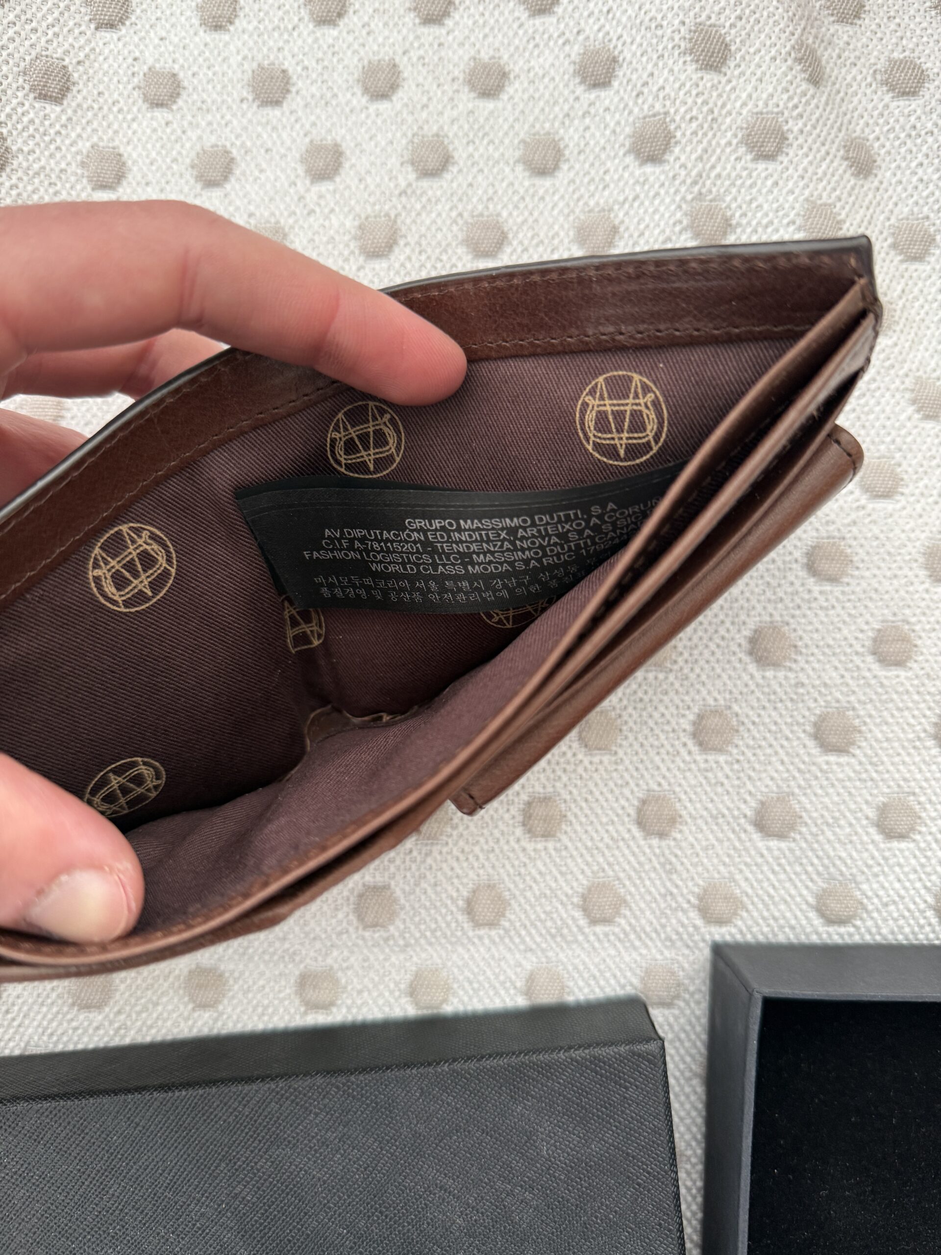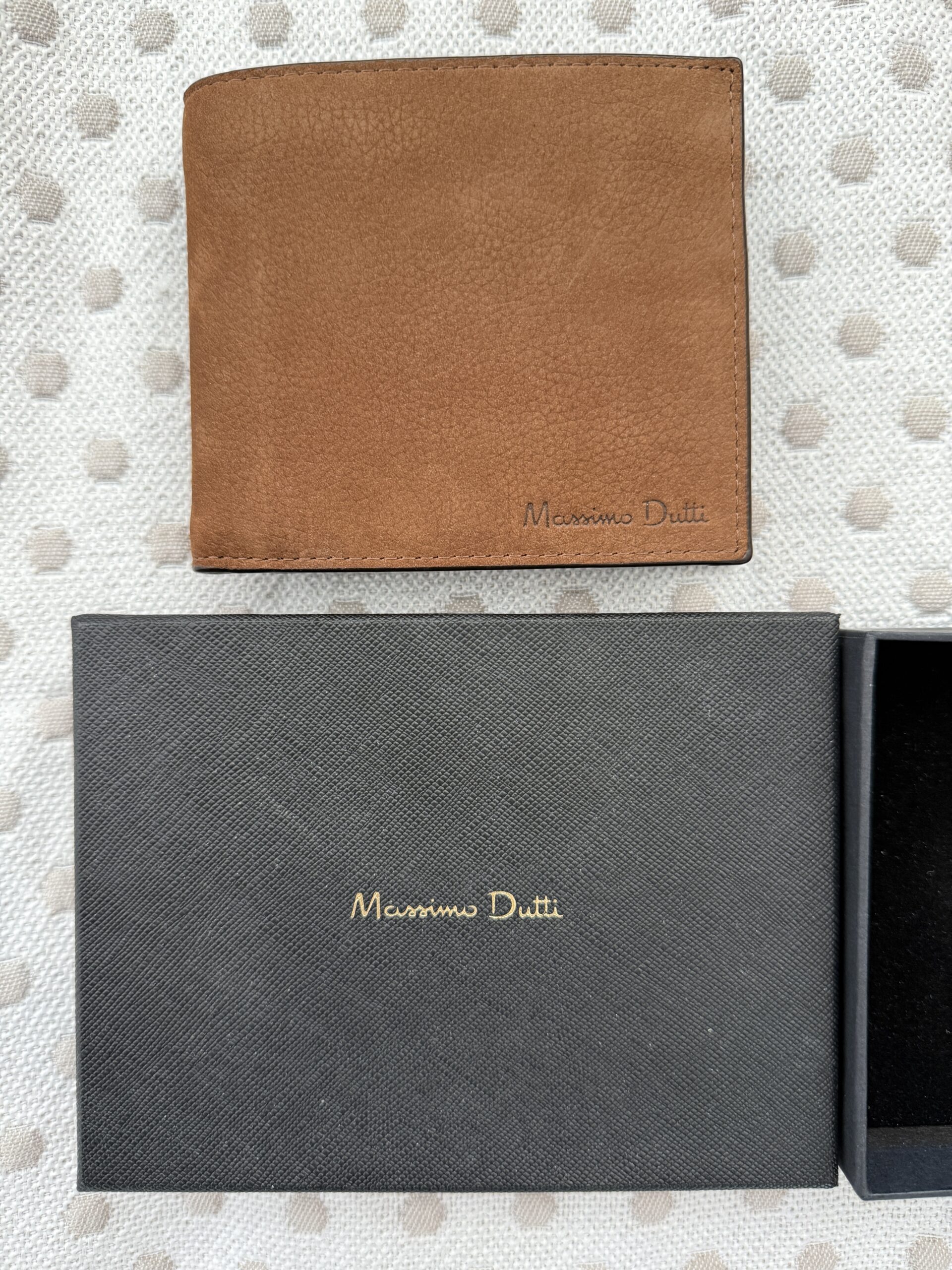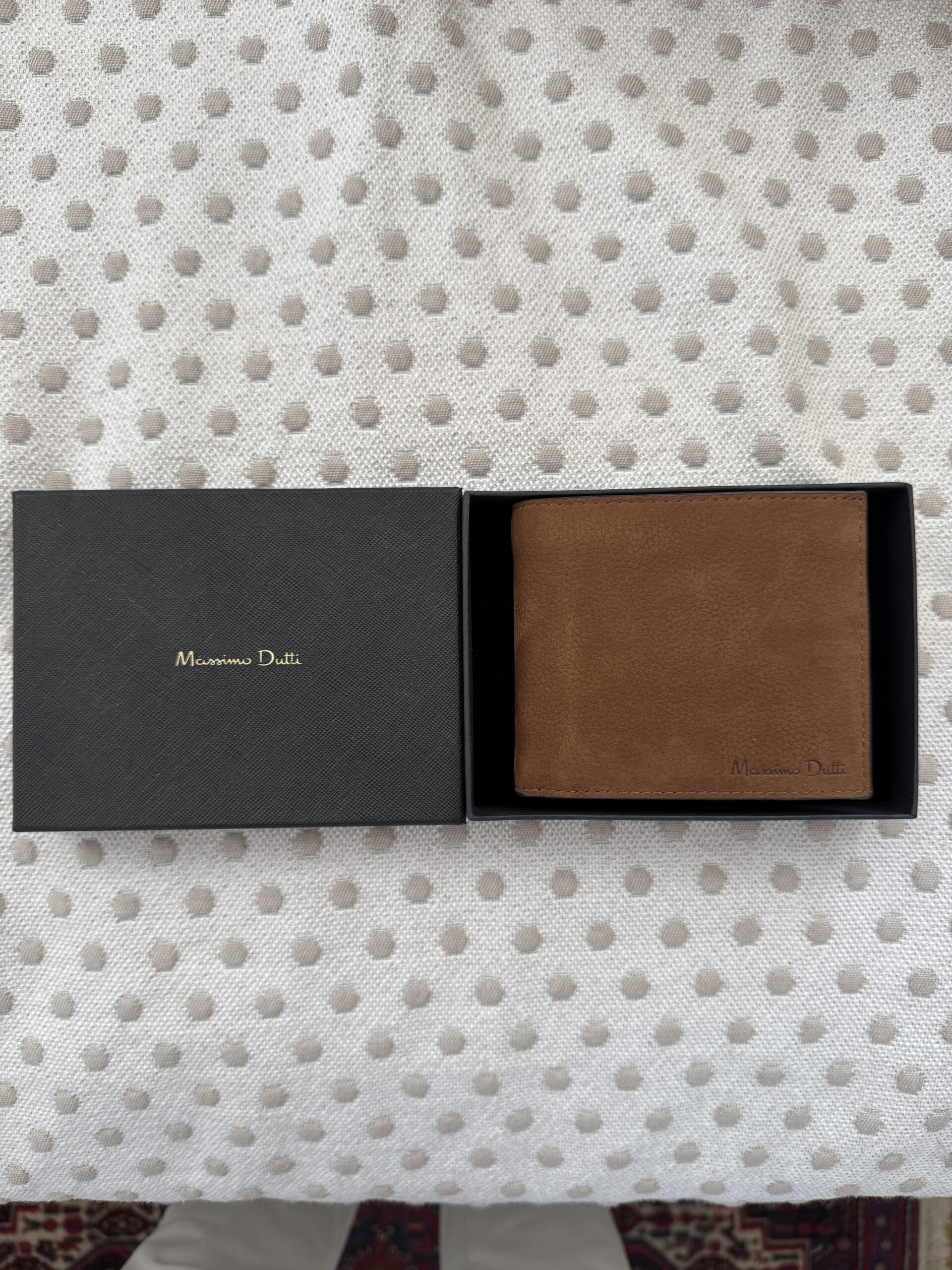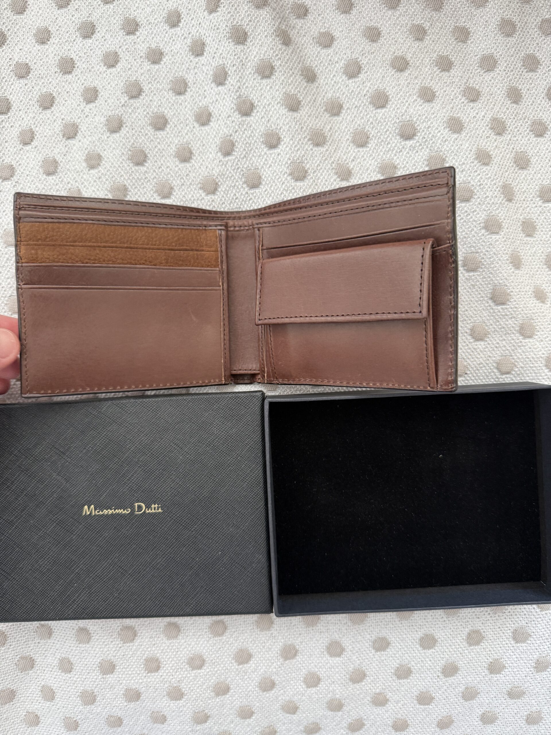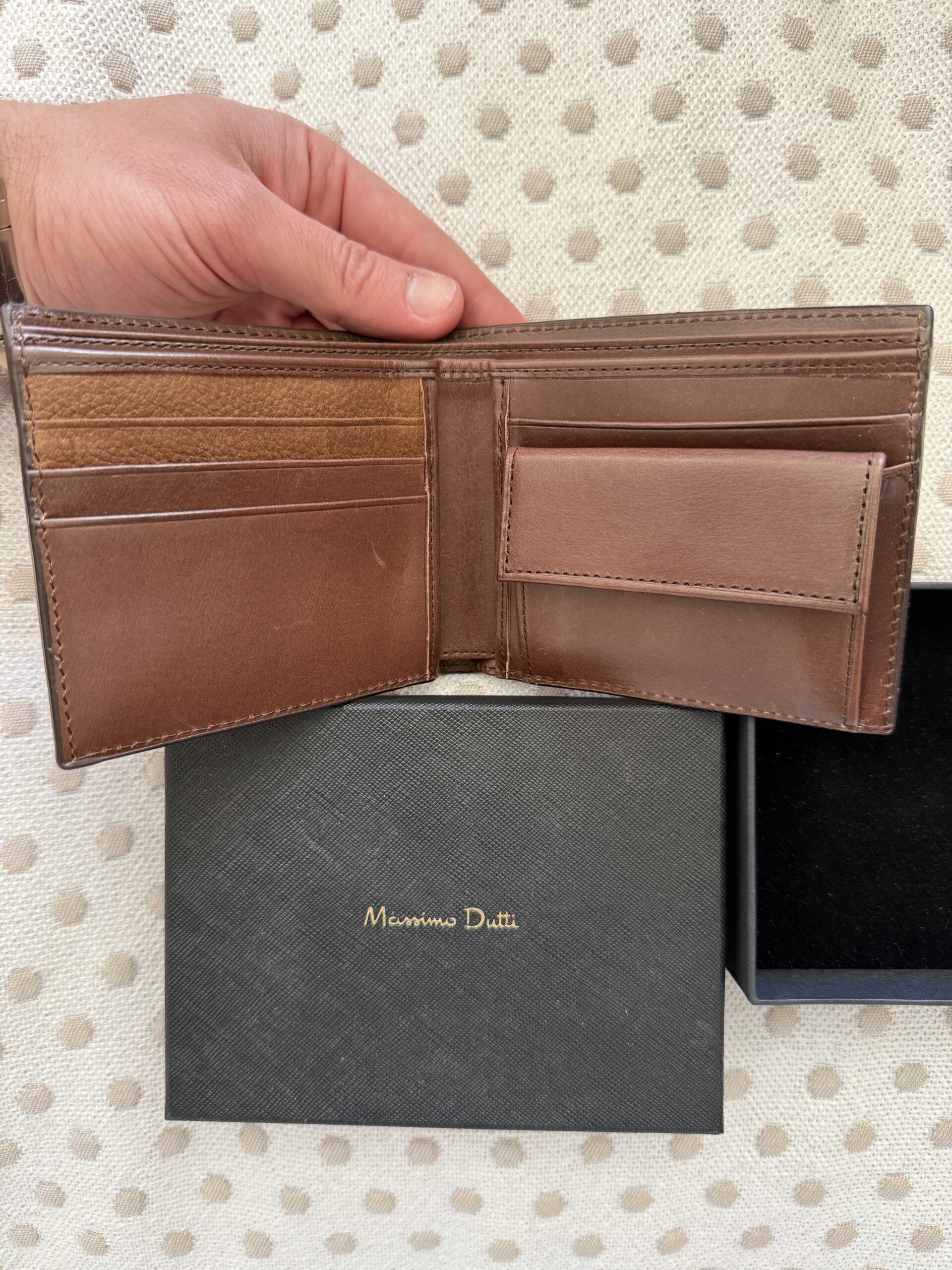 Elegante cartera de Massimo Dutti confeccionada en piel de tono marrón cálido, con acabado suave y tacto natural. Su diseño sobrio y atemporal la convierte en un accesorio versátil para el uso diario, manteniendo una estética refinada. Incluye su estuche original, aportando un extra de presentación y cuidado. El interior está pensado para organizar tarjetas, billetes y documentos con comodidad y discreción. La piel presenta una pátina ligera que realza su carácter y autenticidad.