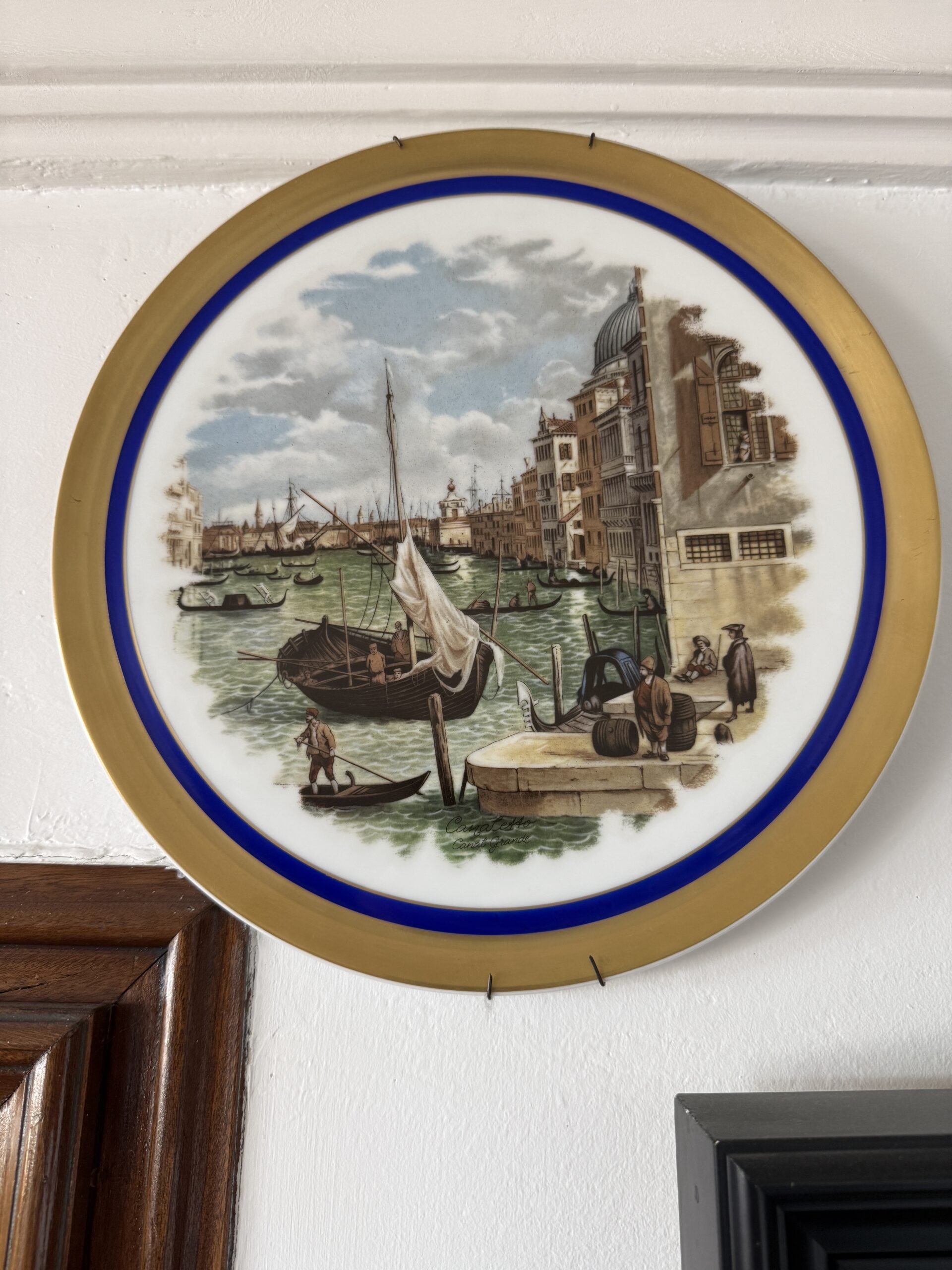 • Plato con escena urbana portuaria con embarcaciones y arquitectura.