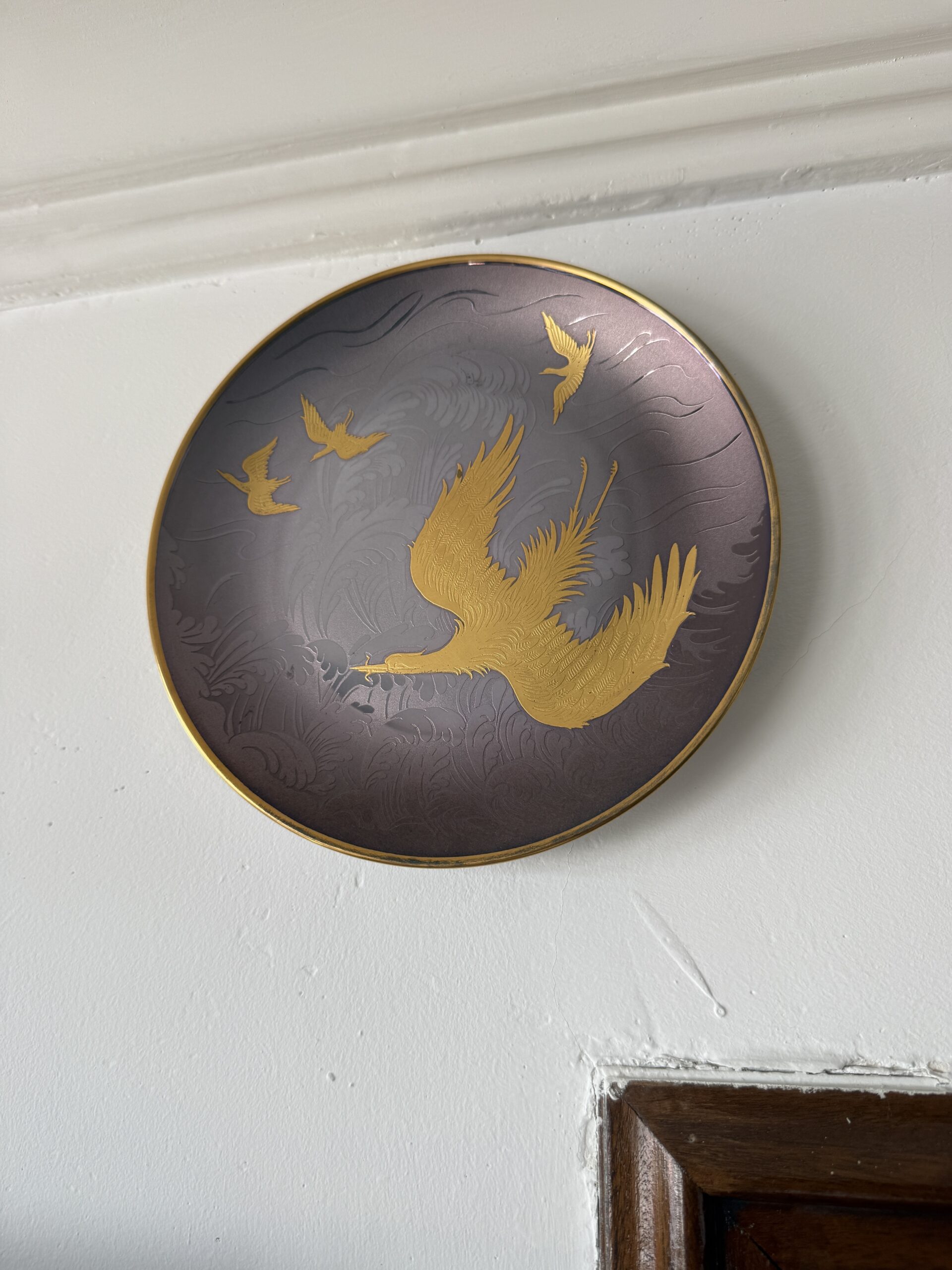 • Plato con decoración de aves en vuelo en relieve dorado sobre fondo oscuro.