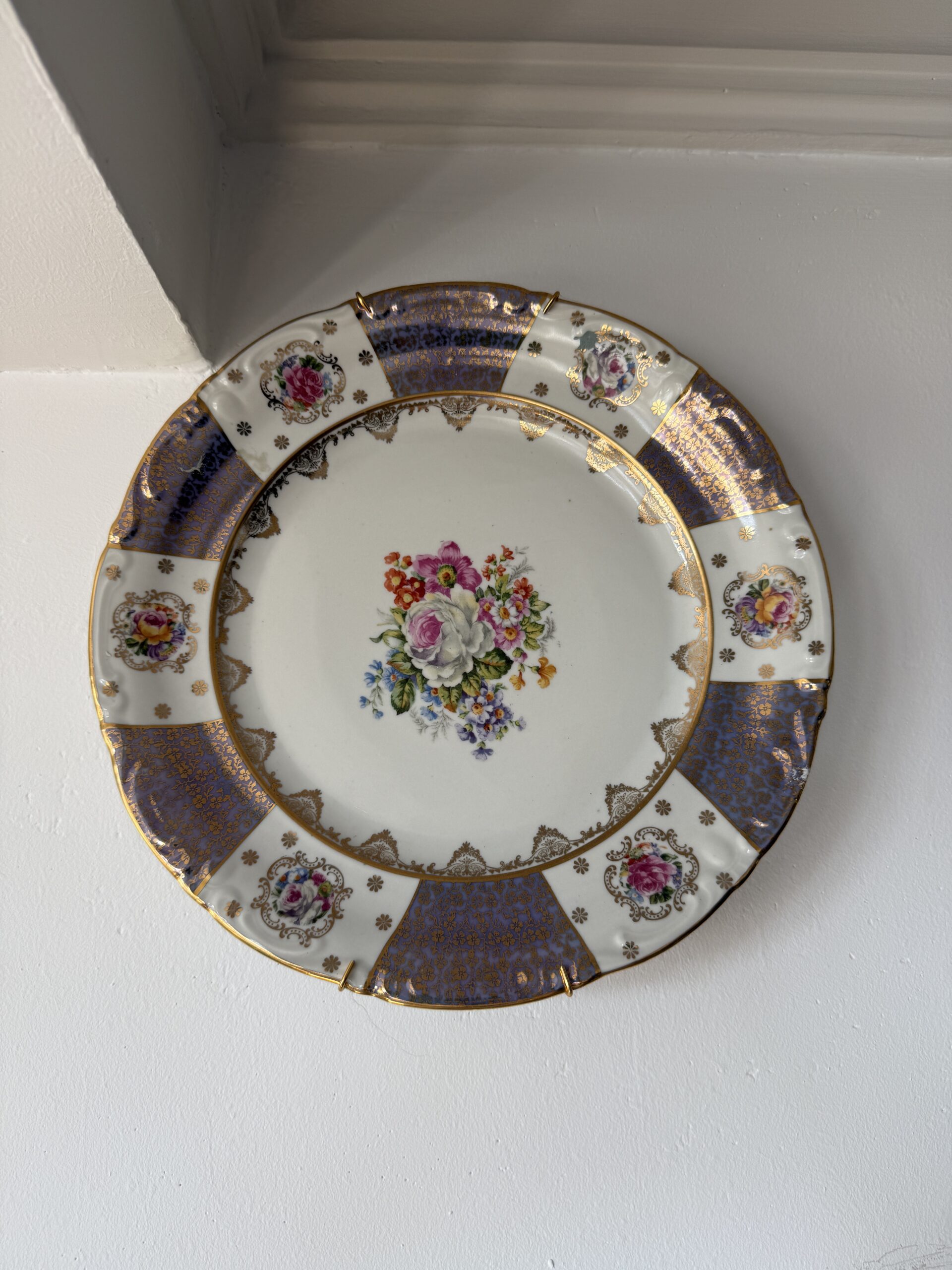 • Plato con decoración floral en el centro y borde ornamentado en tonos azul, blanco y dorado.