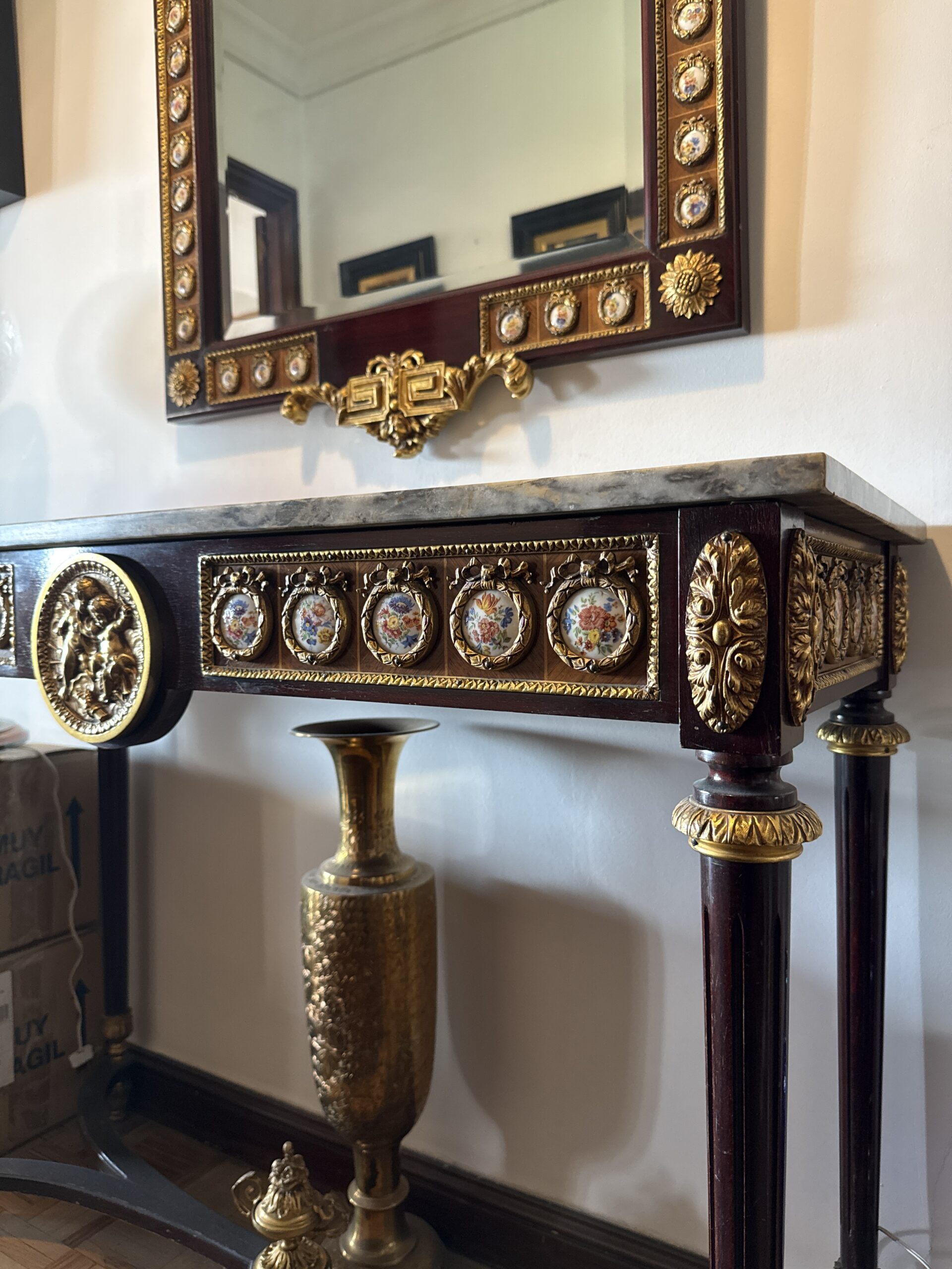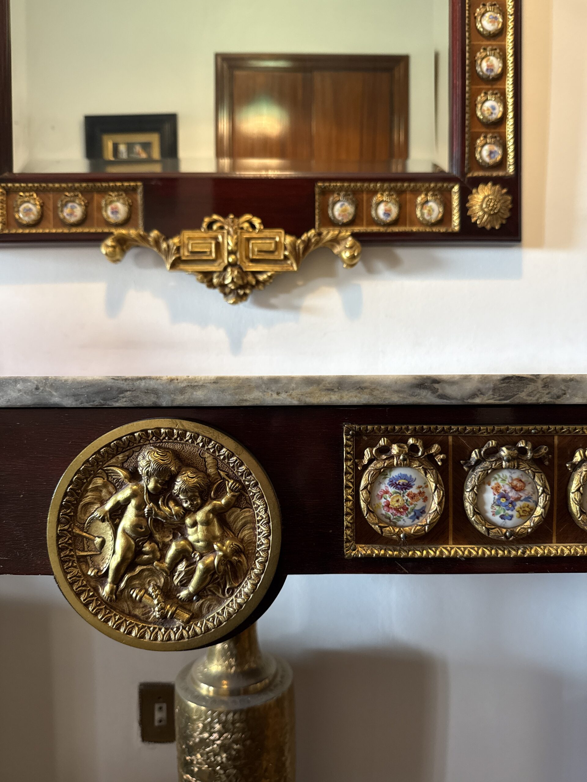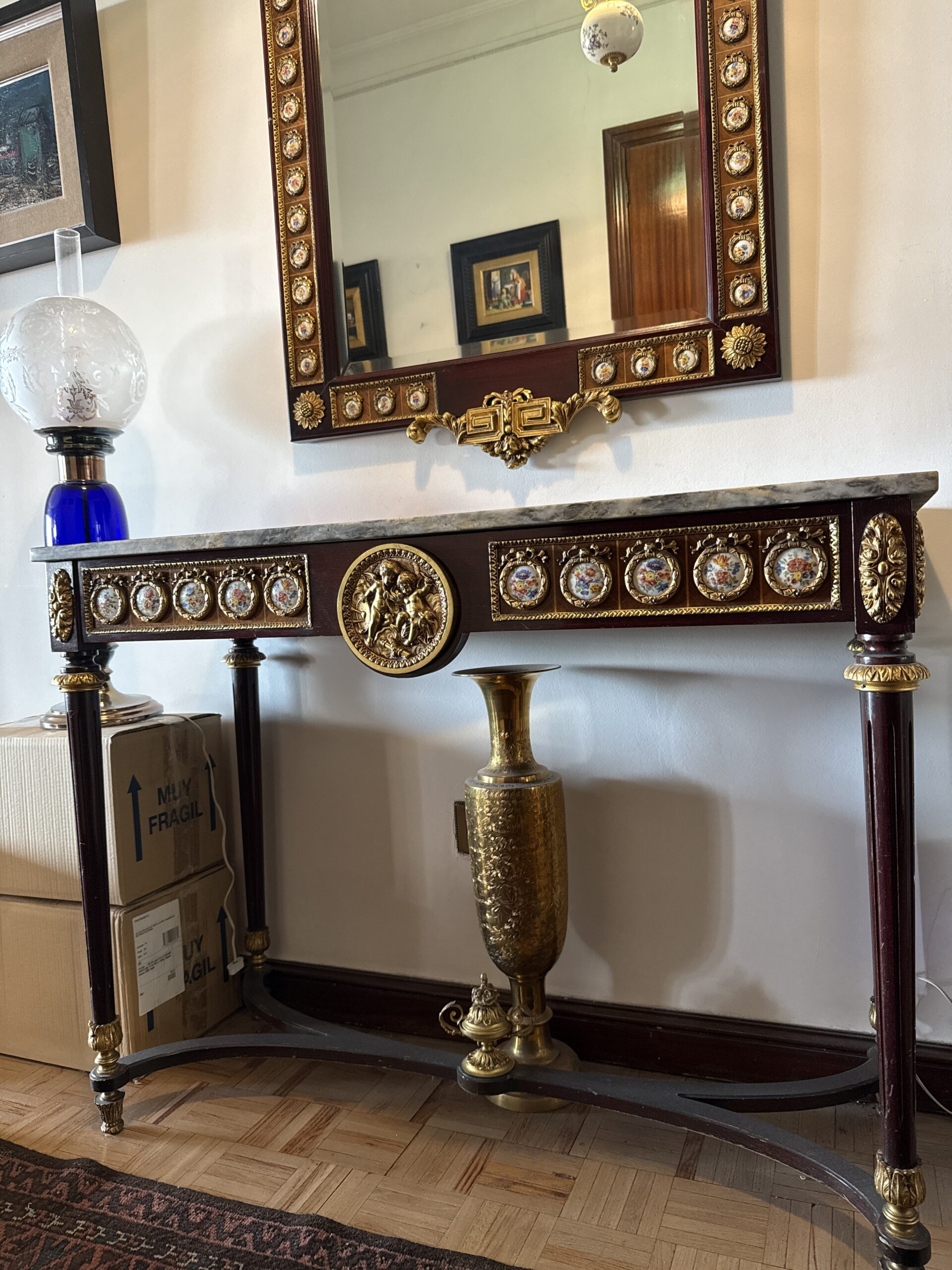 Refinada consola de inspiración francesa estilo Luis XVI, elaborada en madera noble con sobre de mármol y ricamente ornamentada con aplicaciones de bronce dorado. Su frente destaca por una elegante sucesión de medallones de porcelana pintados a mano, enmarcados por detalles clásicos de gran precisión, junto a un medallón central en relieve que aporta carácter escultórico.