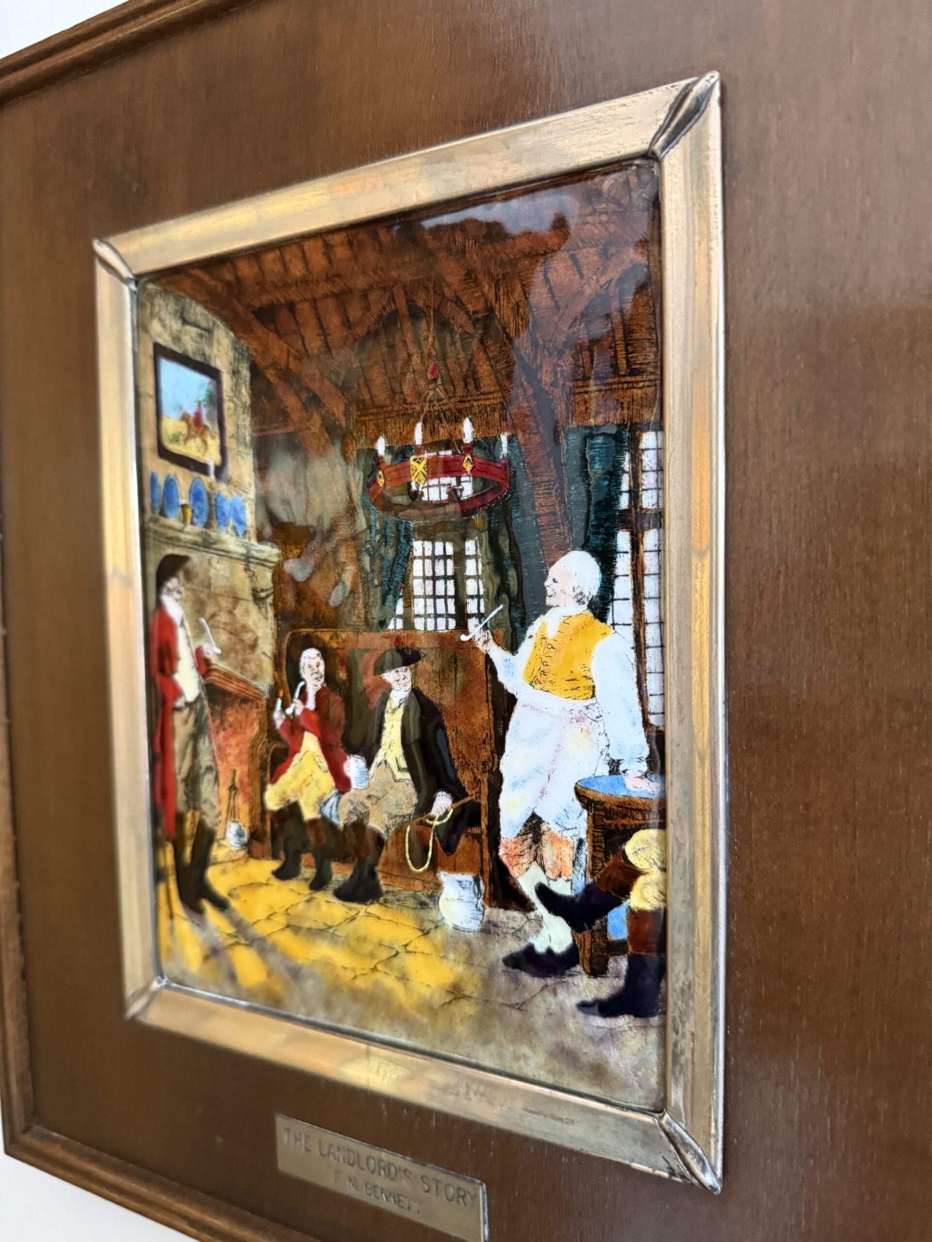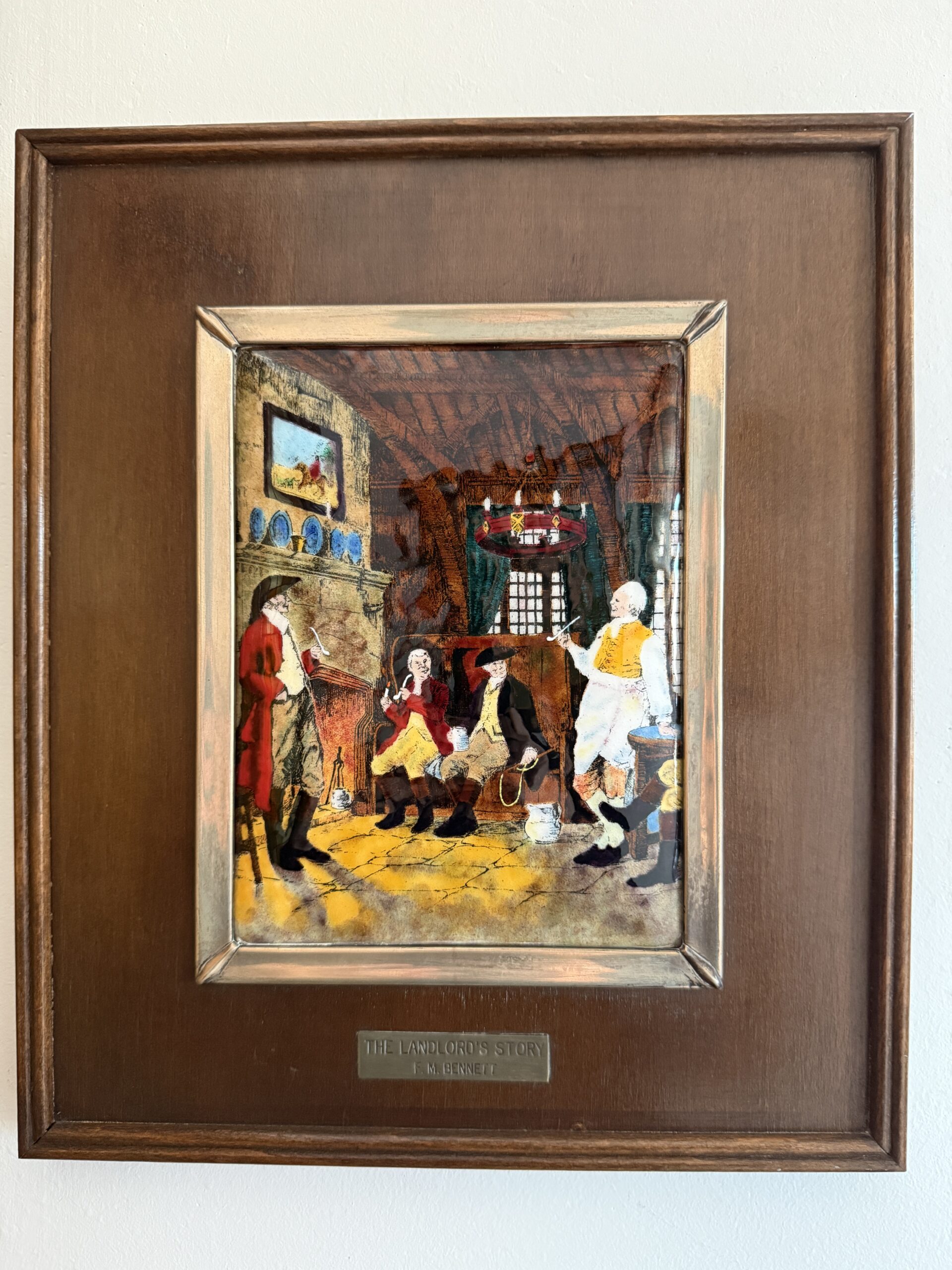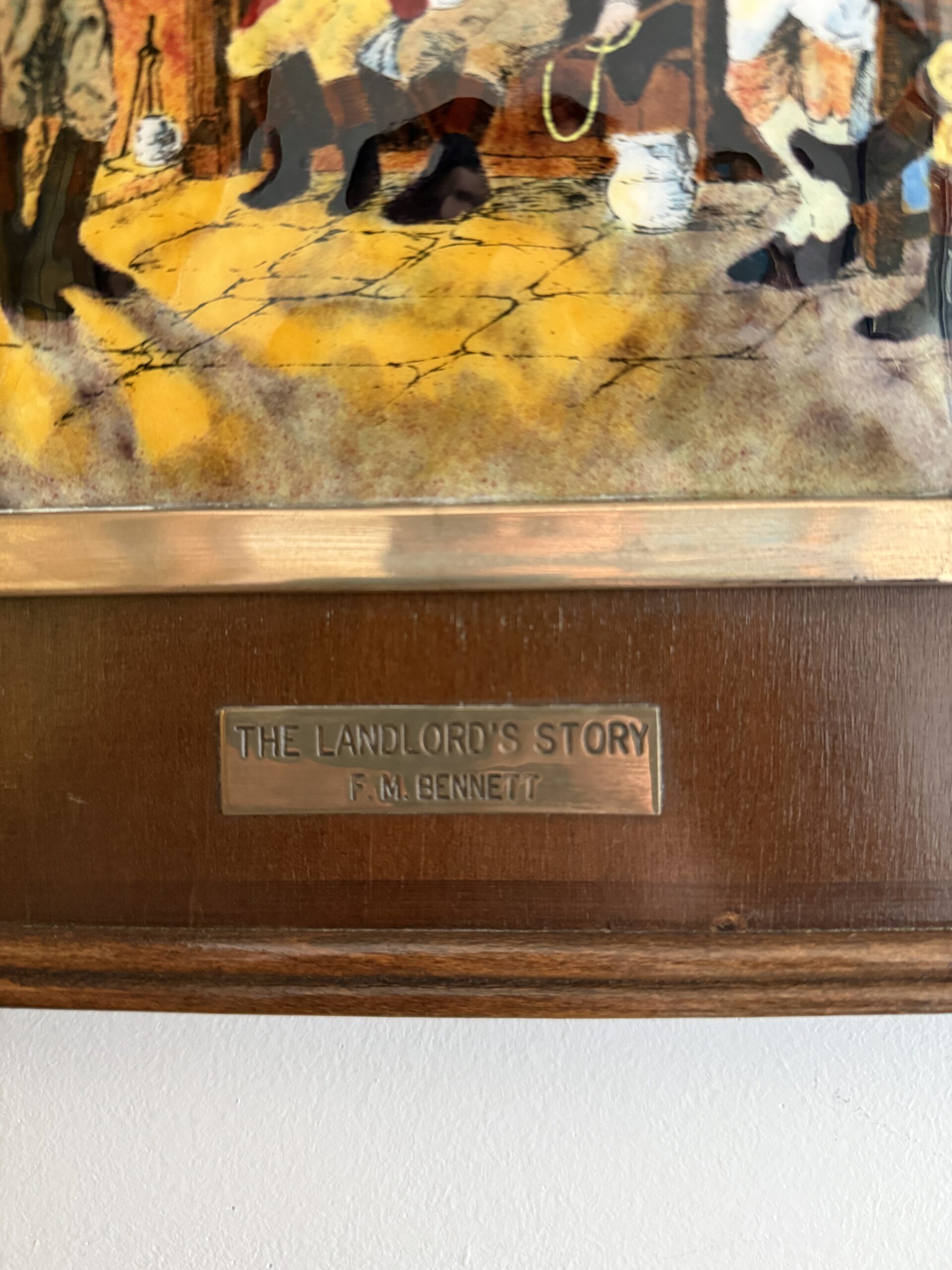 Original cuadro decorativo con escena narrativa esmaltada bajo vidrio, titulado “The Landlord’s Story”, que recrea un ambiente clásico de taberna con personajes en actitud animada. La composición, rica en detalles y color, aporta dinamismo y un toque artístico distintivo. Se presenta en un sólido marco de madera de tono cálido con interior dorado que enmarca la escena con elegancia. La placa inferior con el título añade carácter y presencia a la pieza.