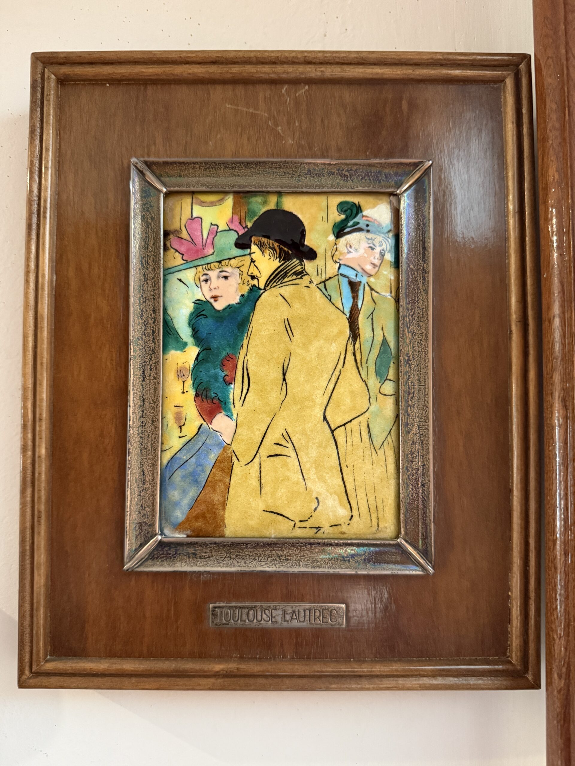 Placa esmaltada de inspiración Toulouse-Lautrec que recrea una escena elegante de la vida parisina, con figuras estilizadas y una paleta cromática cálida que transmite sofisticación y movimiento. La composición refleja el carácter artístico y bohemio propio del París de finales del siglo XIX.