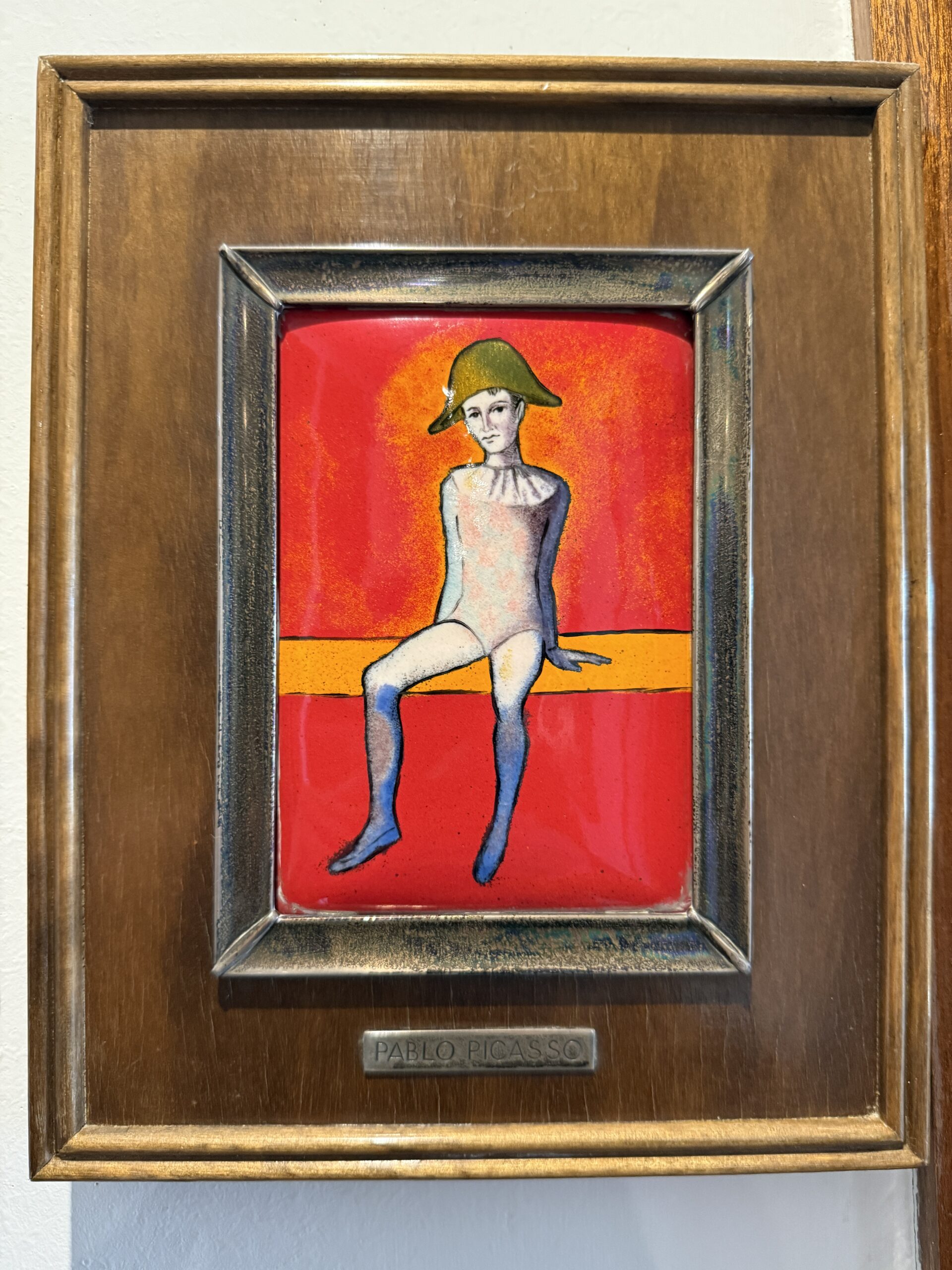 Cuadro enmarcado con placa esmaltada estilo Picasso fondo rojo