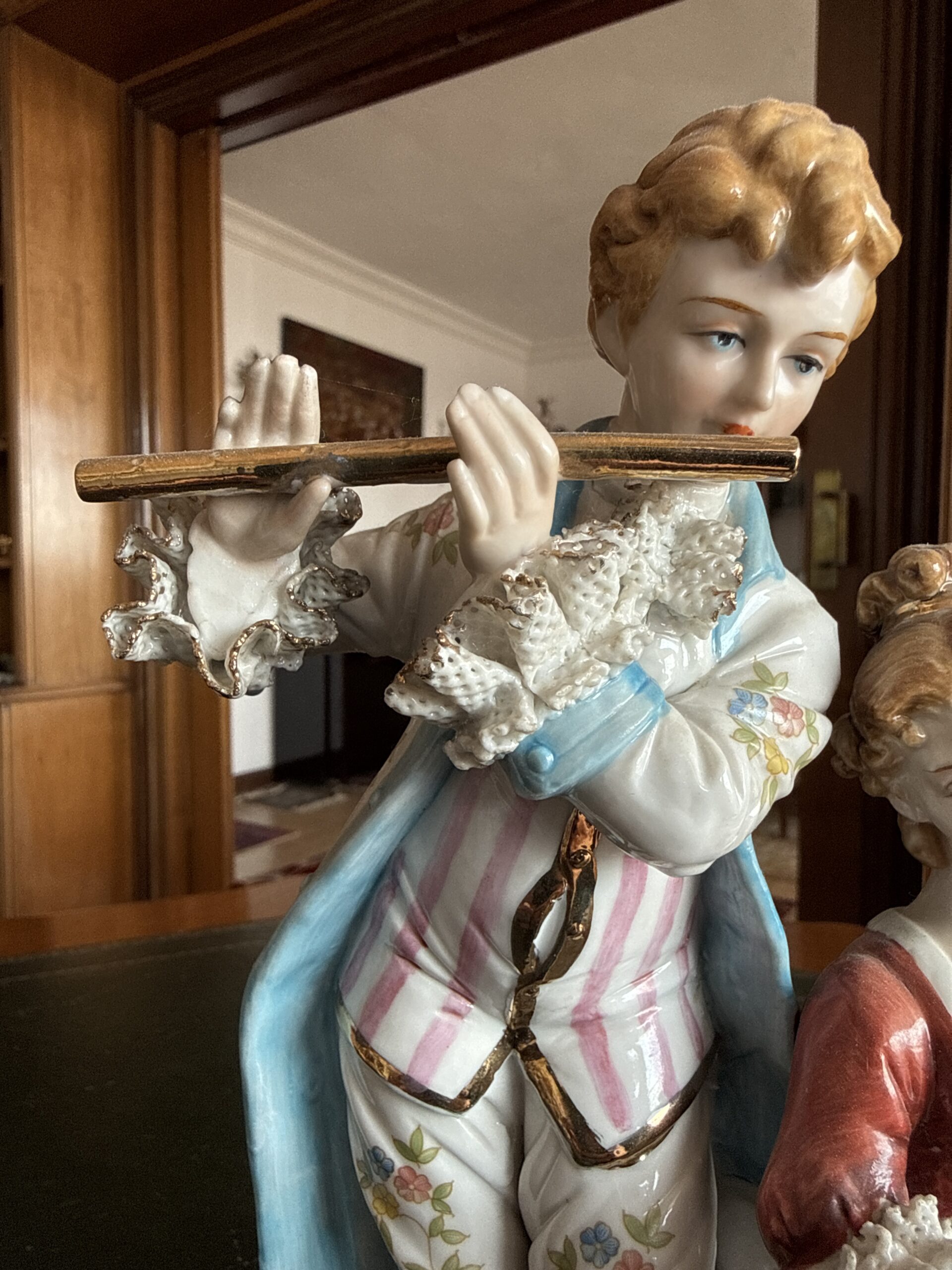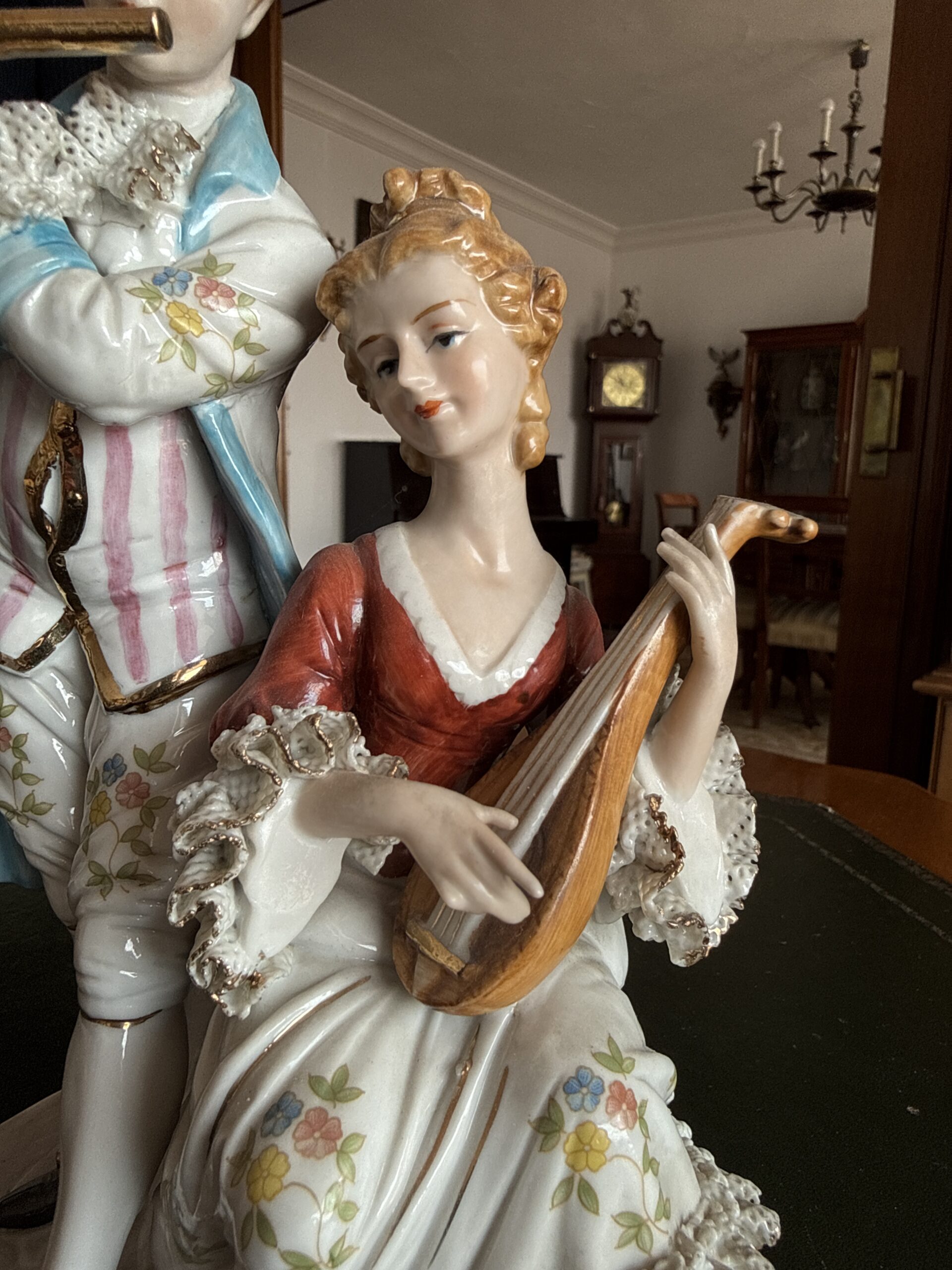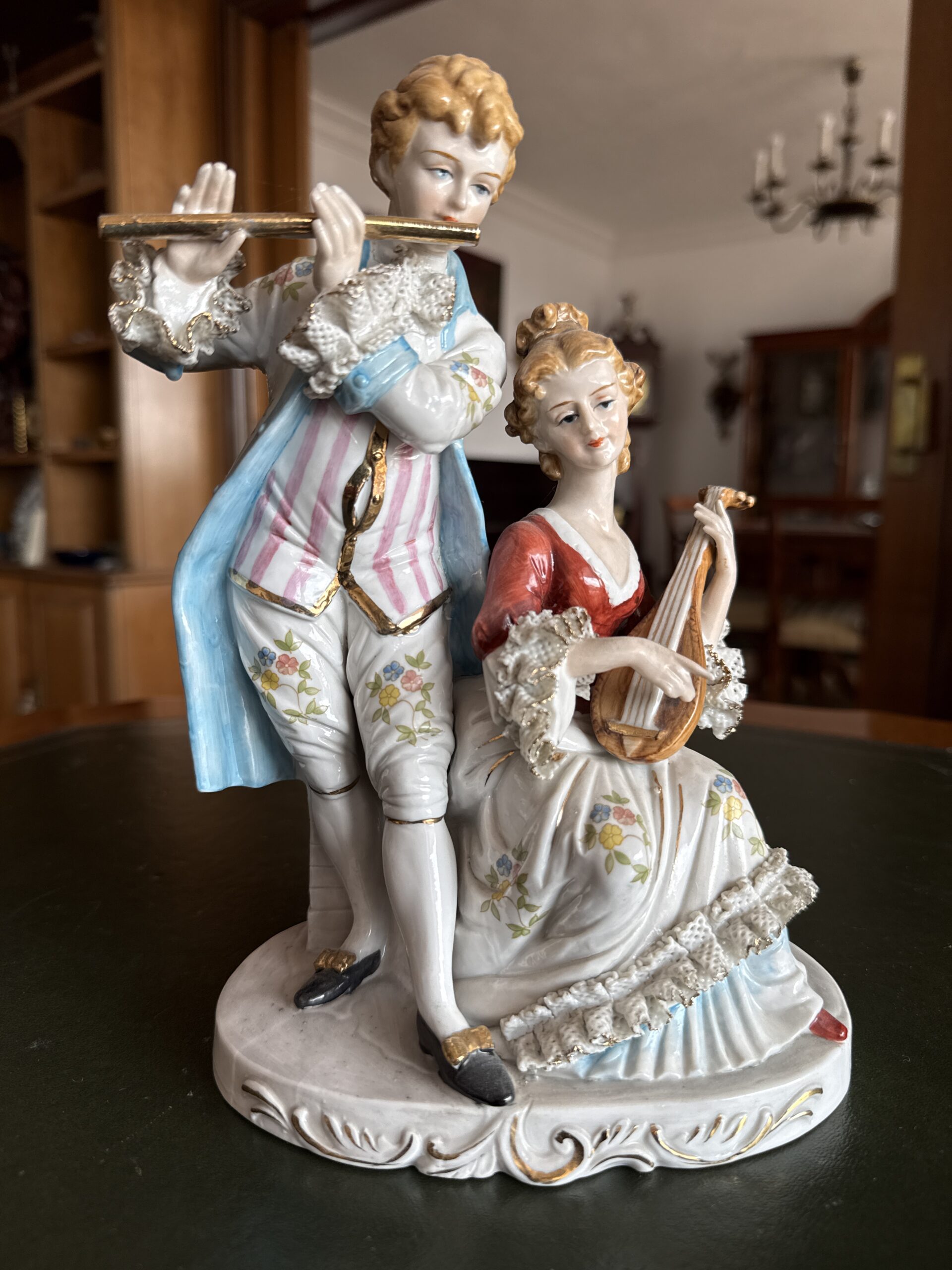 Exquisita figura de porcelana de inspiración clásica que representa una escena galante con dos músicos en plena interpretación. La pieza destaca por su riqueza cromática, con delicados tonos pastel, detalles florales y elegantes toques dorados que realzan su carácter refinado. Los rostros y gestos están finamente modelados, transmitiendo armonía y romanticismo en cada detalle. La composición, equilibrada y dinámica, aporta profundidad visual y una estética atemporal. El acabado esmaltado añade brillo y sofisticación, elevando su valor decorativo. Una pieza que evoca tradición artística y buen gusto en cualquier ambiente.