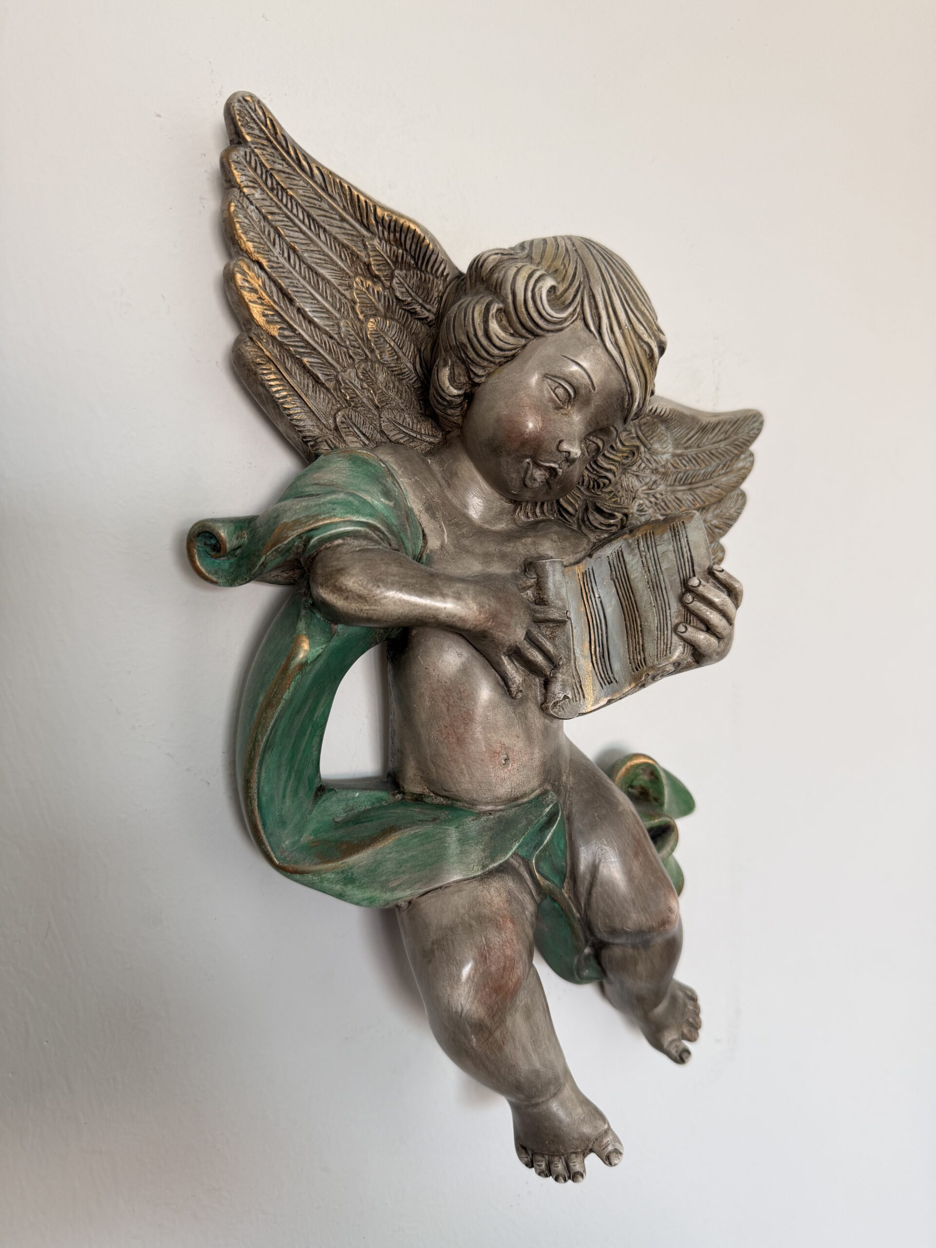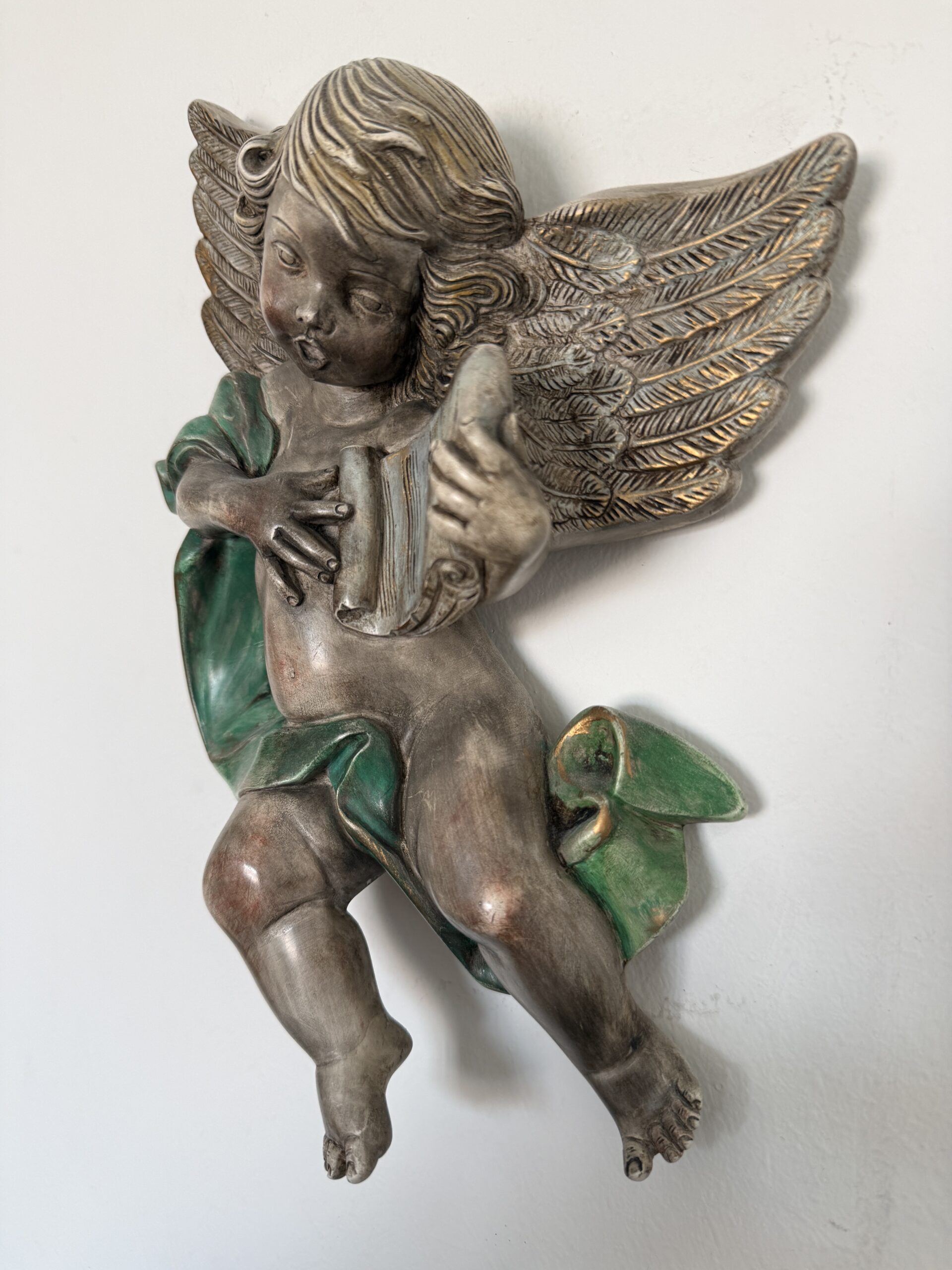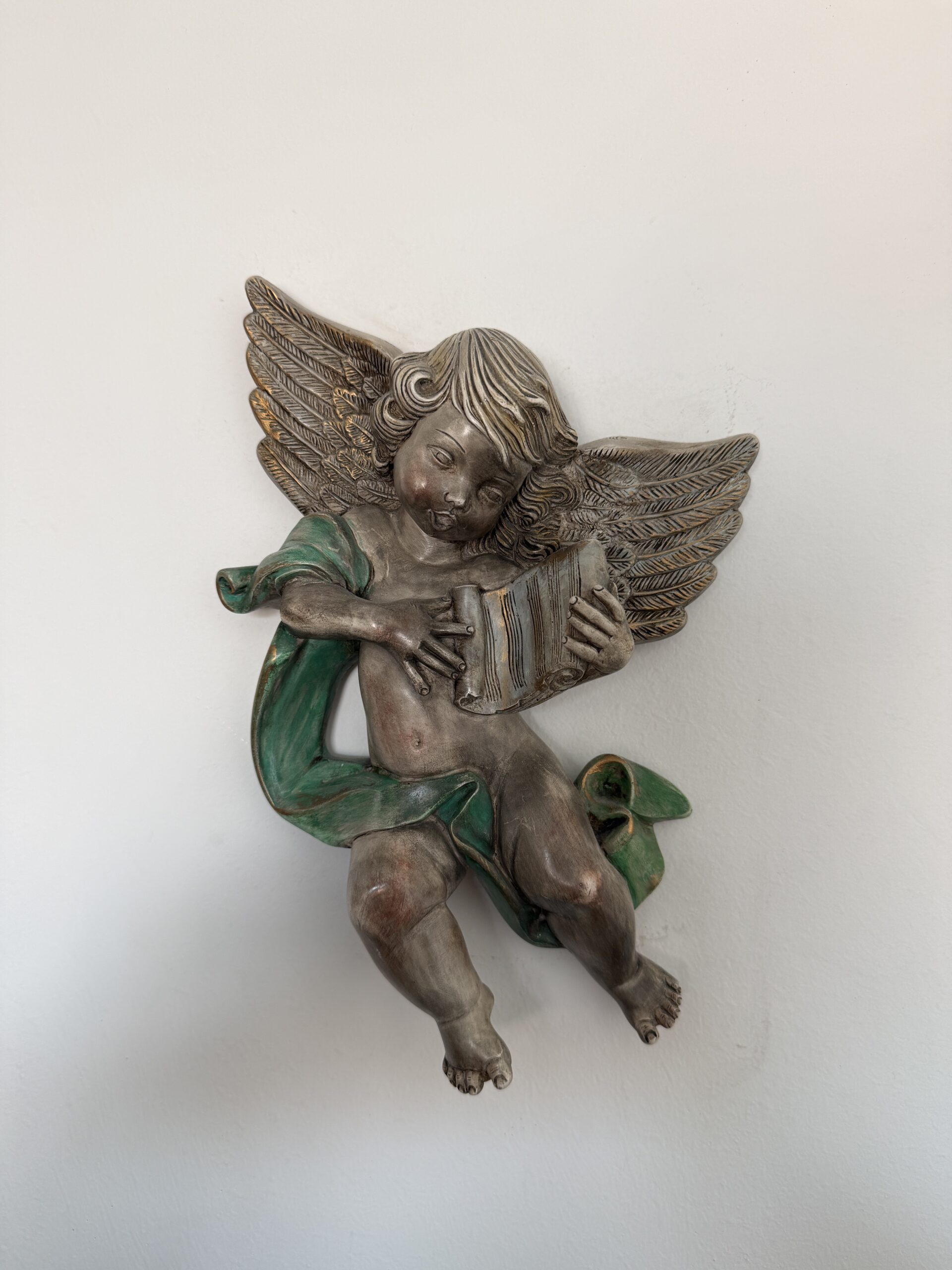 Delicada figura decorativa de ángel en relieve, representado en una pose serena mientras interpreta un instrumento, aportando un aire artístico y armonioso. Su acabado en tonos envejecidos con detalles en verde crea un contraste elegante y lleno de carácter. Las alas cuidadosamente esculpidas y la expresión suave del rostro transmiten calma y belleza. Ideal para colgar en pared, se integra con facilidad en ambientes clásicos, románticos o eclécticos. Su tamaño compacto permite colocarlo tanto como pieza central como complemento decorativo.