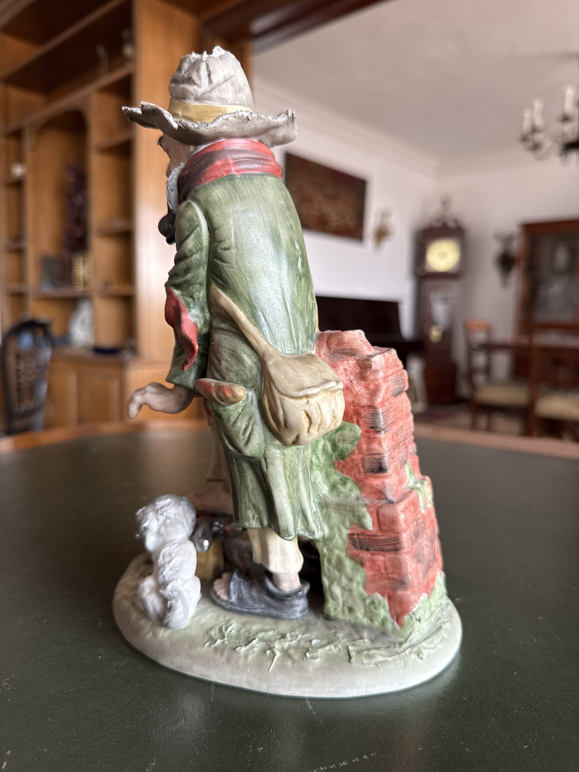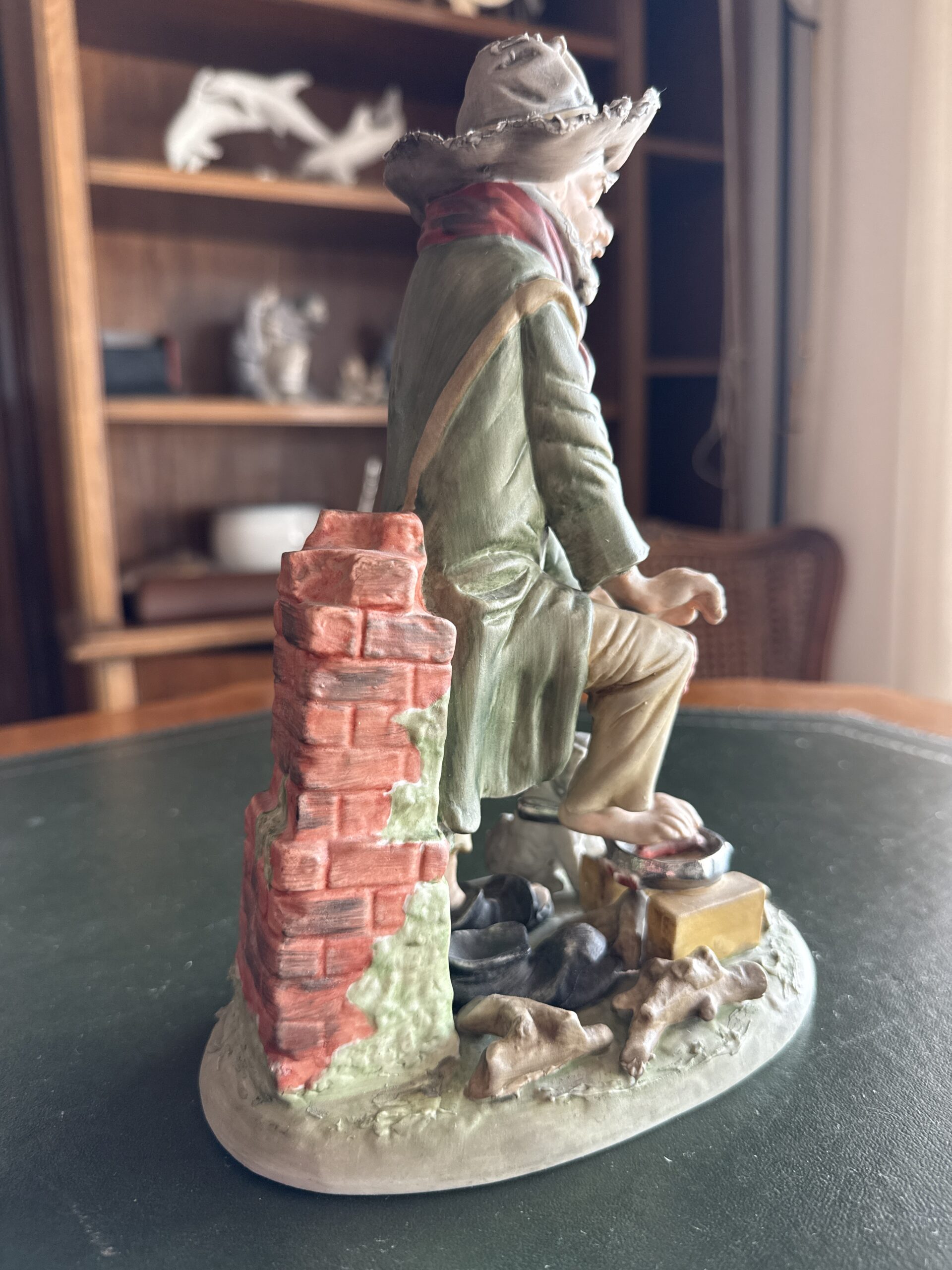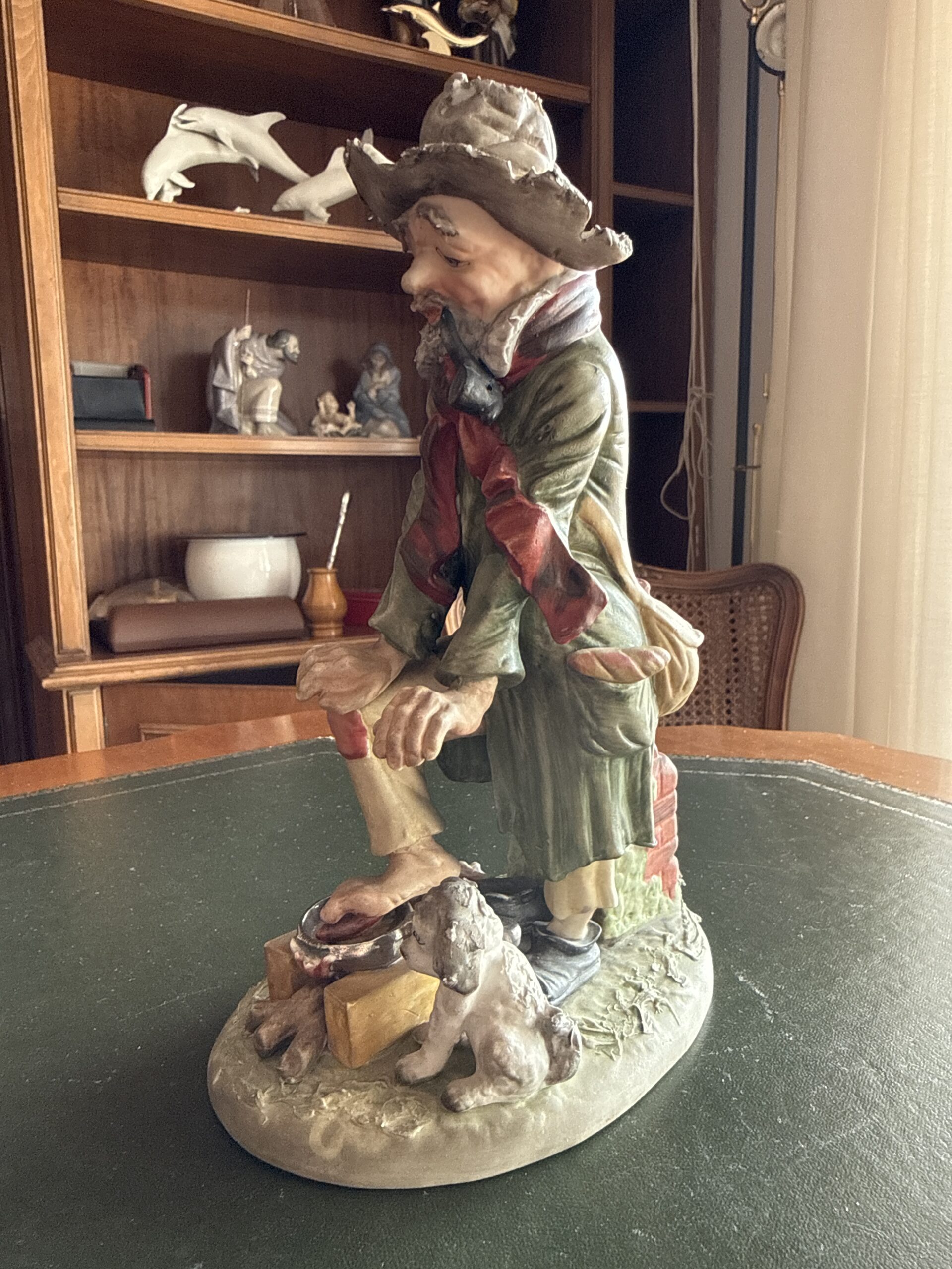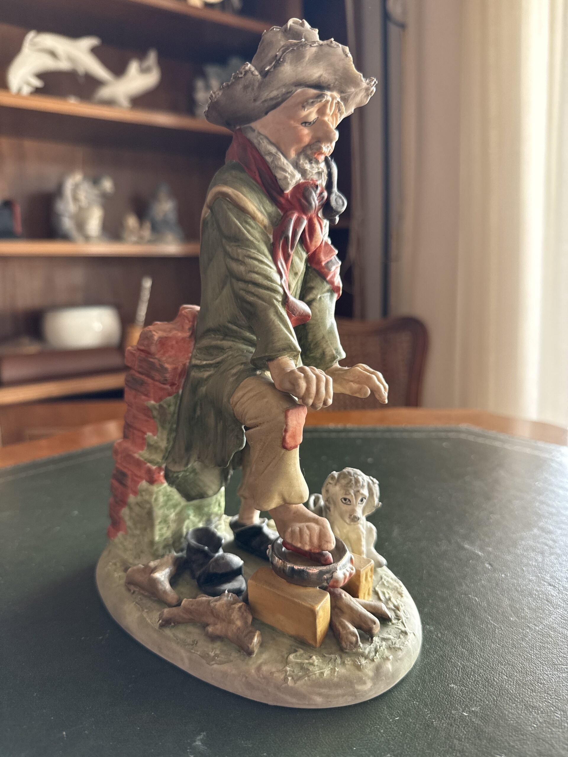 Figura de cerámica policromada que representa a un zapatero trabajando, acompañado de un perro. Escena detallada con elementos como herramientas, calzado y muro de fondo. Acabado artesanal con buen nivel de detalle en la expresión y la vestimenta.