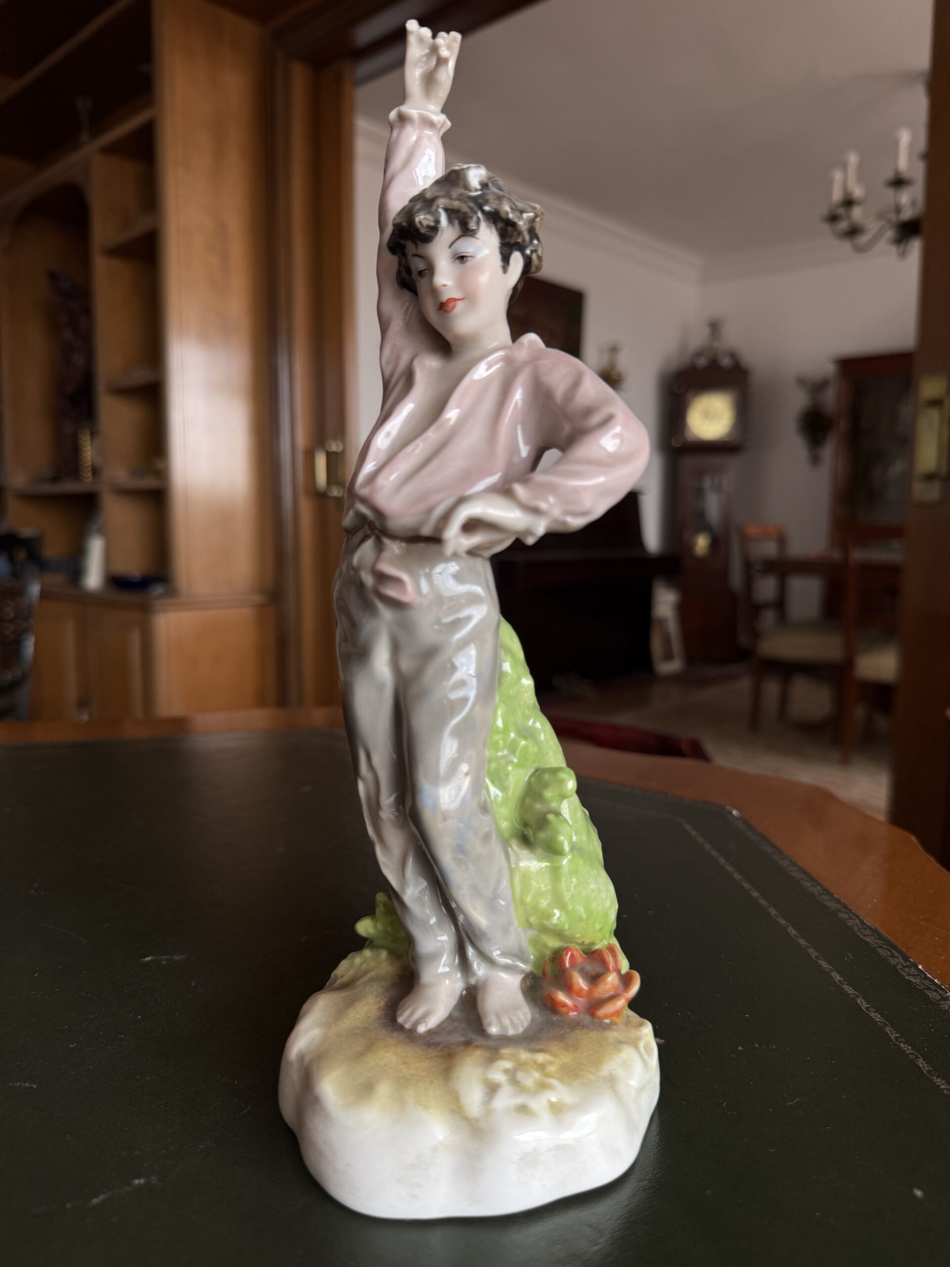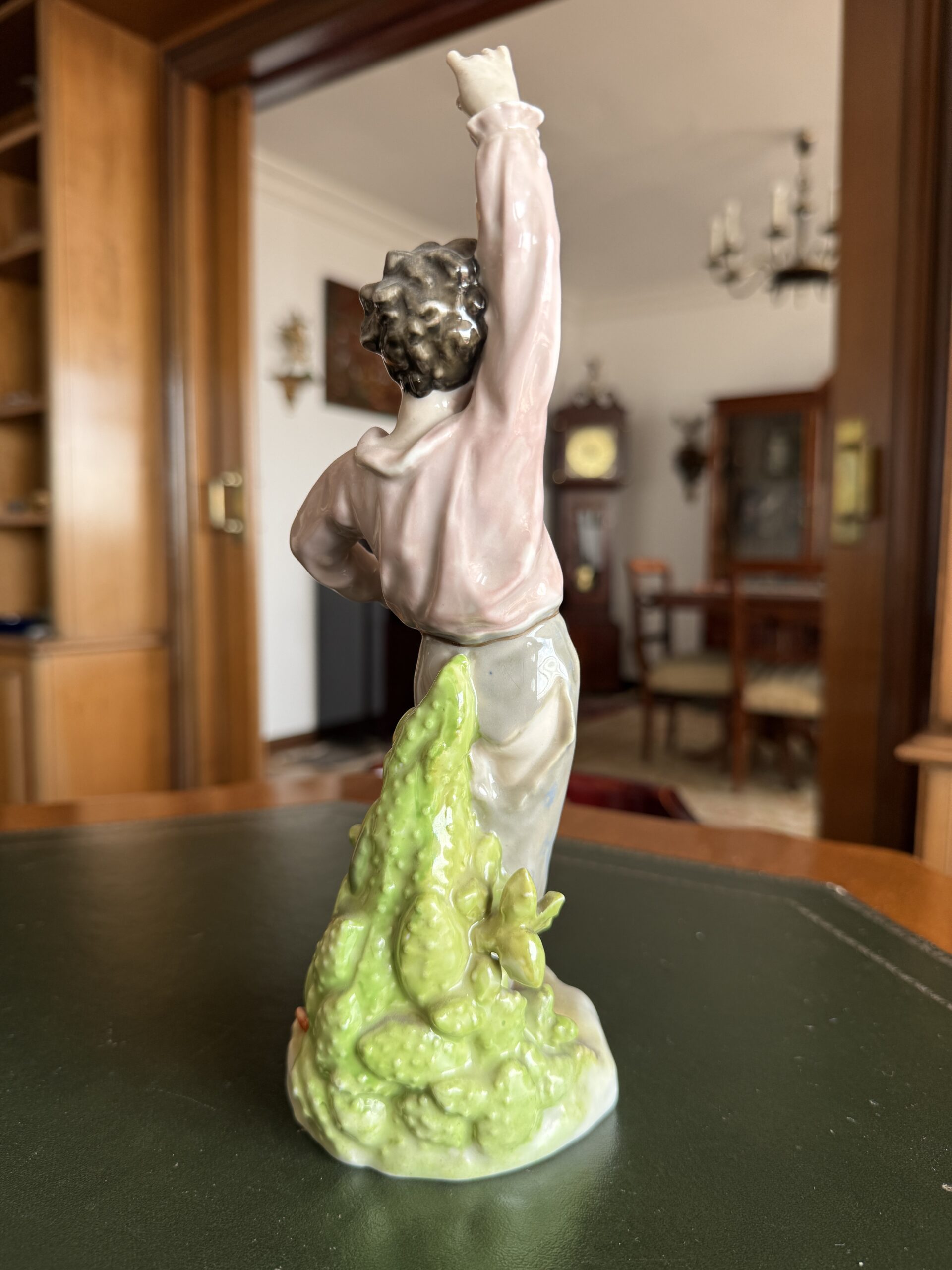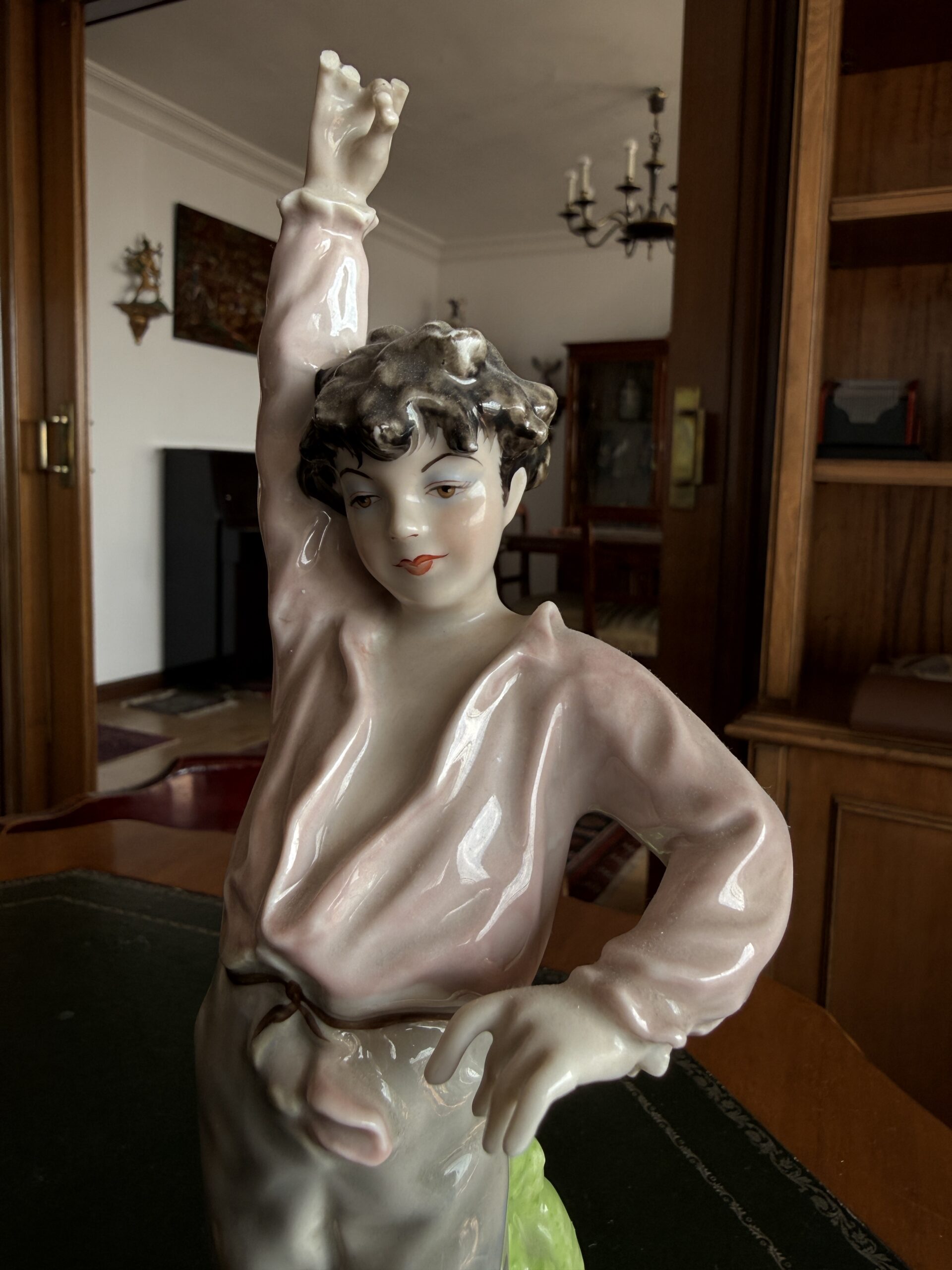 Figura de estilo esmaltada, con acabado brillante y detalles delicados. Representa una figura en pose elegante, con tonos suaves (rosa, marfil y verde) que aportan calidez y sofisticación a cualquier espacio.