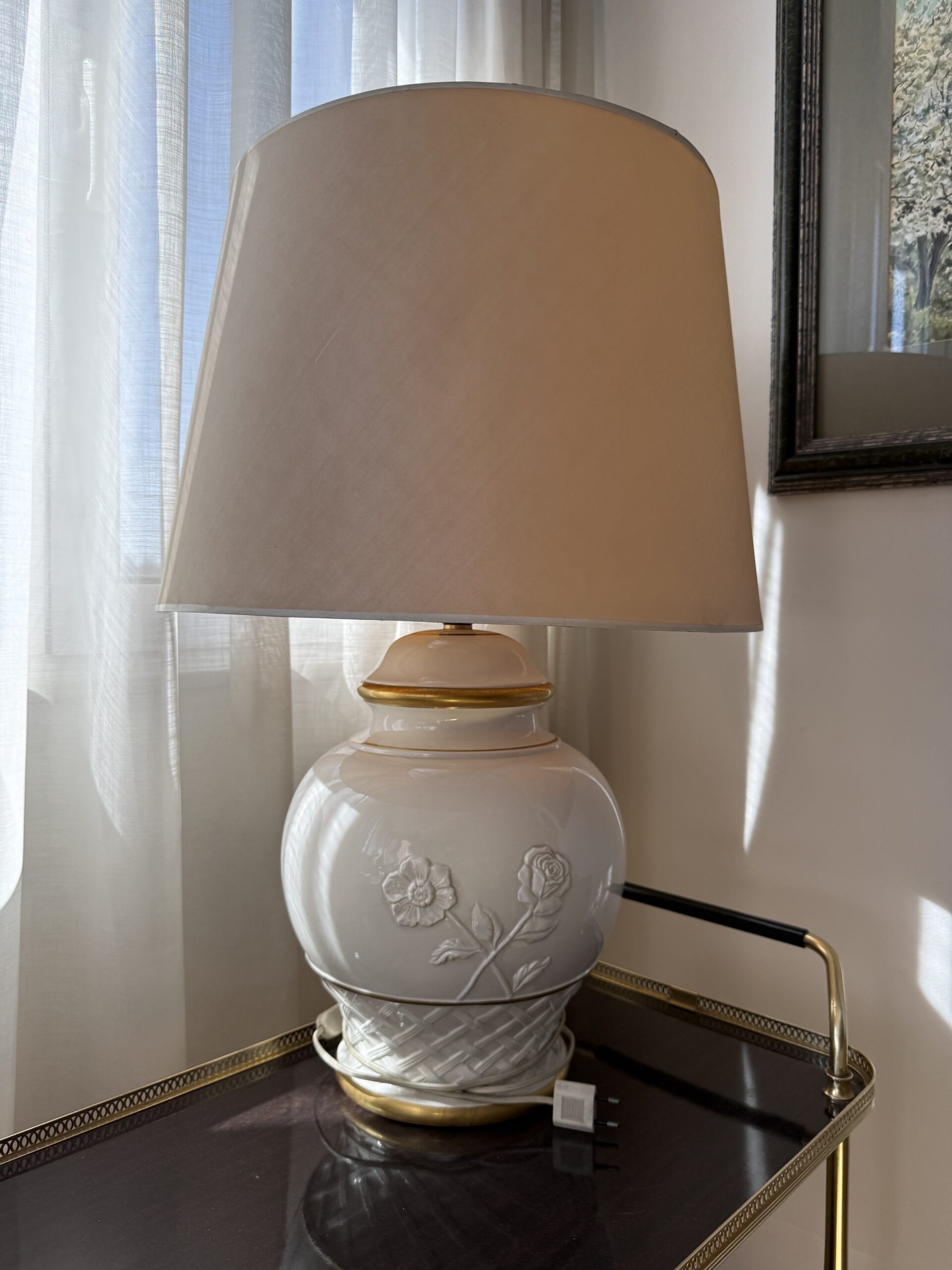 Lámpara de mesa de cerámica blanca con relieve floral y pantalla