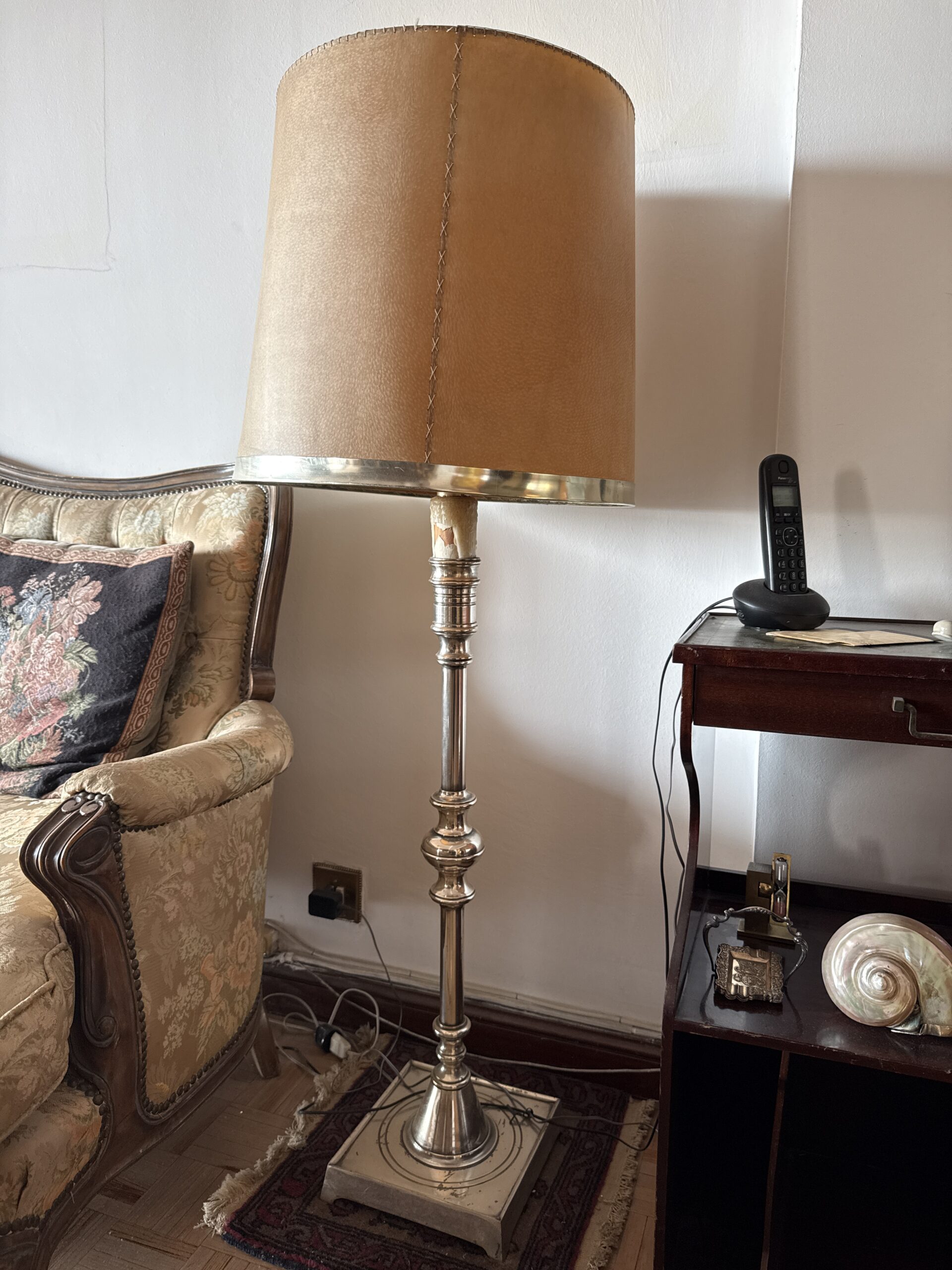 Lámpara de pie de estilo clásico con base y estructura metálica en acabado plateado y pantalla textil en tono cálido con detalle de costura central.