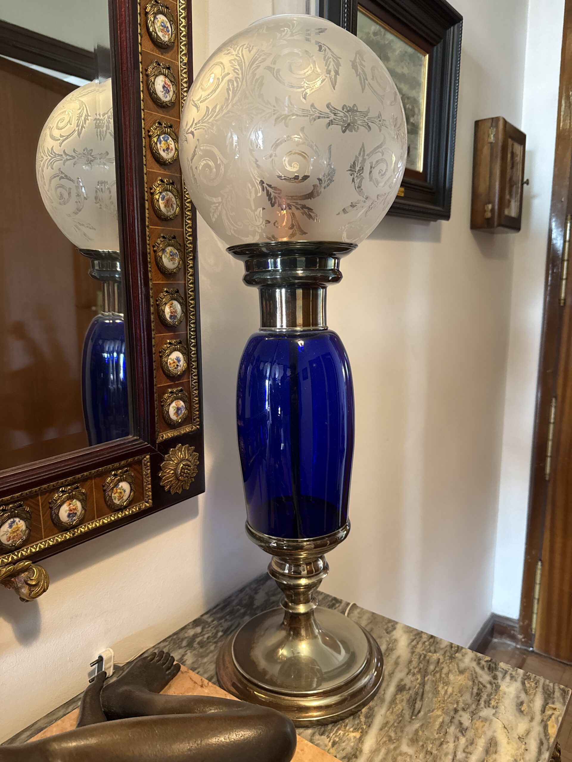 Lámpara de sobremesa con base en vidrio azul de gran intensidad y detalles metálicos, rematada con tulipa esférica de vidrio grabado. Una pieza con presencia que aporta luz ambiental y carácter decorativo. (2 unidades a 14 euros cada una)