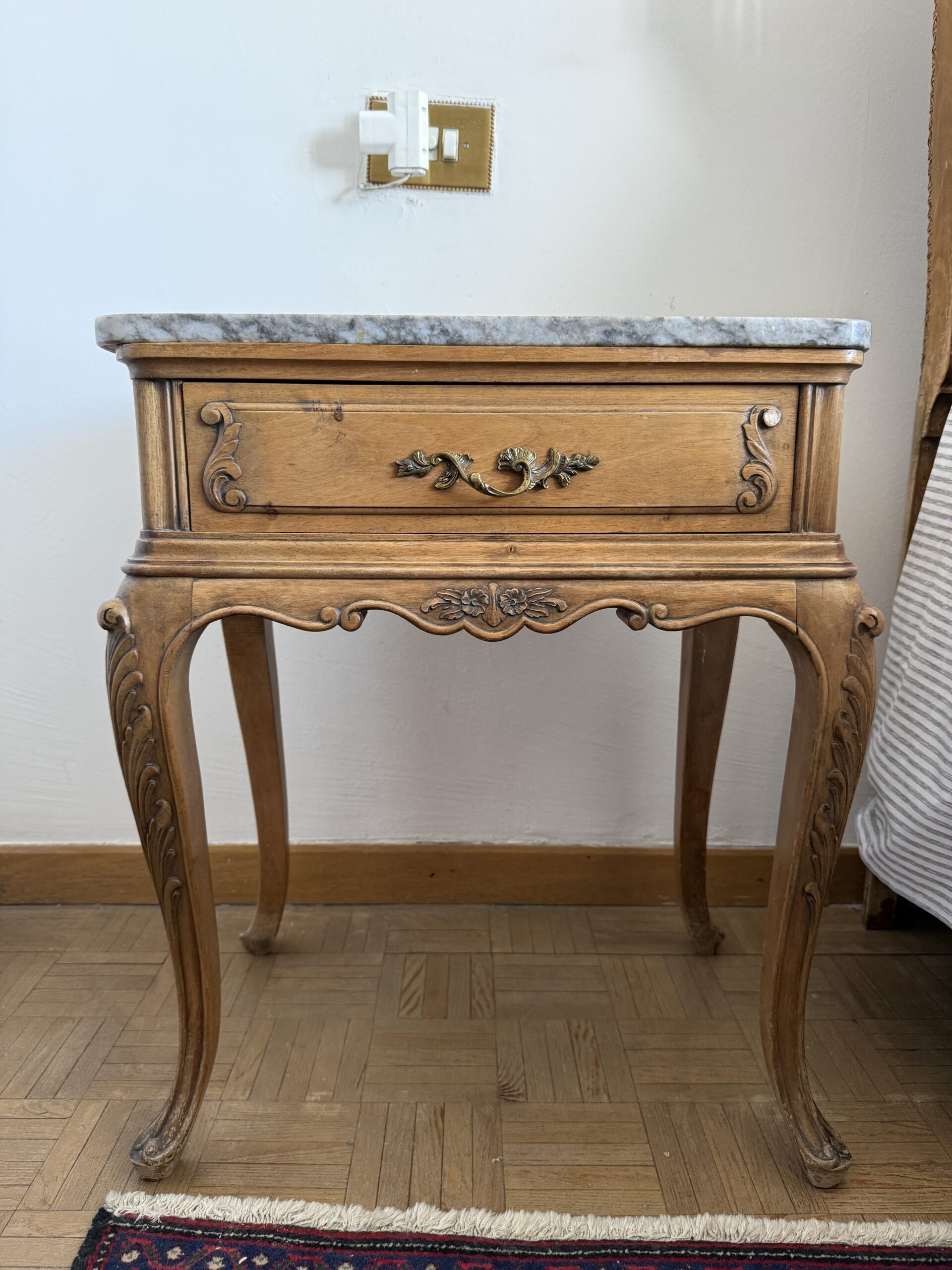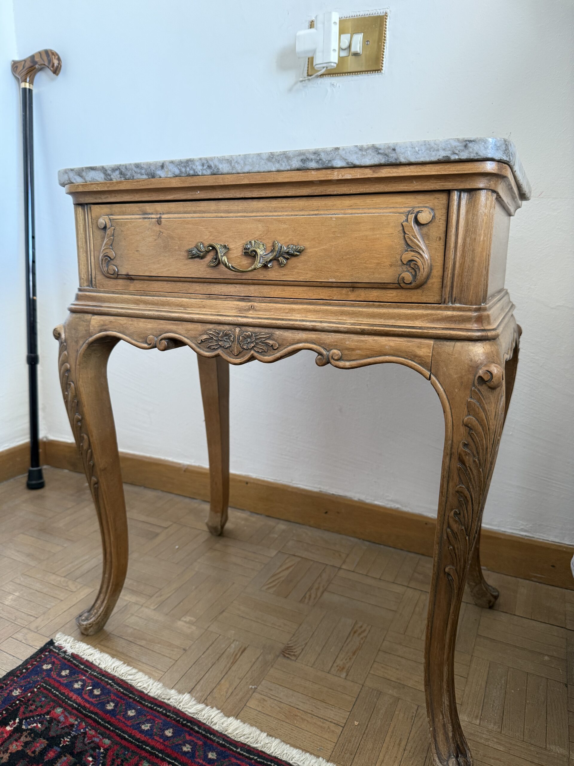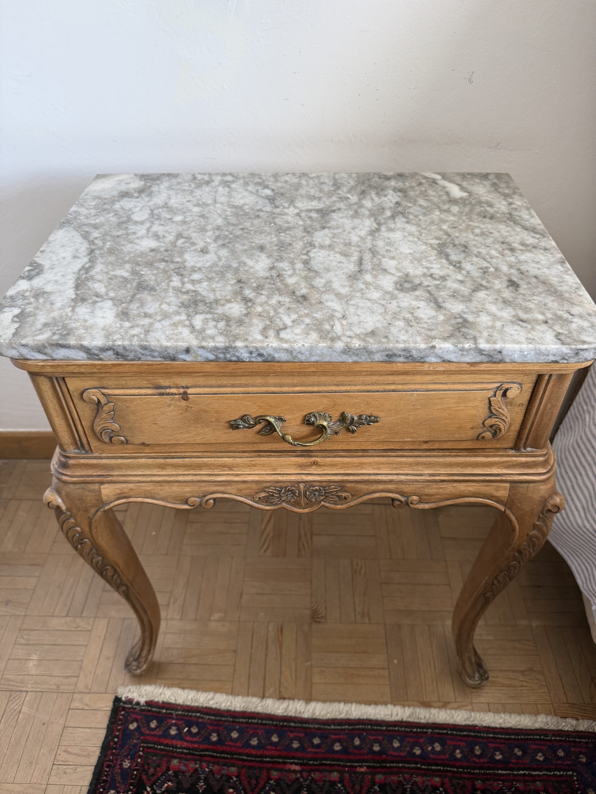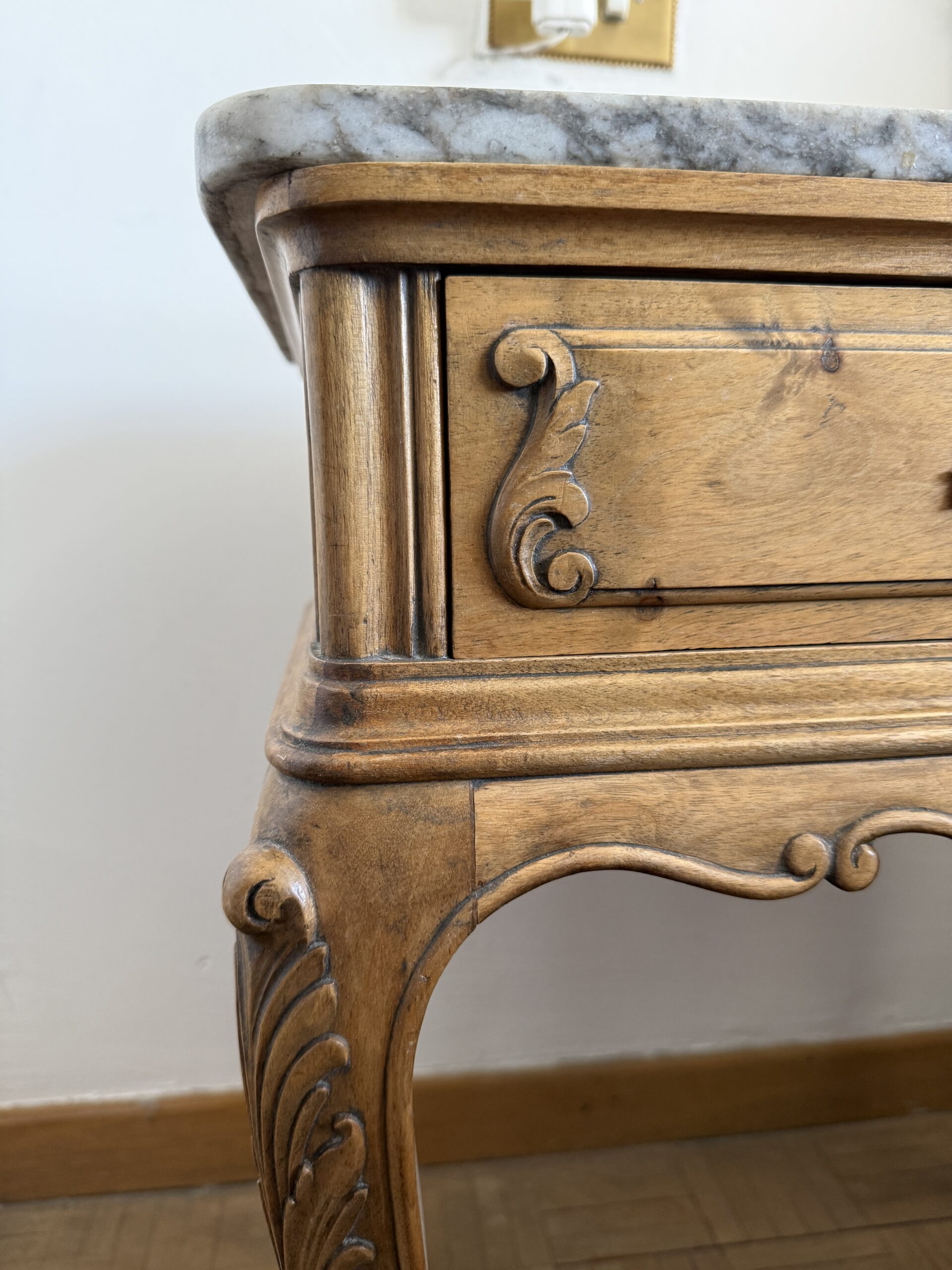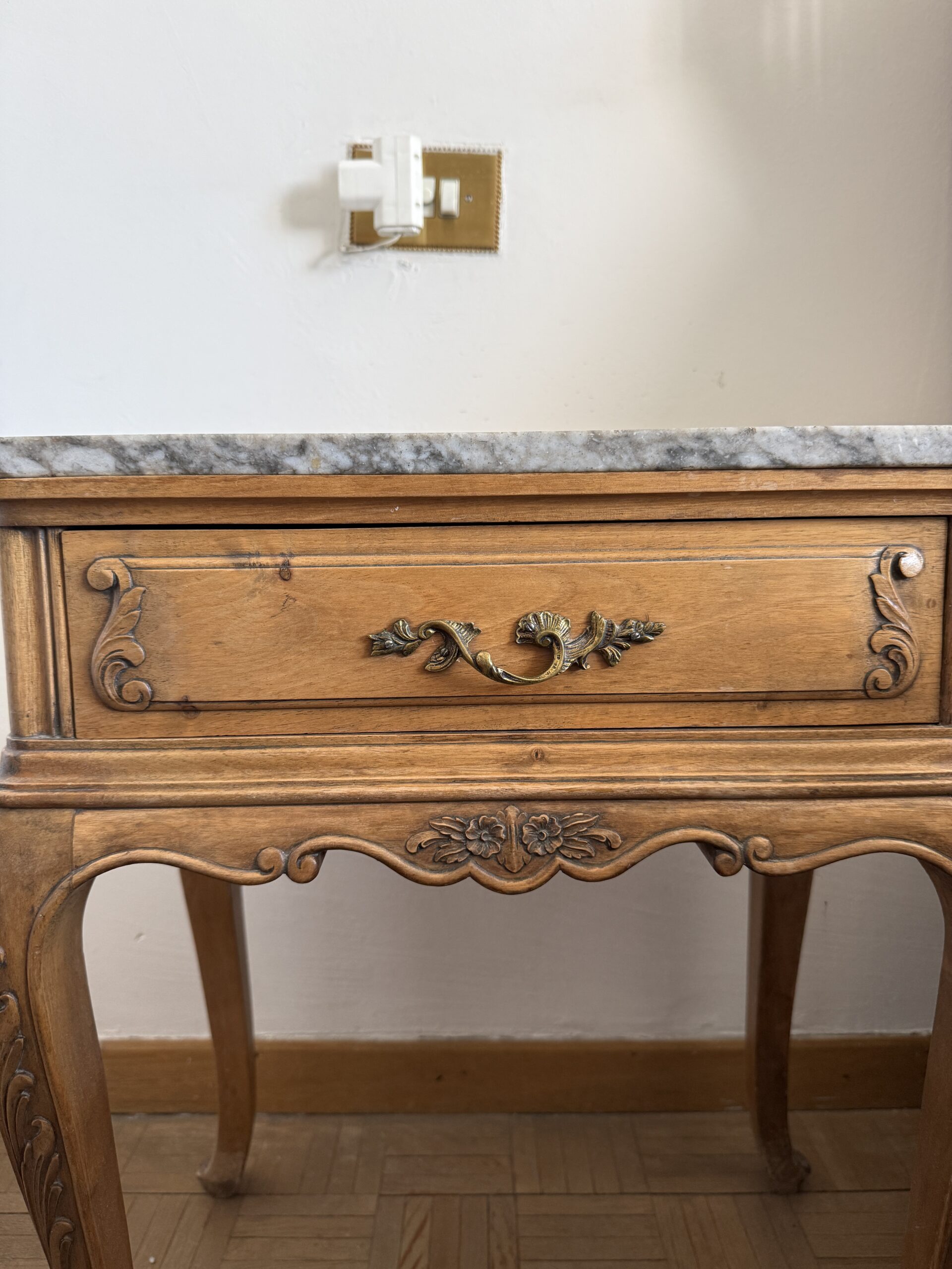 Elegante mesita auxiliar de inspiración clásica, realizada en madera con delicados detalles tallados que realzan su carácter refinado. Su sobre de mármol aporta un contraste sofisticado y una superficie resistente, ideal para uso decorativo o funcional. Las patas curvas estilizadas y los acabados ornamentales reflejan una estética atemporal propia del mobiliario europeo tradicional. Incorpora un cajón frontal con tirador metálico que suma practicidad sin perder armonía visual. Su tamaño compacto permite integrarla fácilmente en salones, dormitorios o recibidores.
