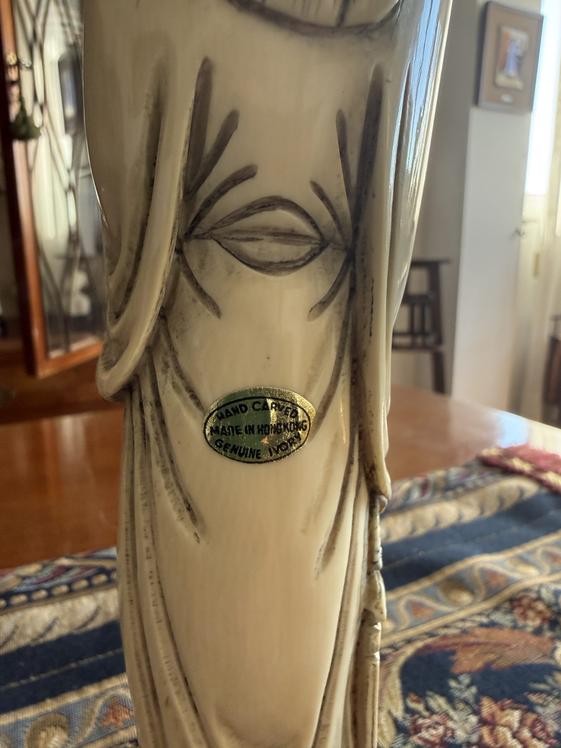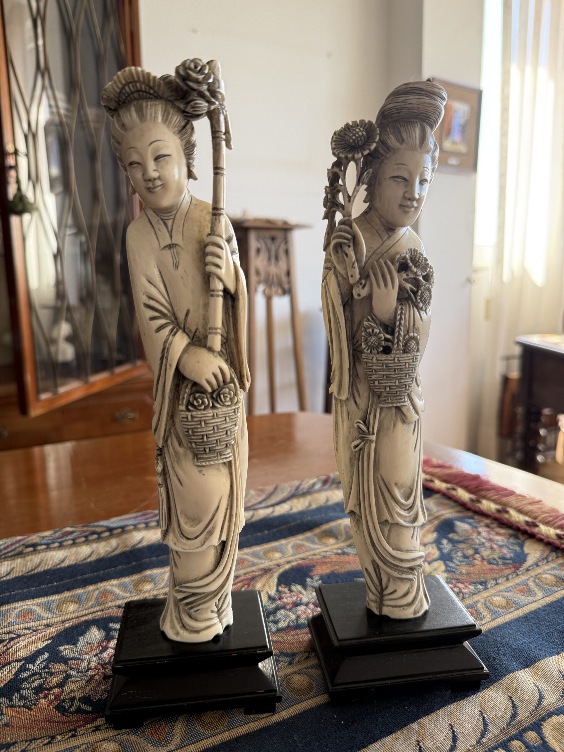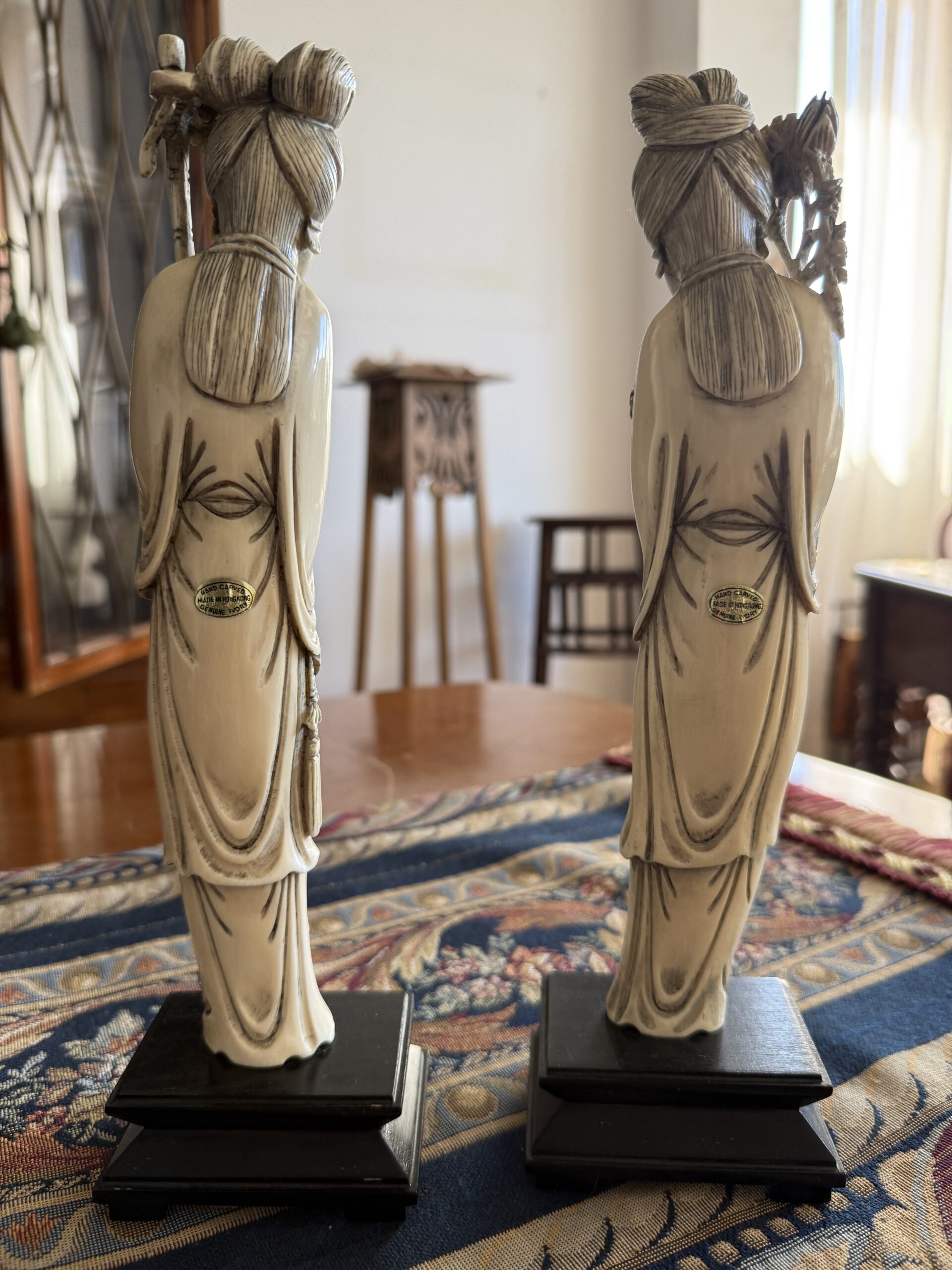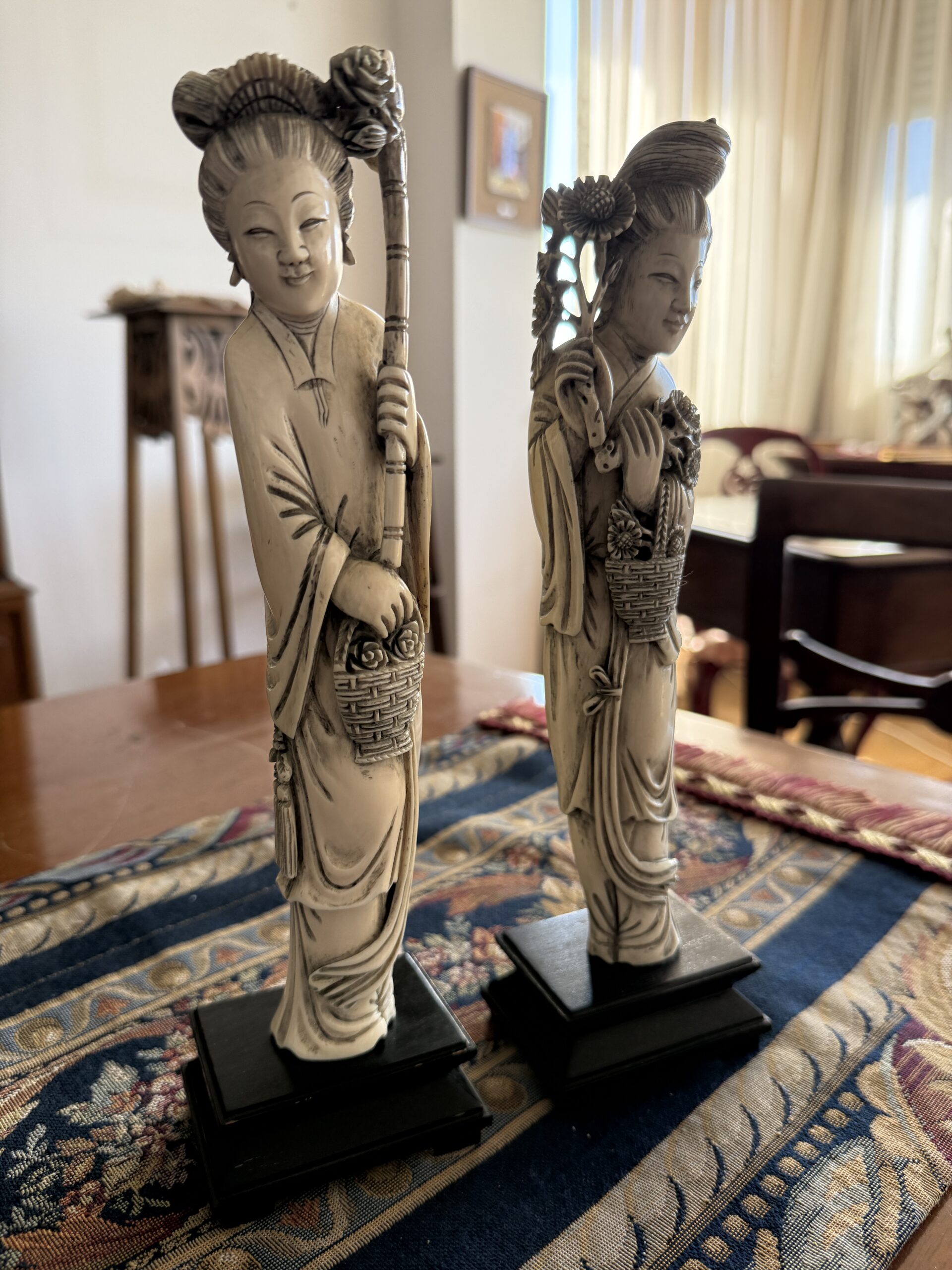 Elegante pareja de figuras de inspiración oriental, finamente talladas en material de acabado marfil que resalta cada detalle con gran delicadeza. Representan dos figuras femeninas con vestimenta tradicional, portando flores y cestas, transmitiendo armonía y serenidad. Las líneas suaves y el nivel de detalle en los rostros y pliegues aportan una estética refinada y atemporal. Se presentan sobre bases oscuras que contrastan y realzan su presencia decorativa. Ideales para vitrinas, estanterías o espacios donde se busque un toque clásico y distinguido.