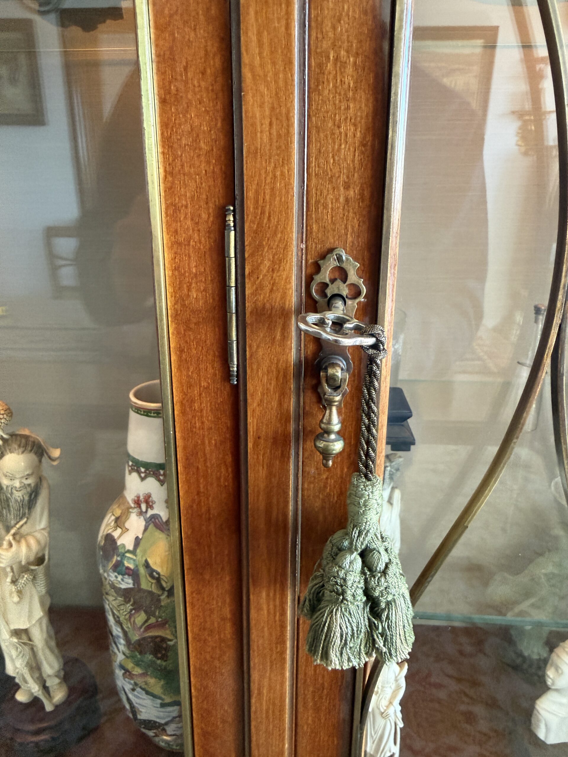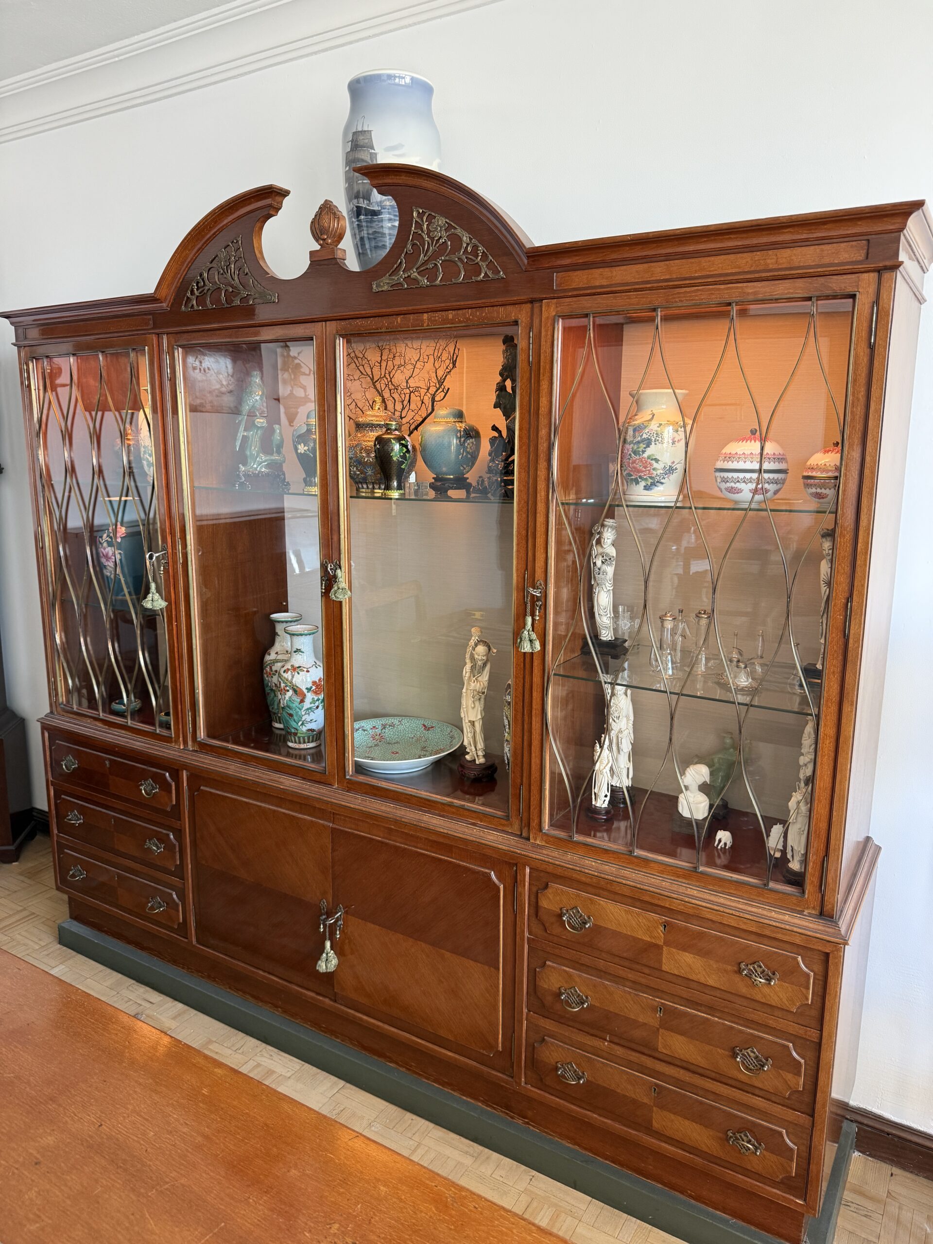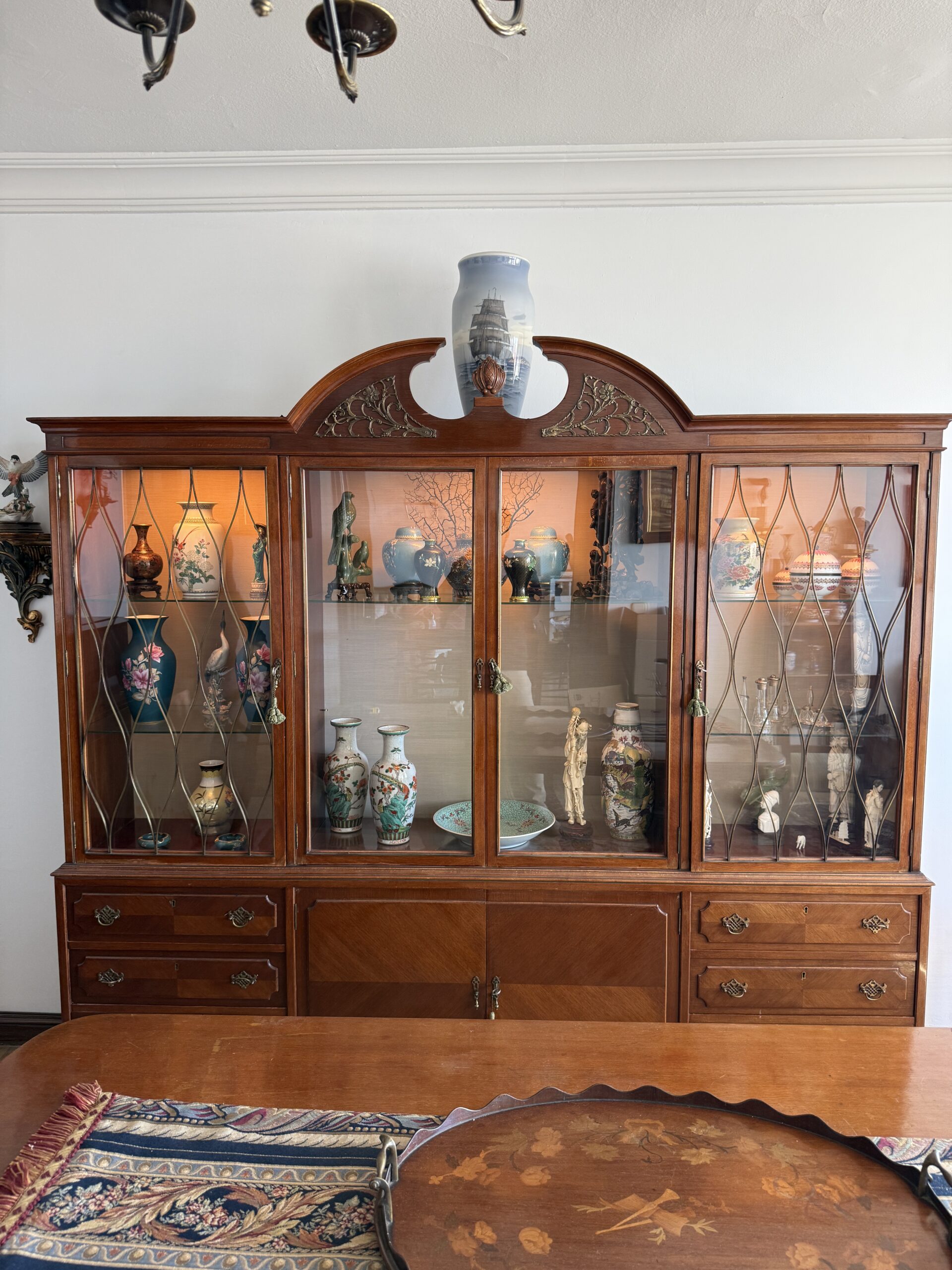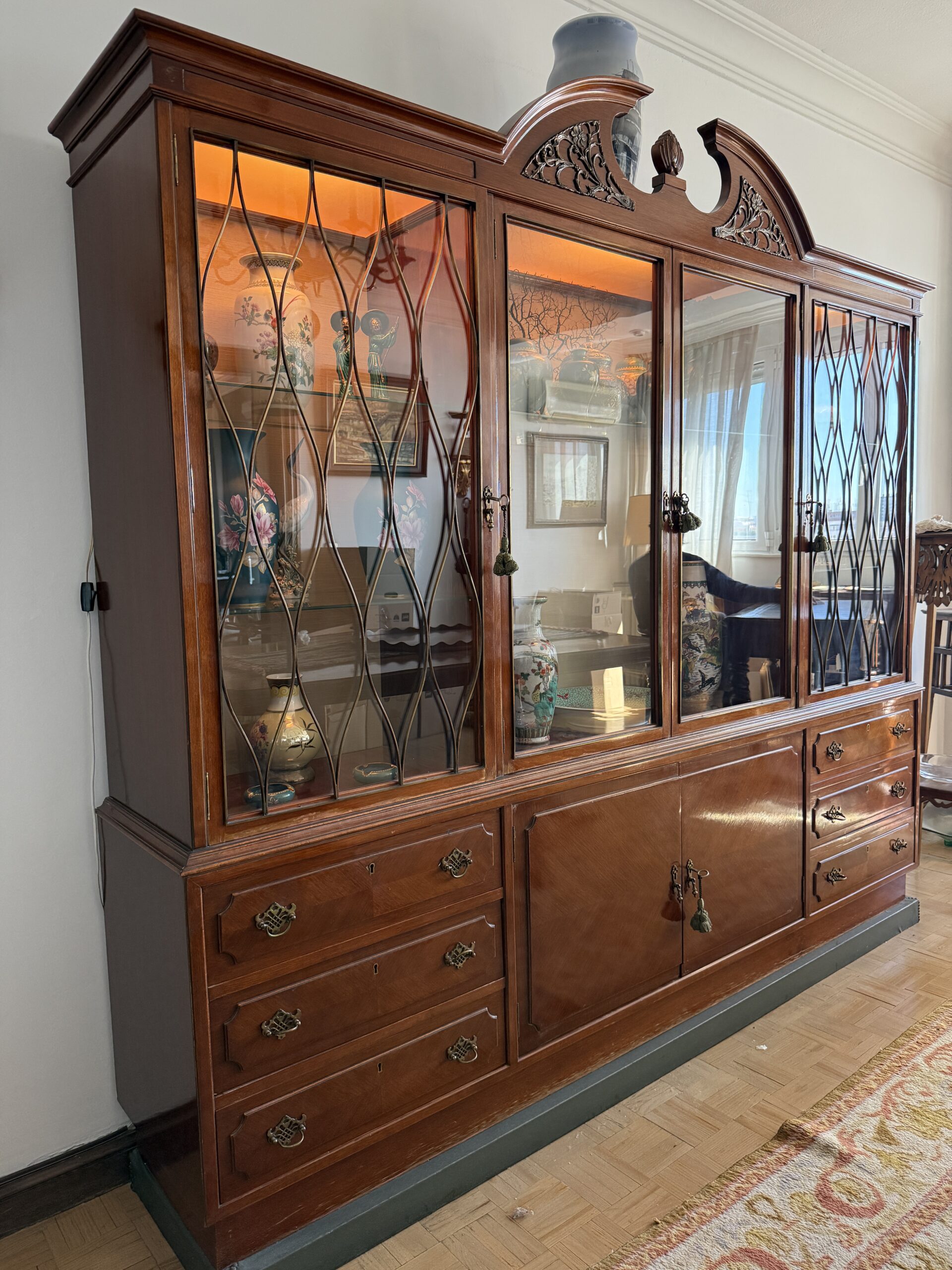 Elegante vitrina de gran formato en madera maciza con acabado cálido y vetas visibles que realzan su carácter atemporal. Su diseño incorpora puertas acristaladas con entramado decorativo, ideales para exhibir piezas con distinción y protegerlas del polvo. La parte superior presenta un remate curvo con detalles tallados que aportan sofisticación y presencia. Dispone de amplios estantes interiores y cajoneras inferiores que combinan funcionalidad y estética.
